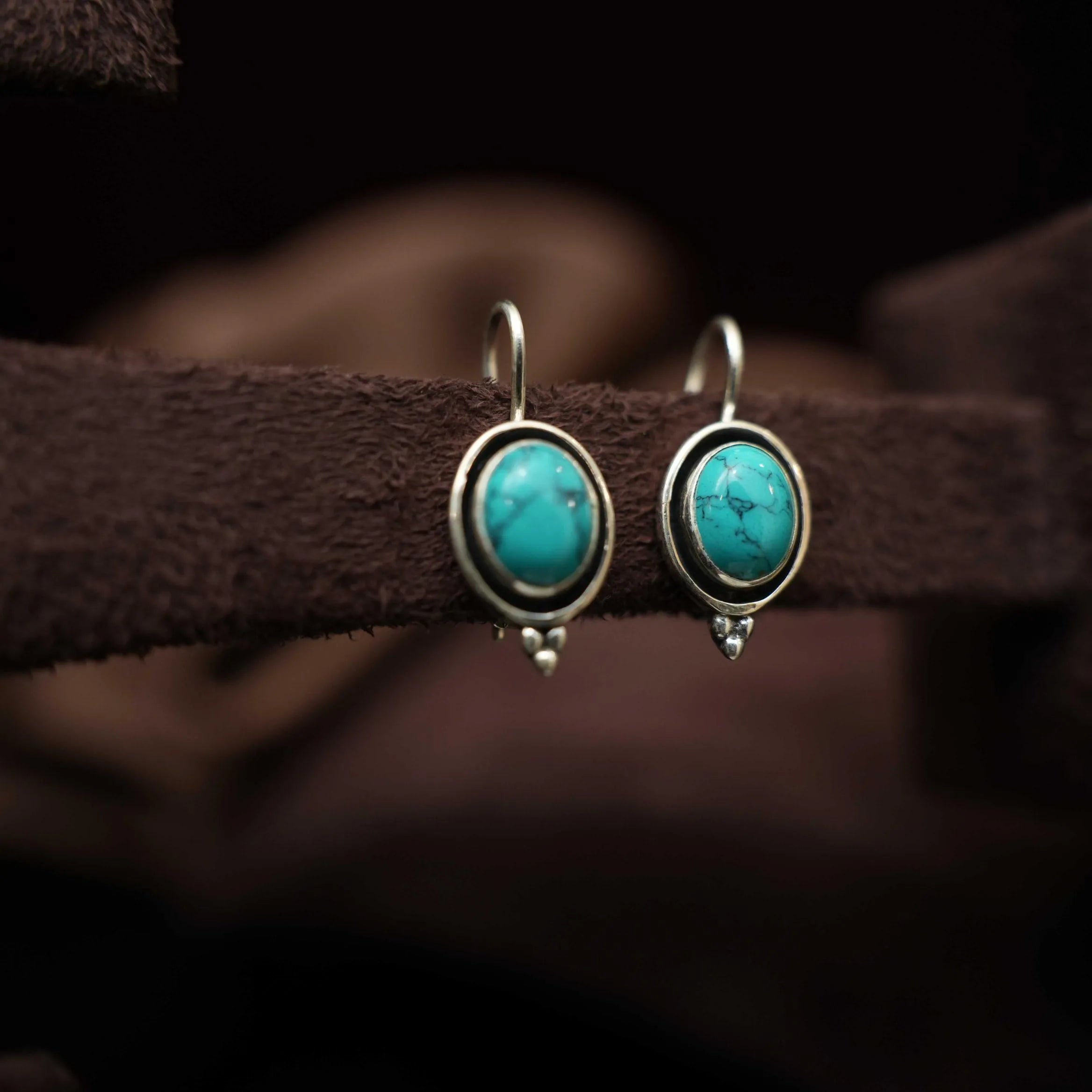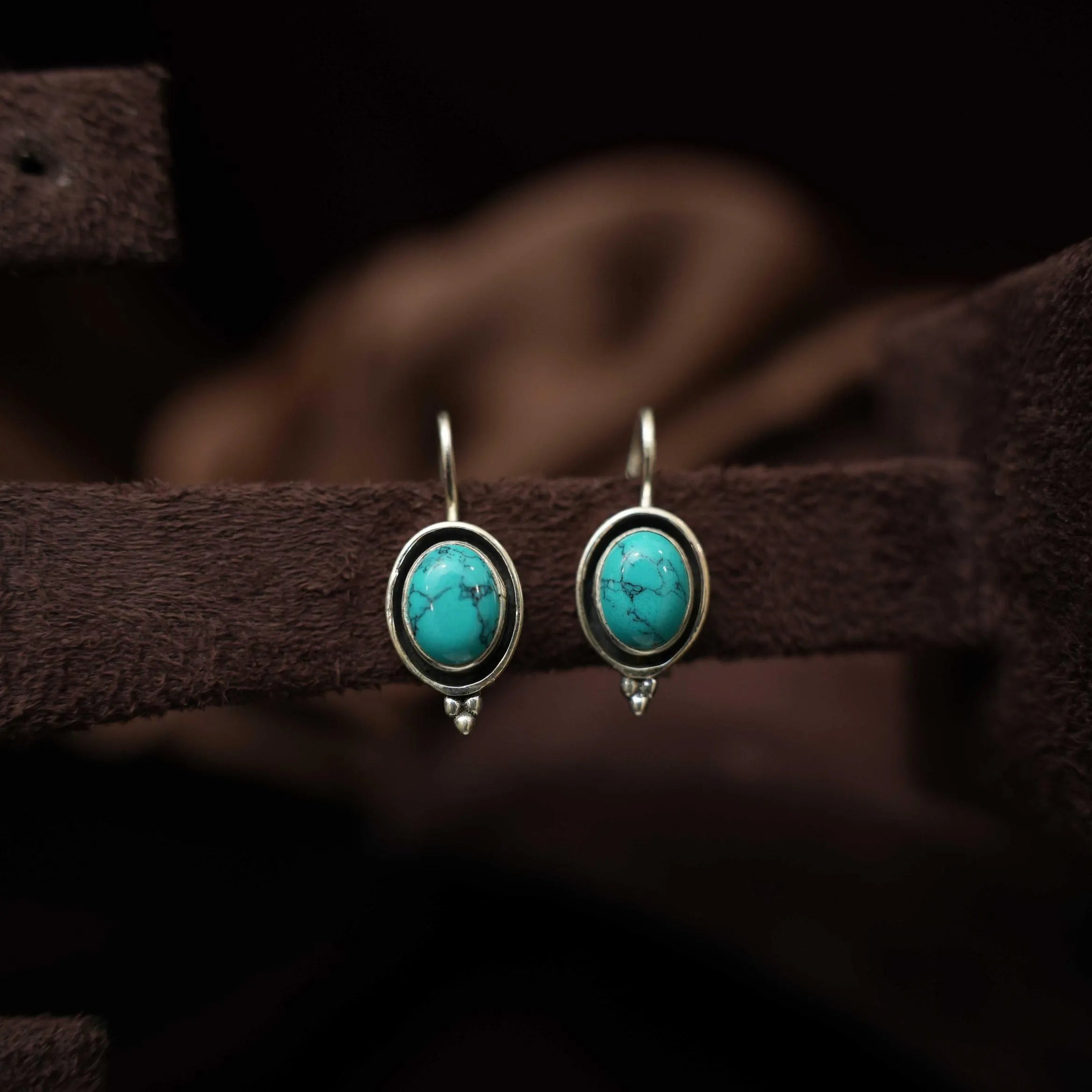 A beautiful silver oxidsed hoop earring studded with turquoise stones.