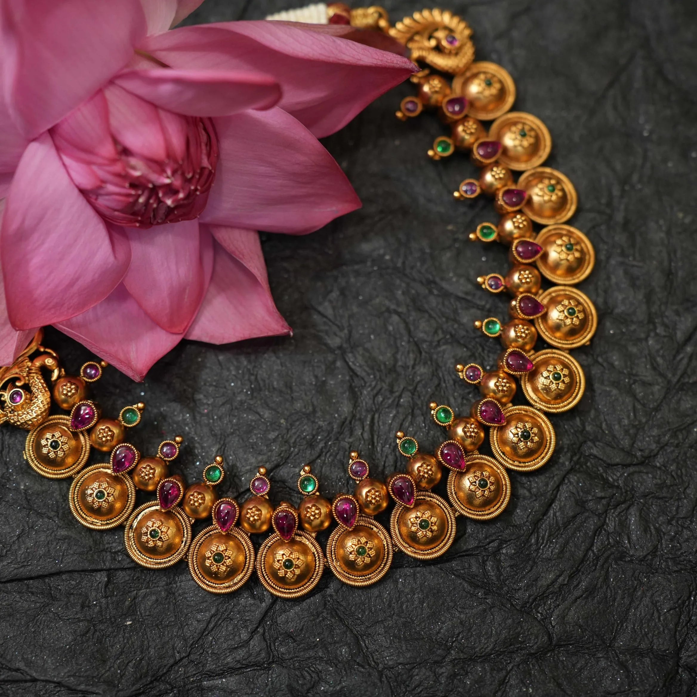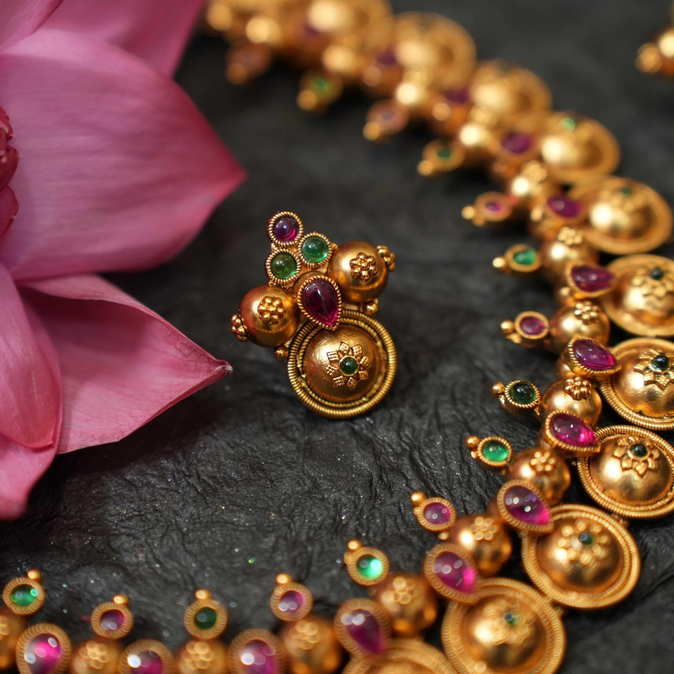 An elegant antique necklace in geometrical motif studded with kemp stones. This set comes with a pair of earrings.