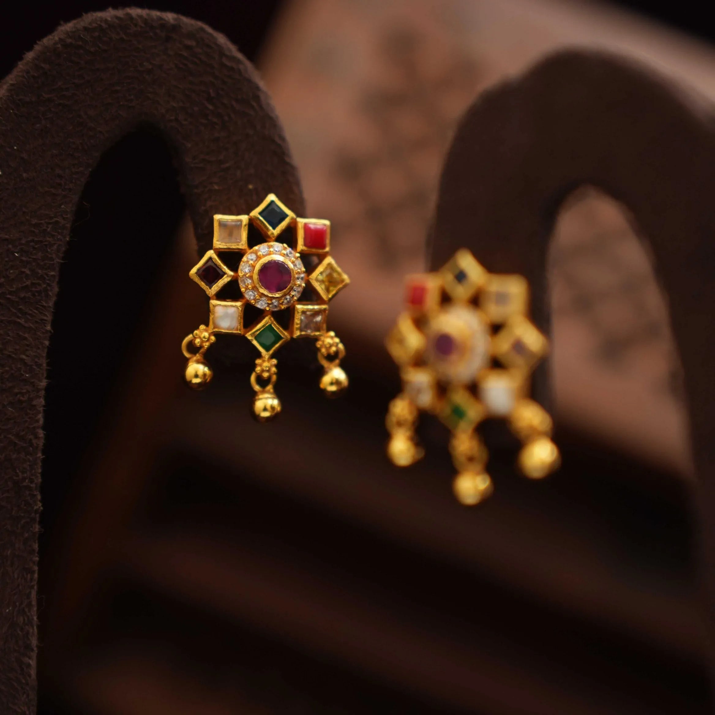 A regal silver earrings studded with navaratna stones highlighted by golden balls.