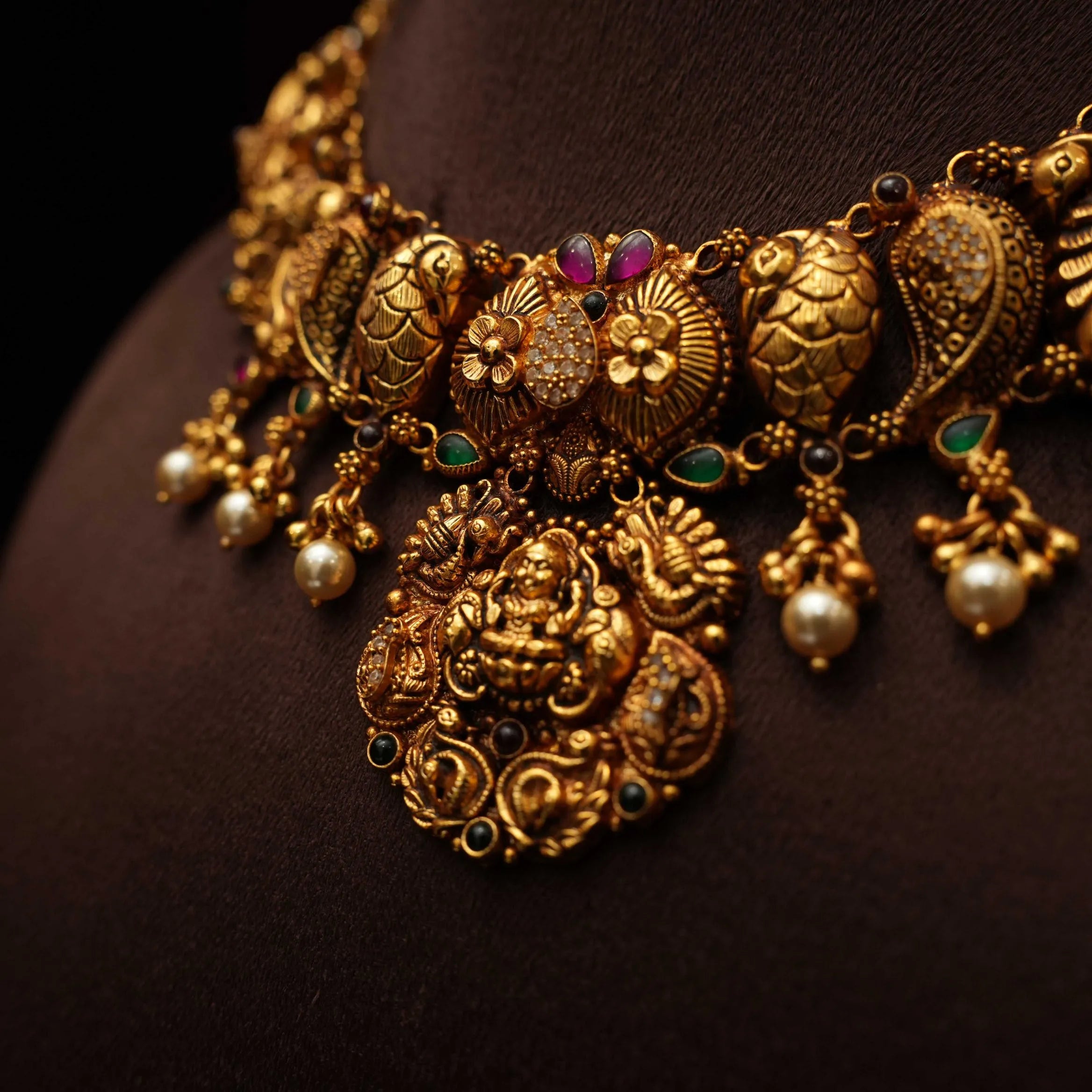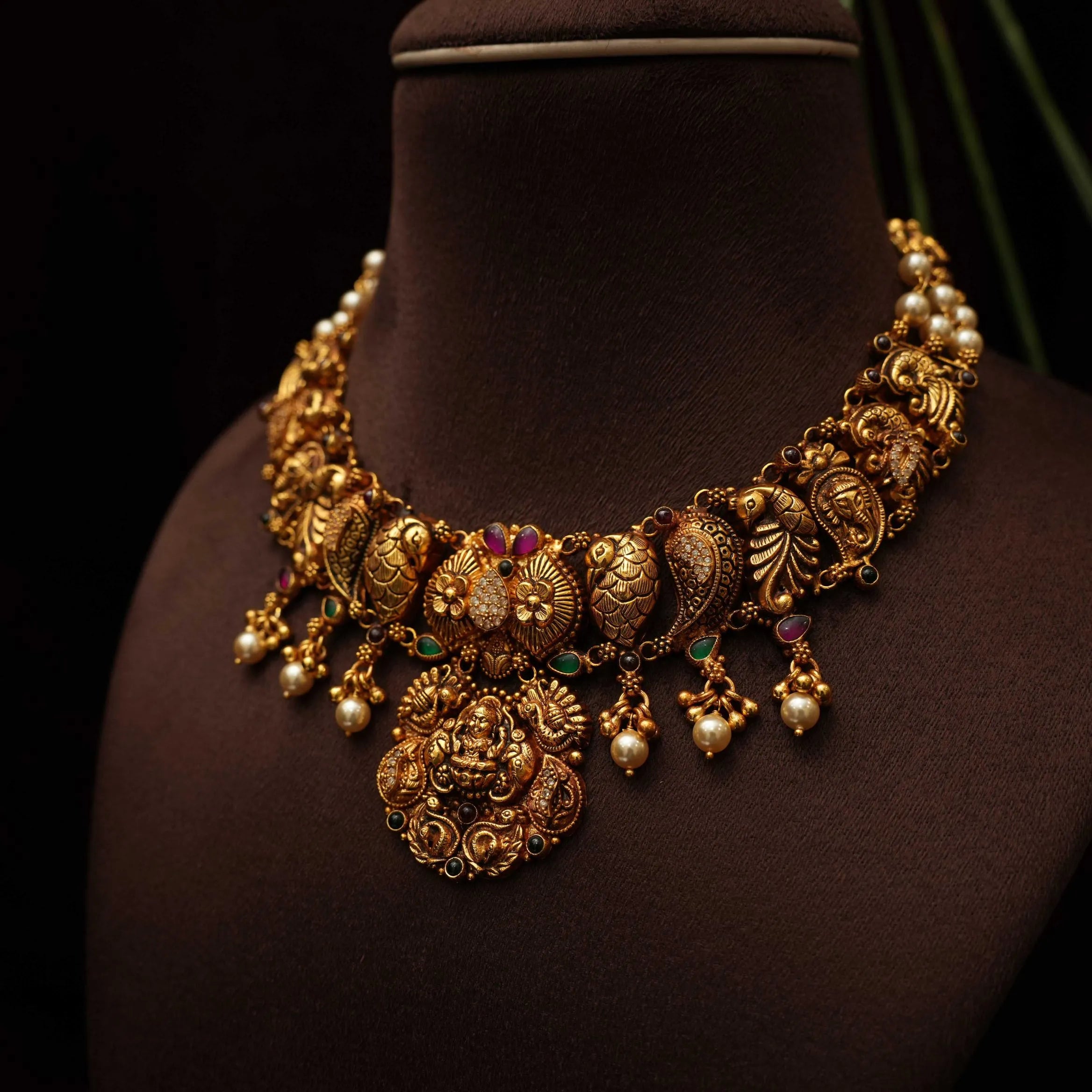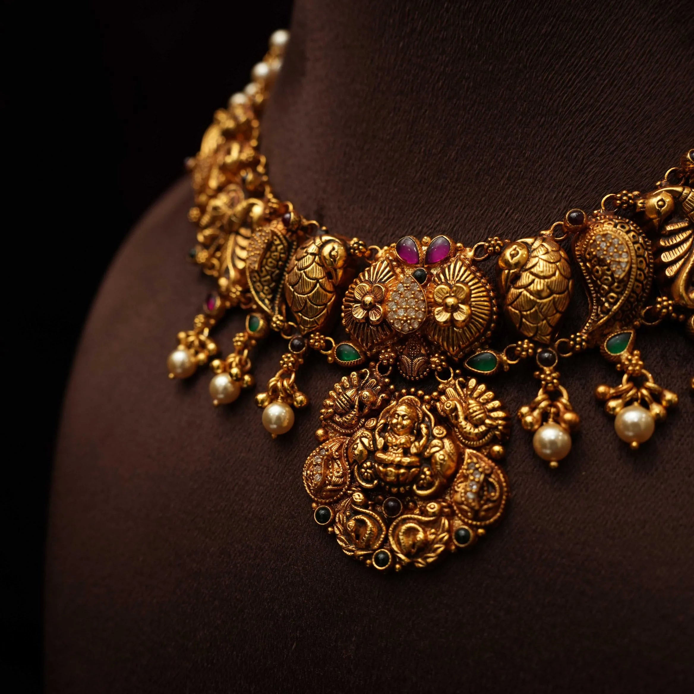 A stunning silver necklace featuring traditional Goddess Lakshmi, floral, and peacock motifs, beautifully highlighted with pearls and stones. Finely crafted with intricate detailing and finished in the signature Nagas finish, this piece exudes timeless elegance and cultural richness. Perfect for festive occasions, weddings, and special celebrations.