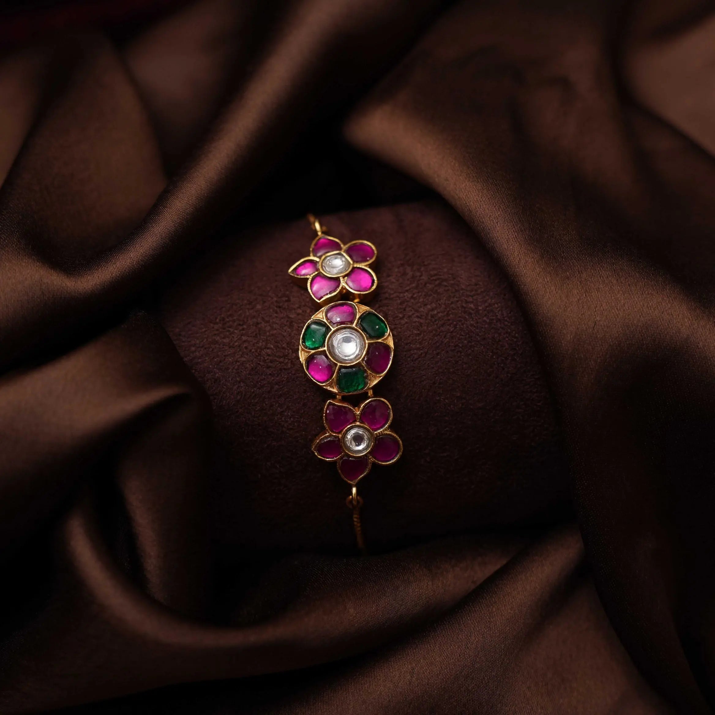 A classic silver bracelet in floral motif studded with multicolor stones.