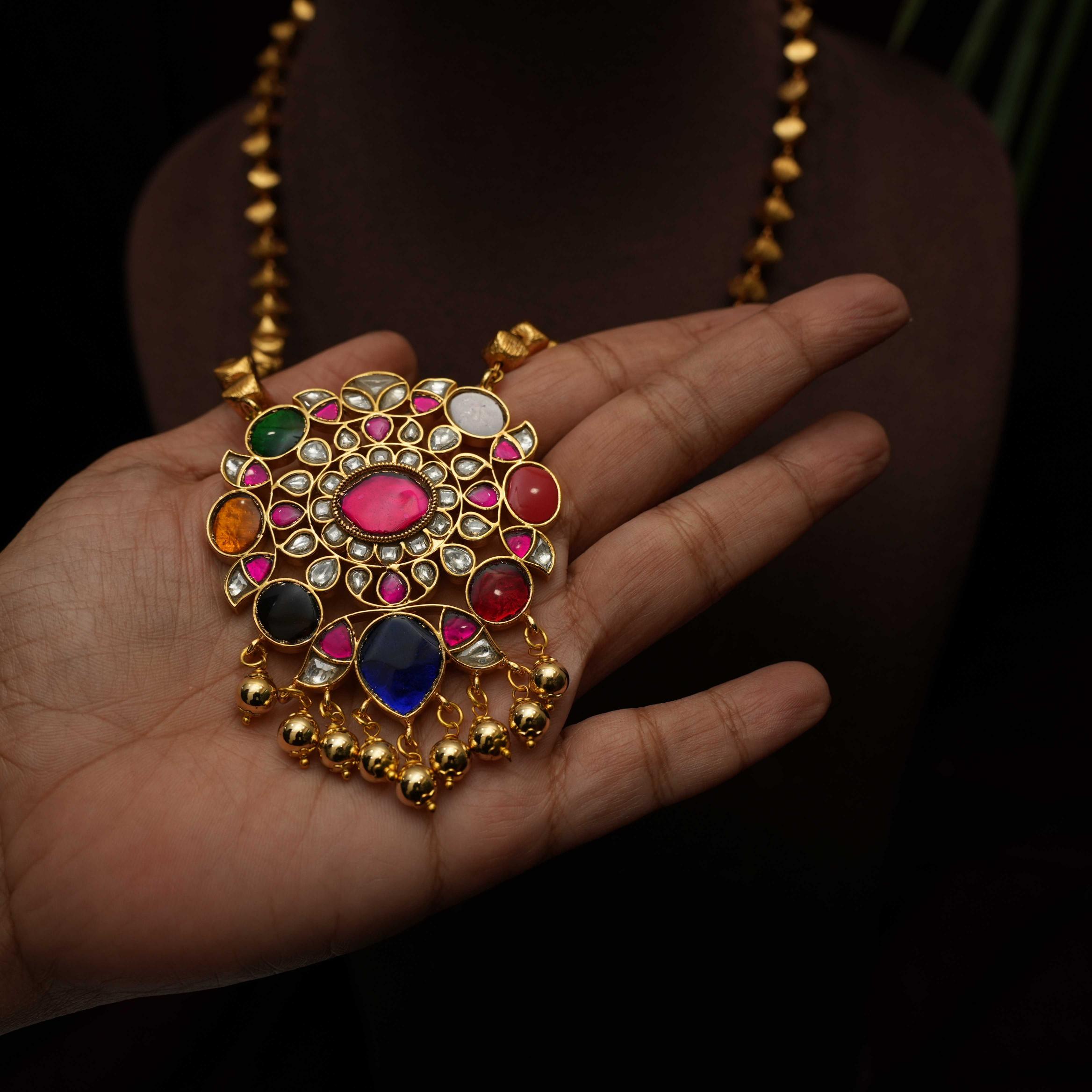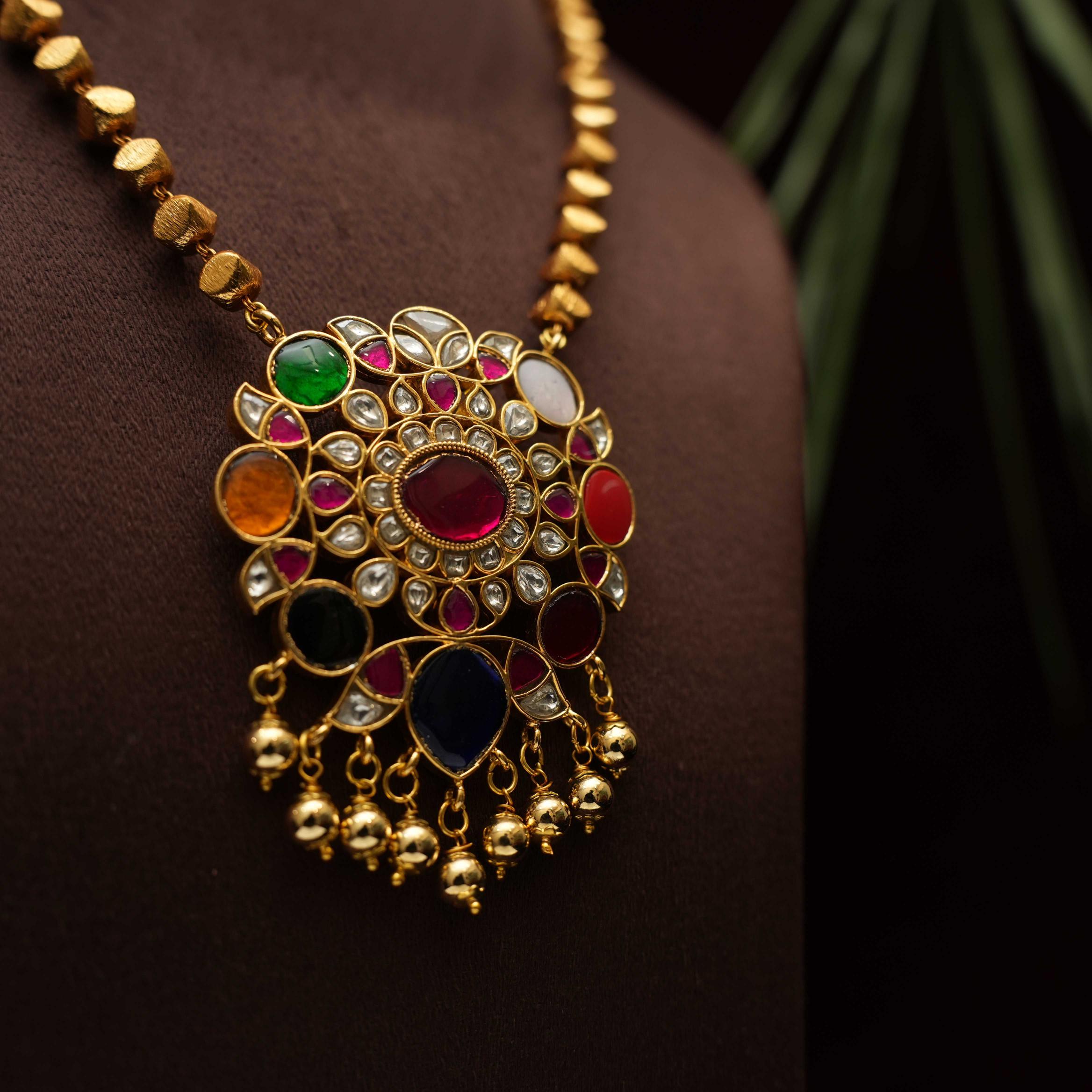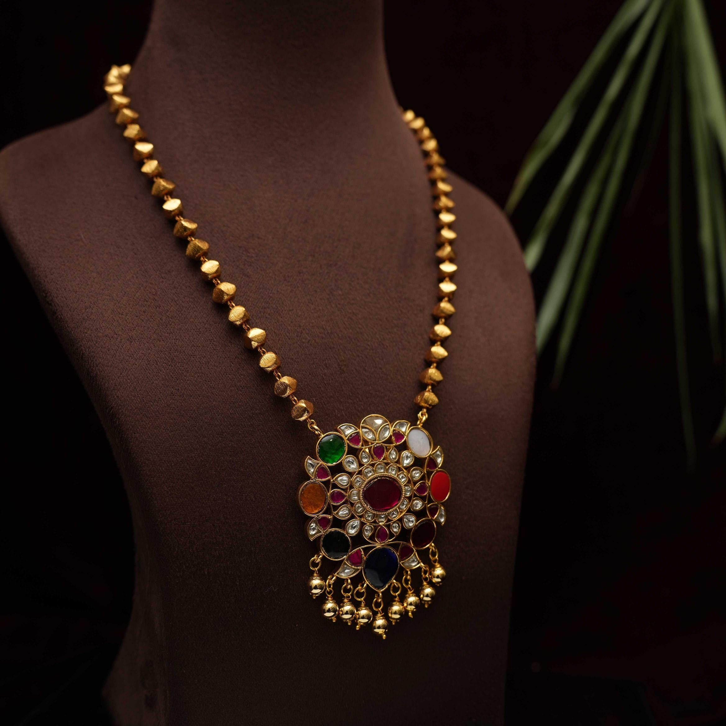 This exquisite Navaratna necklace features a beautifully crafted antique-finish pendant adorned with nine vibrant stones, each symbolising prosperity, protection, and harmony. The pendant is paired with a uniquely designed gold-finish beaded chain, giving the piece a rich traditional appeal. Handcrafted with meticulous detailing, the necklace blends classic aesthetics with festive elegance, making it perfect for weddings, cultural celebrations, and statement ethnic looks. Lightweight yet premium in appearance, it adds a regal touch to any outfit.