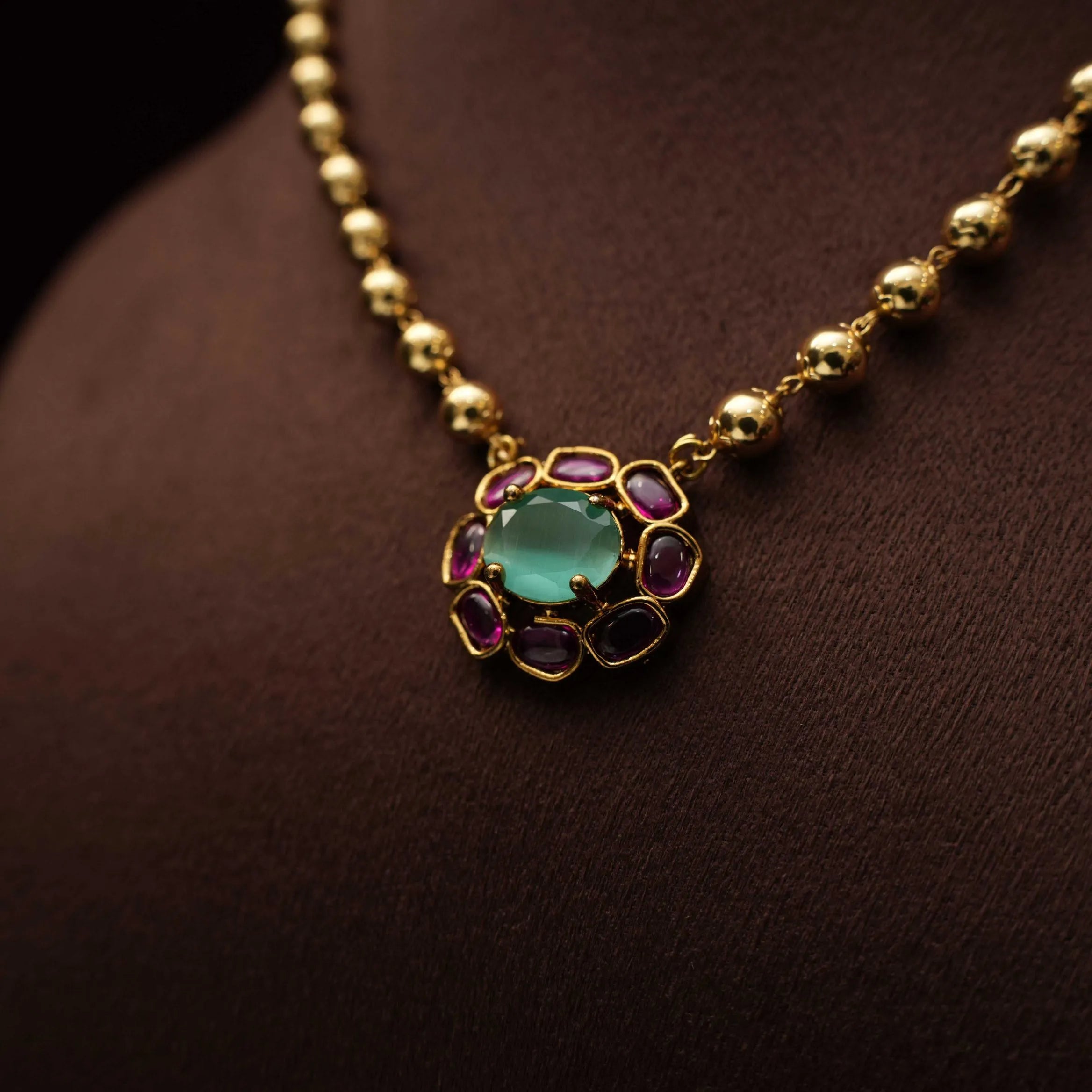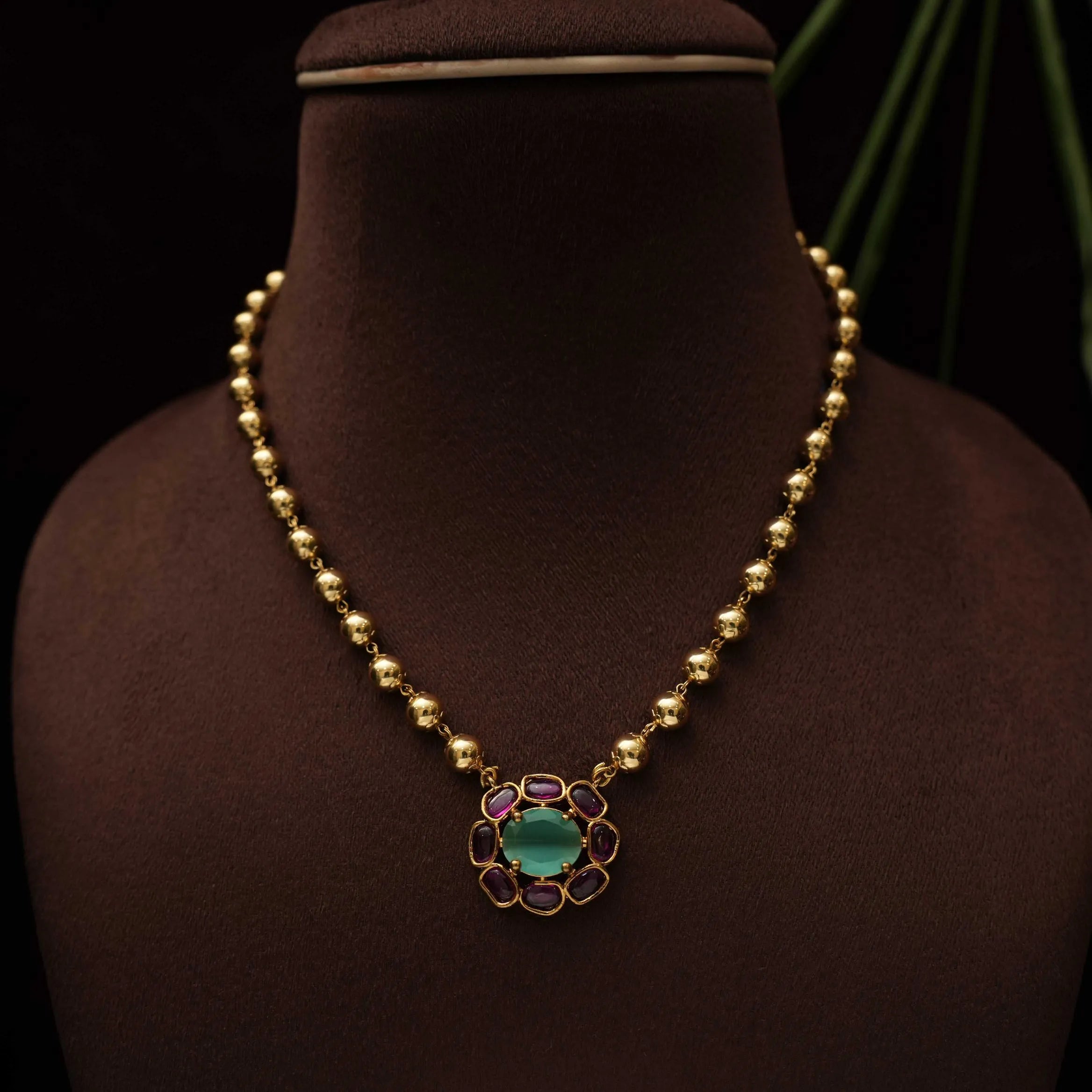 An elegant necklace in golden balls chain paired to floral pendant studded with kemp stones. This set comes with a pair of earrings.