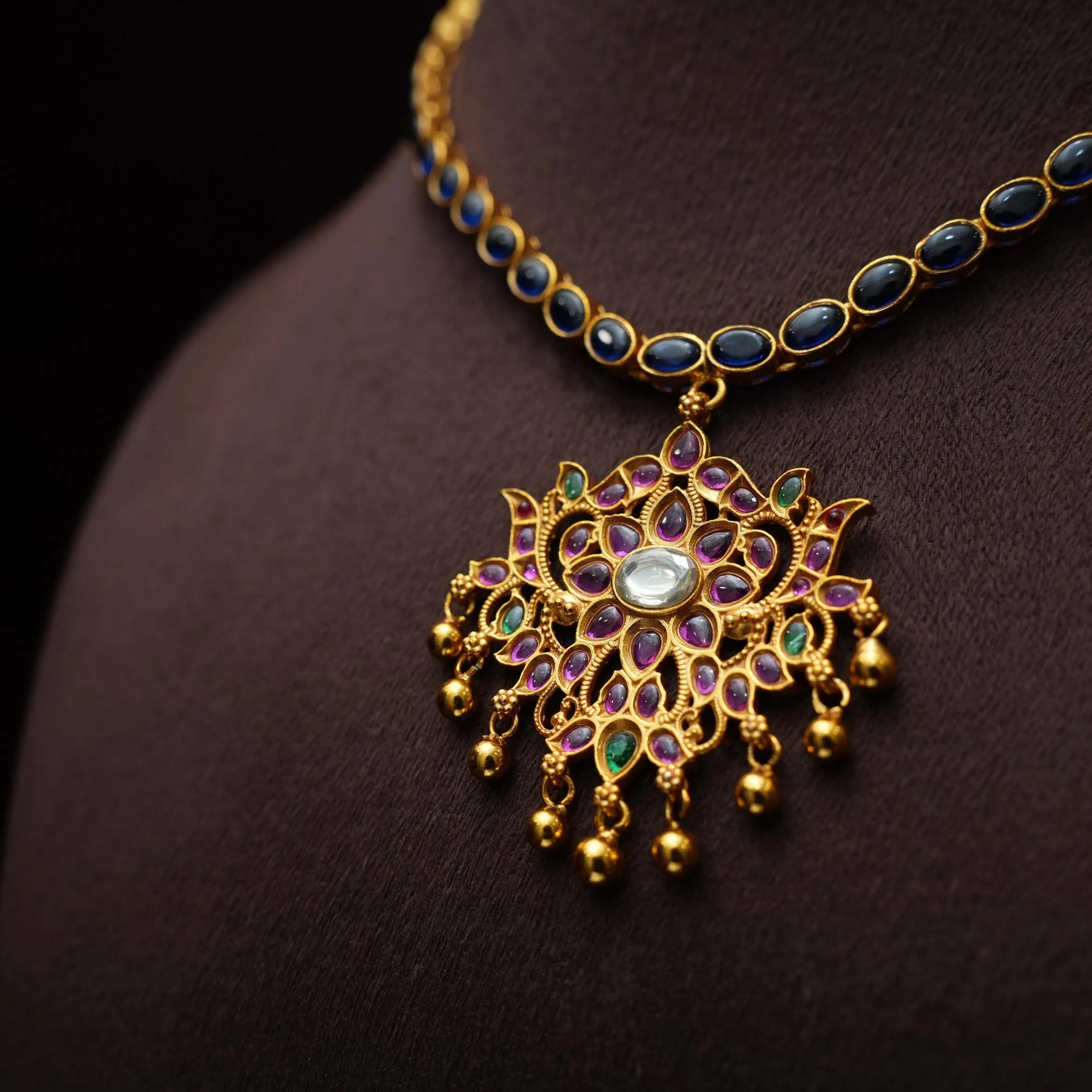 A stunning silver necklace studded with blue kemp stones paired to traditional floral pendant.