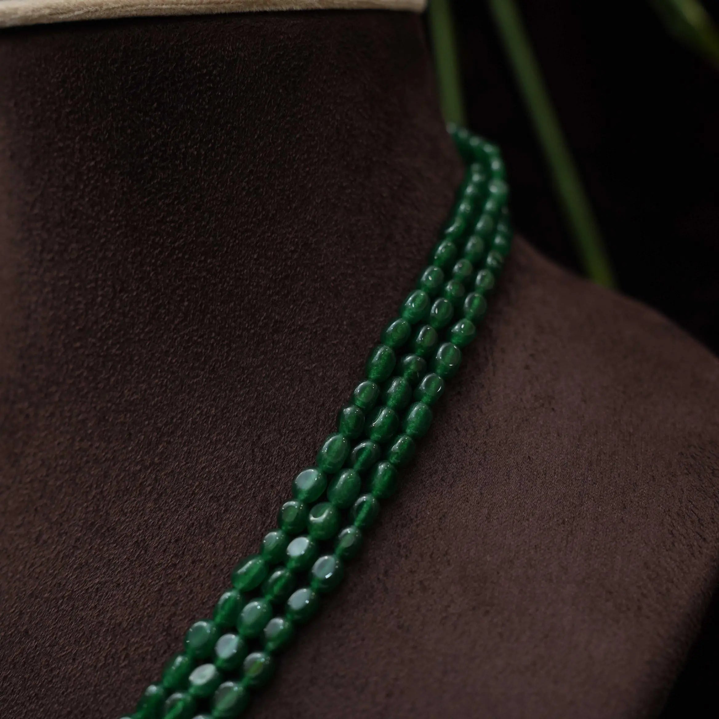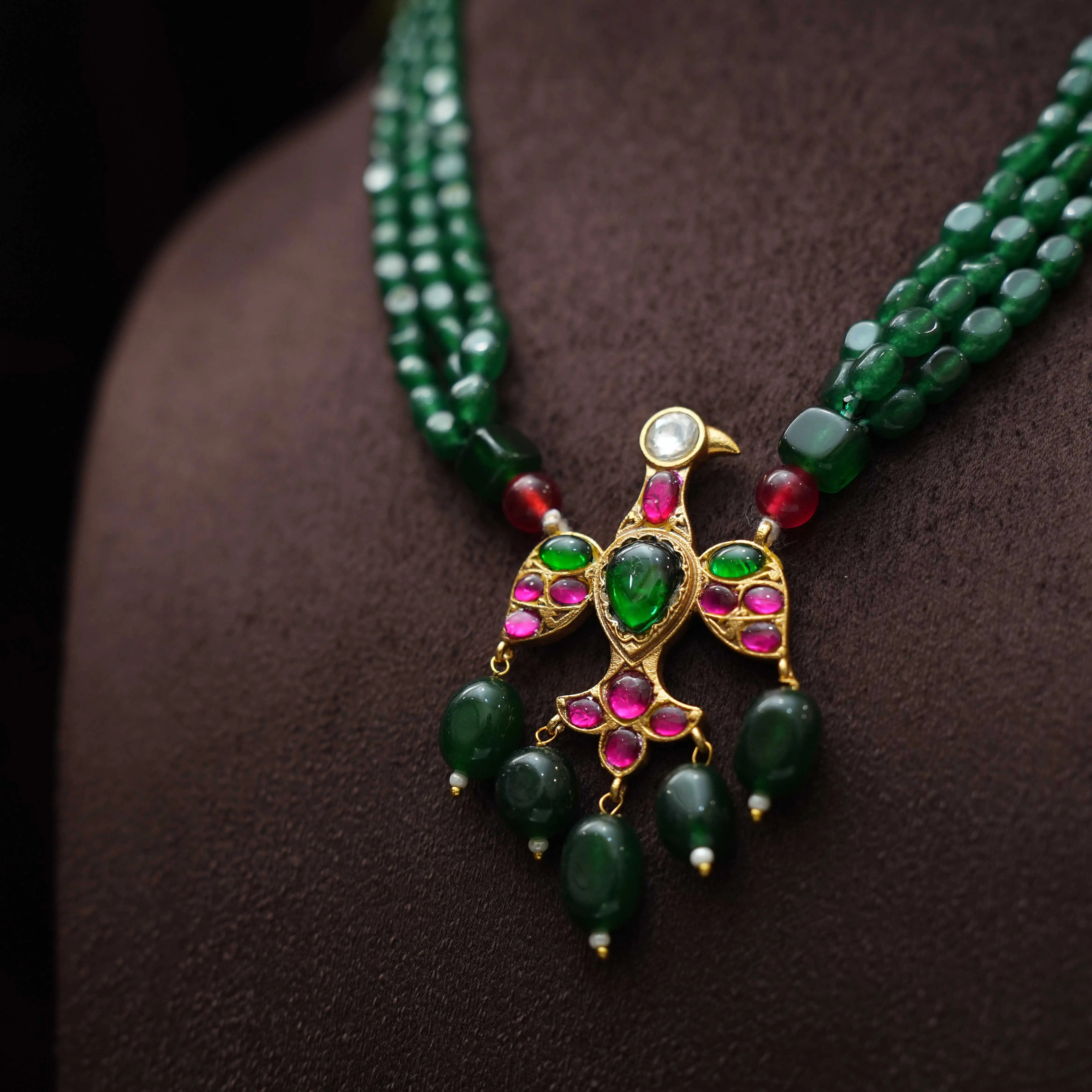 A beautiful and elegant layered necklace handcrafted in green beads paired to iruthalai pakshi motif pendant adorn with beads.