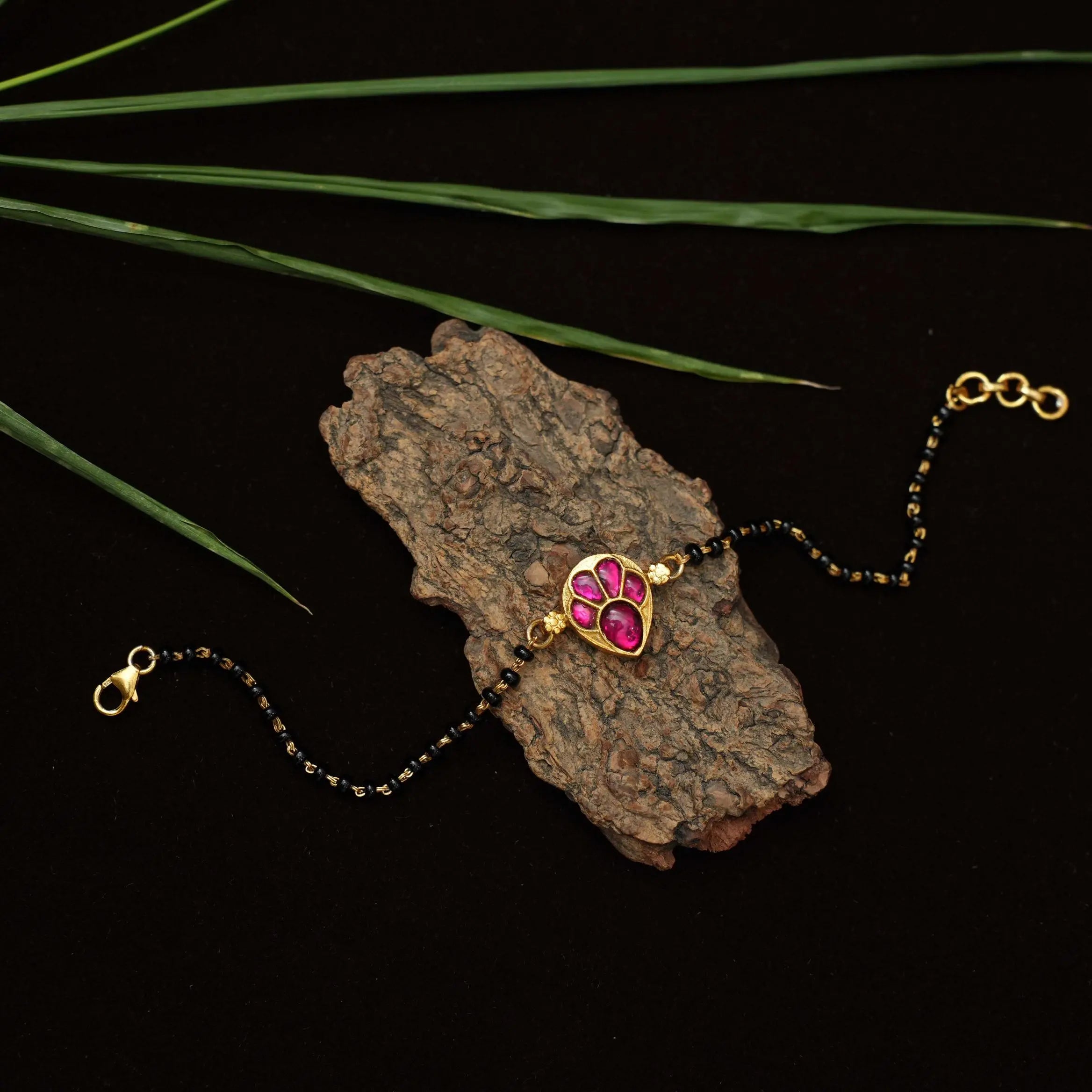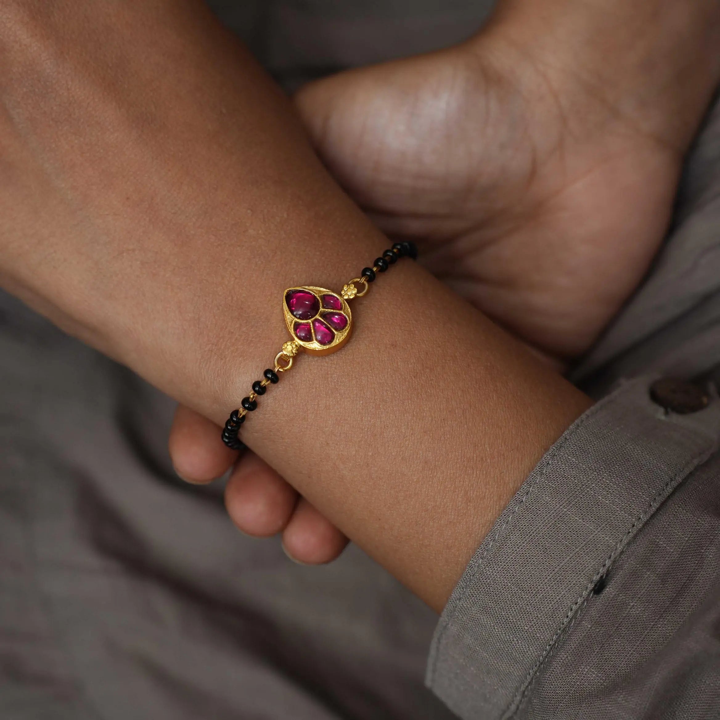 An elegant silver bracelet handcrafted in geometrical motif studded with vibrant red stones paired to black beads.