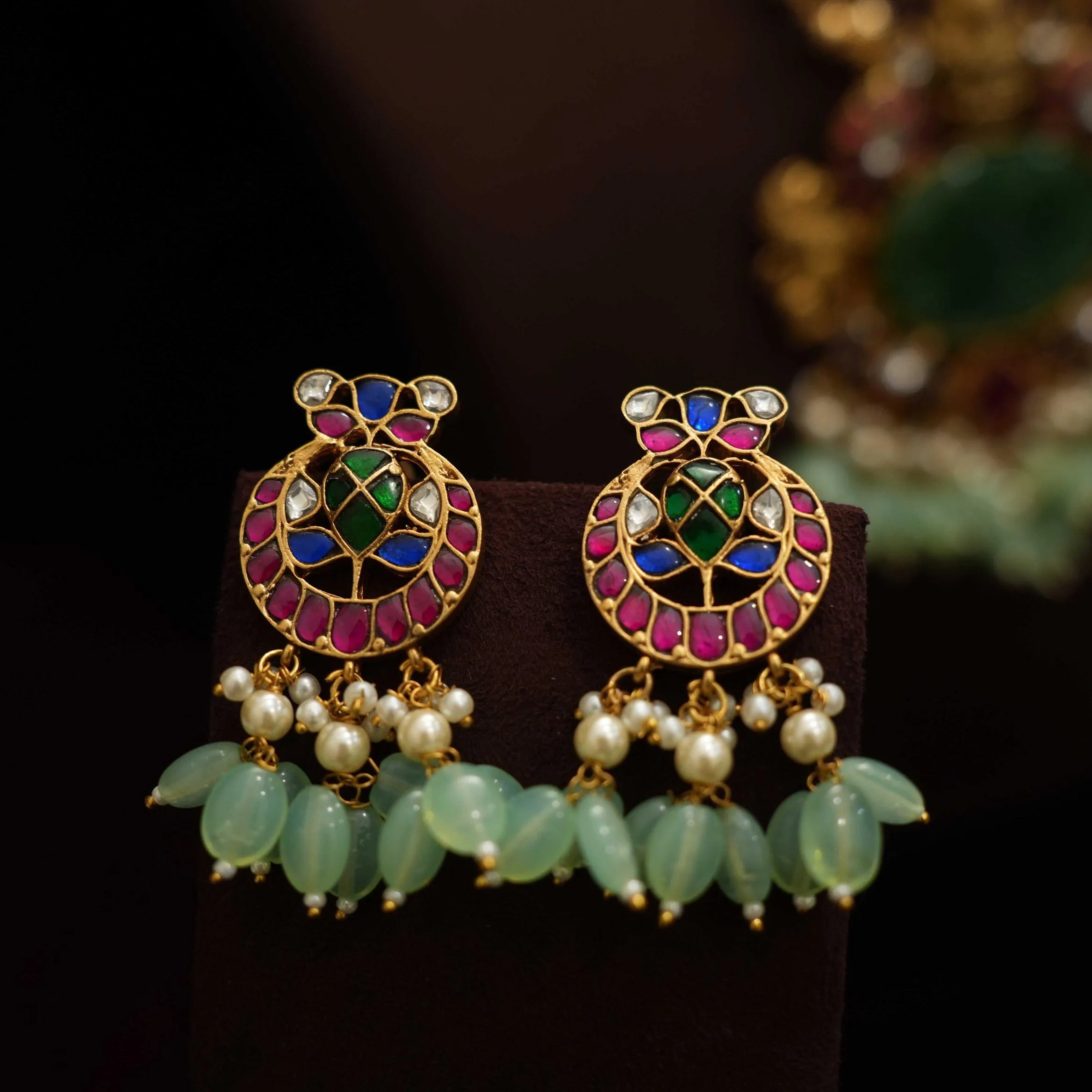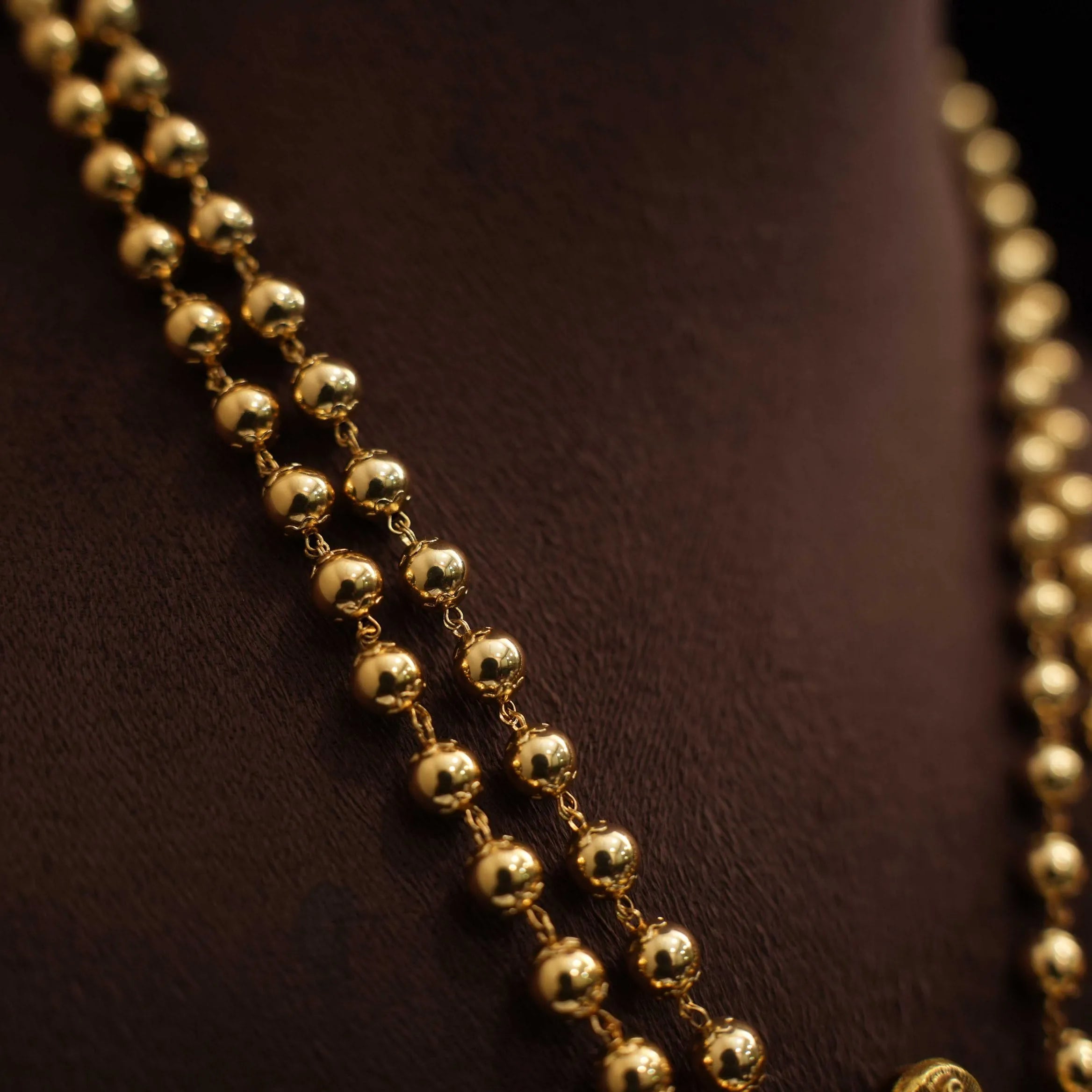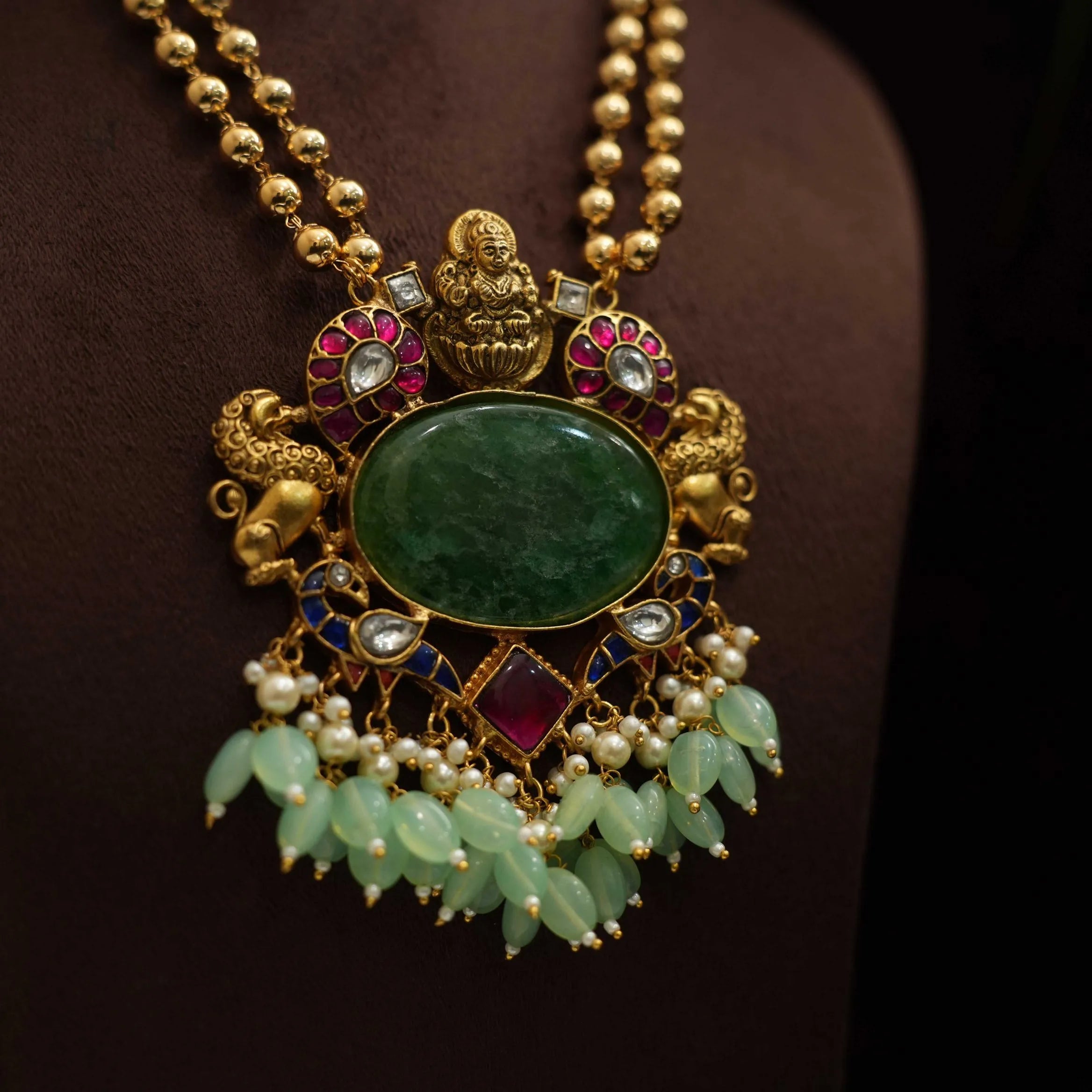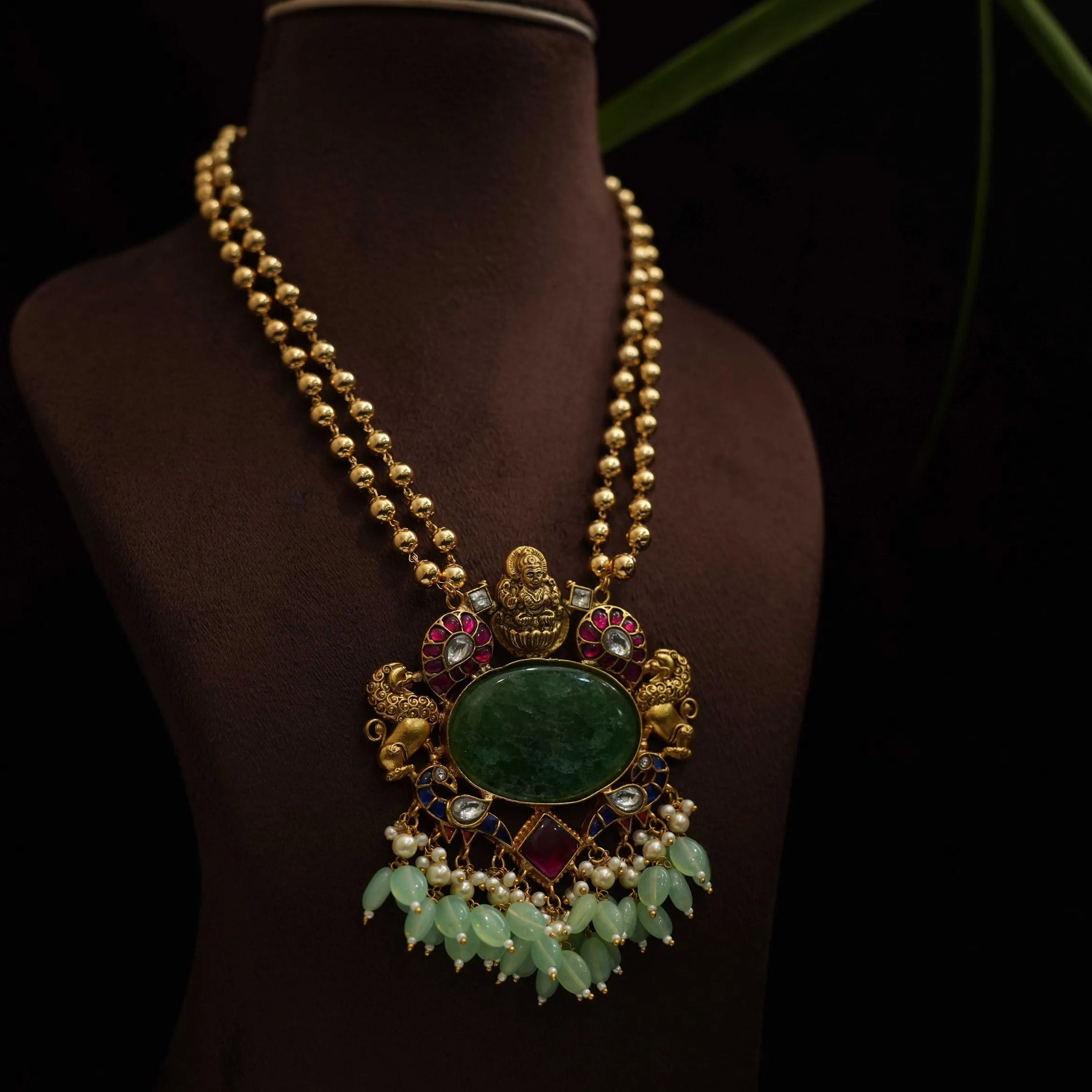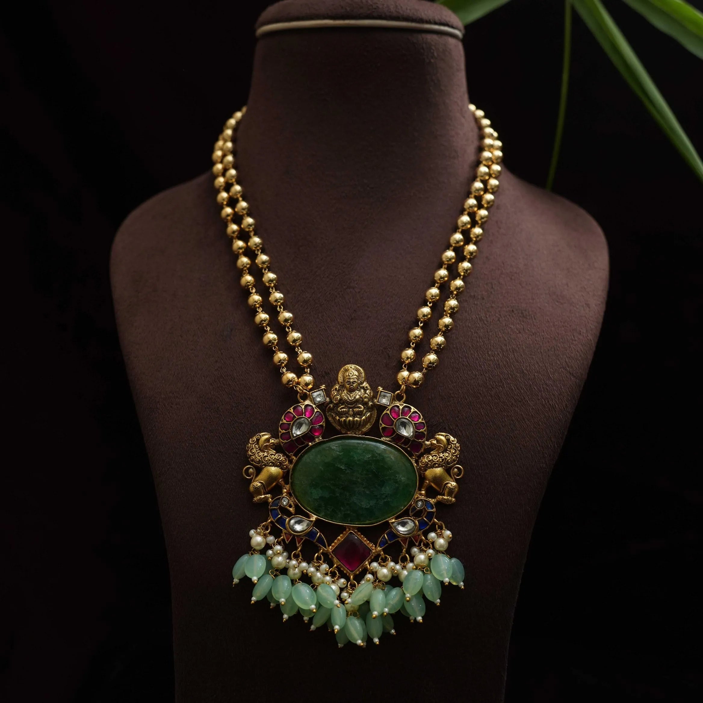 A statement necklace handcrafted in golden balls paired to moon stone traditional pendant adorn with stones, beads & pearls. This set comes with a pair of earrings.