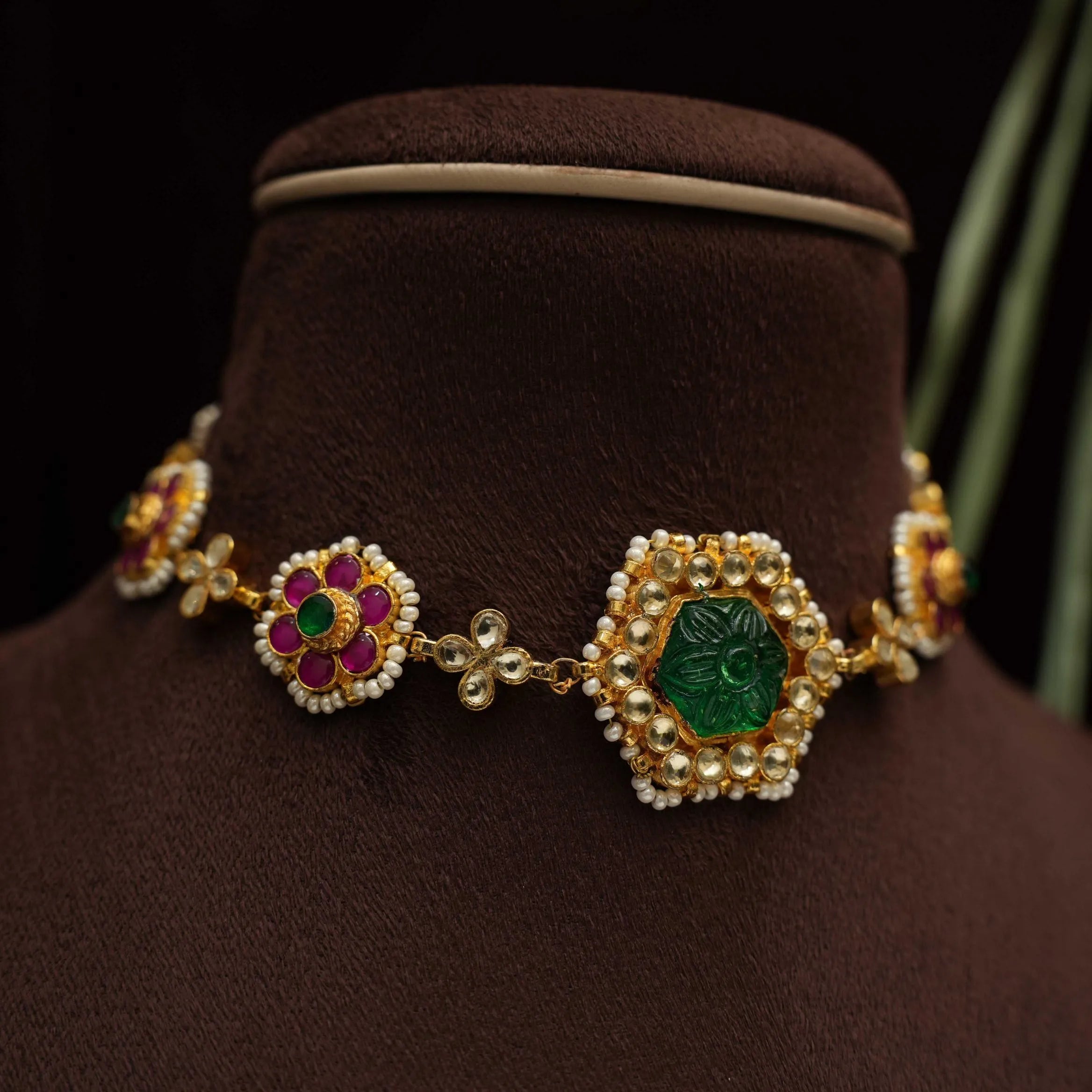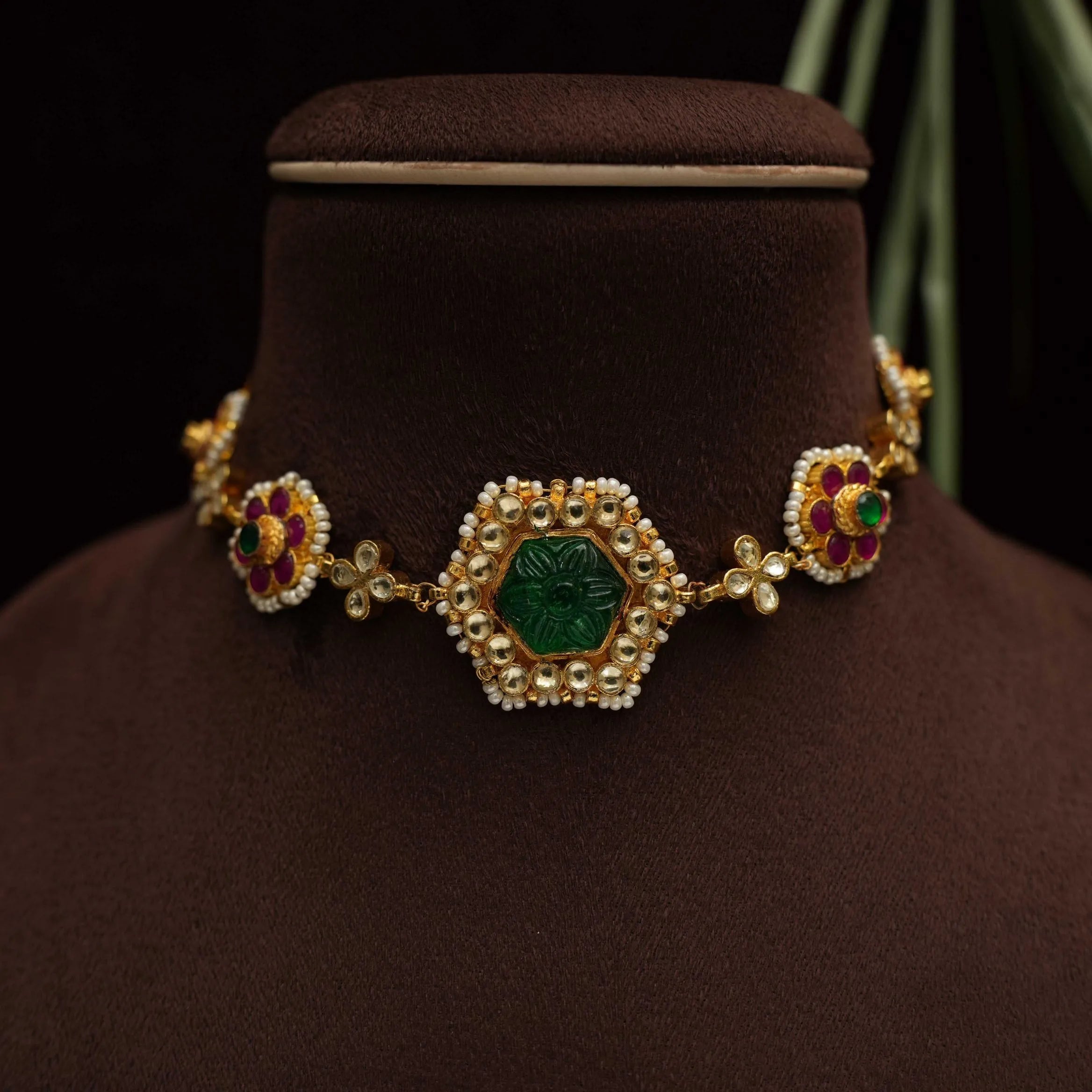 A simple & elegant choker handcrafted with pearls, agate and polki stones.
