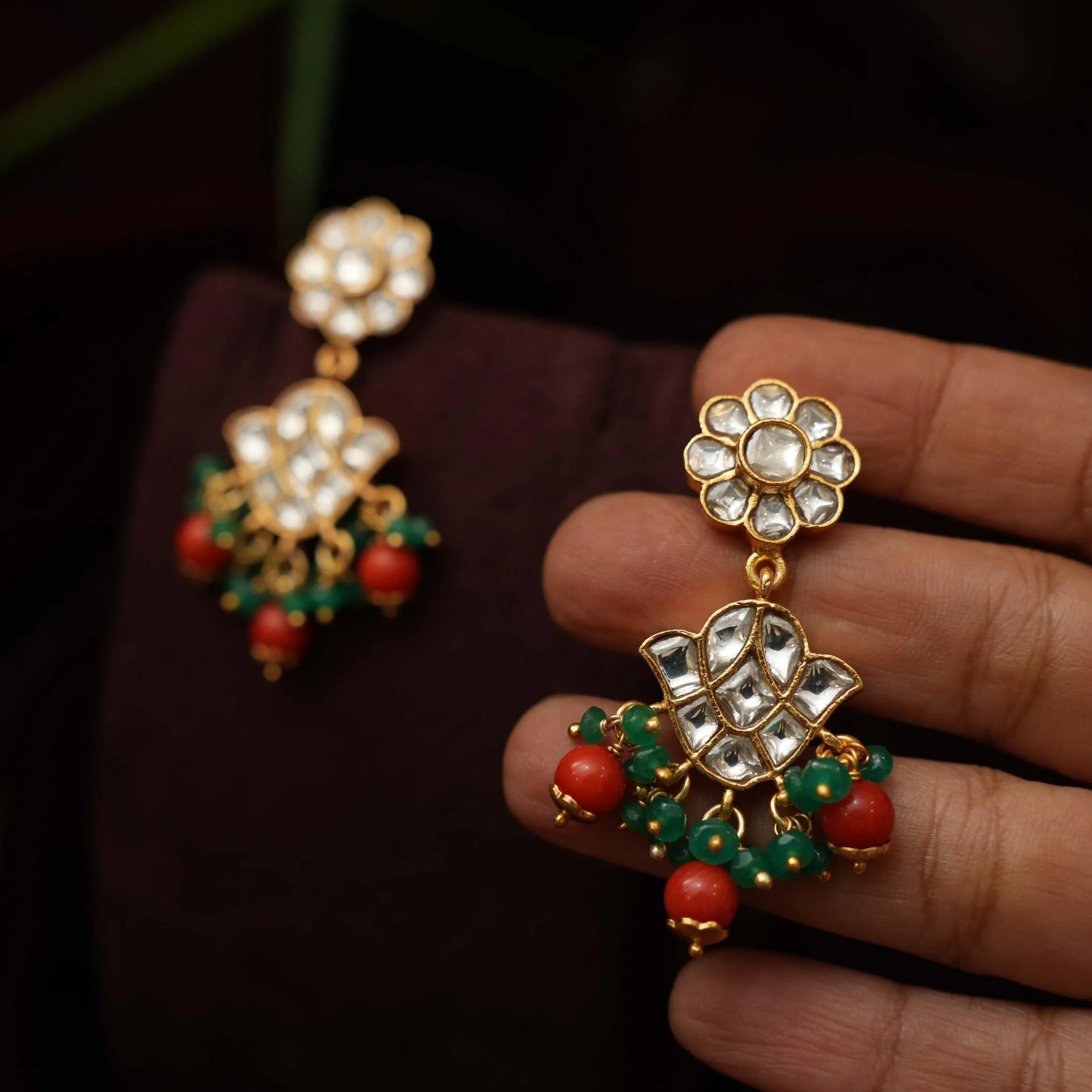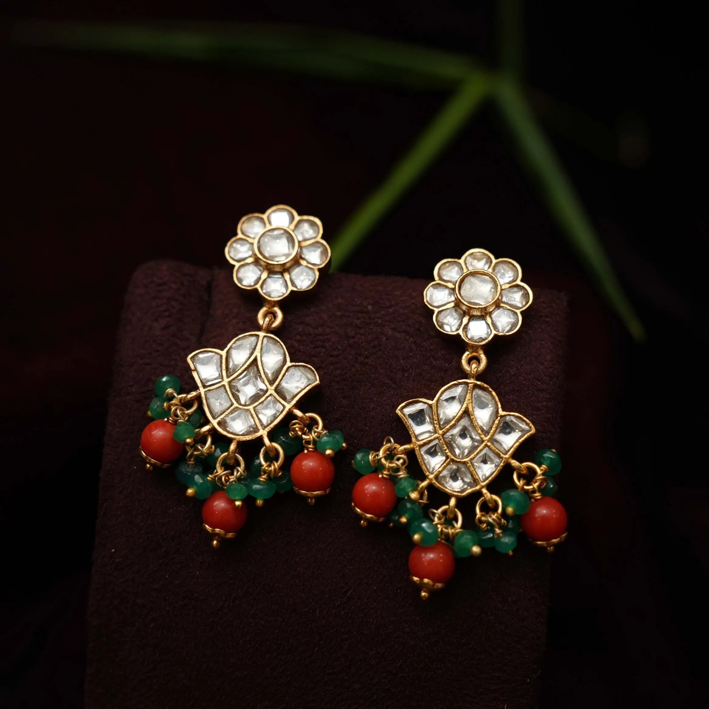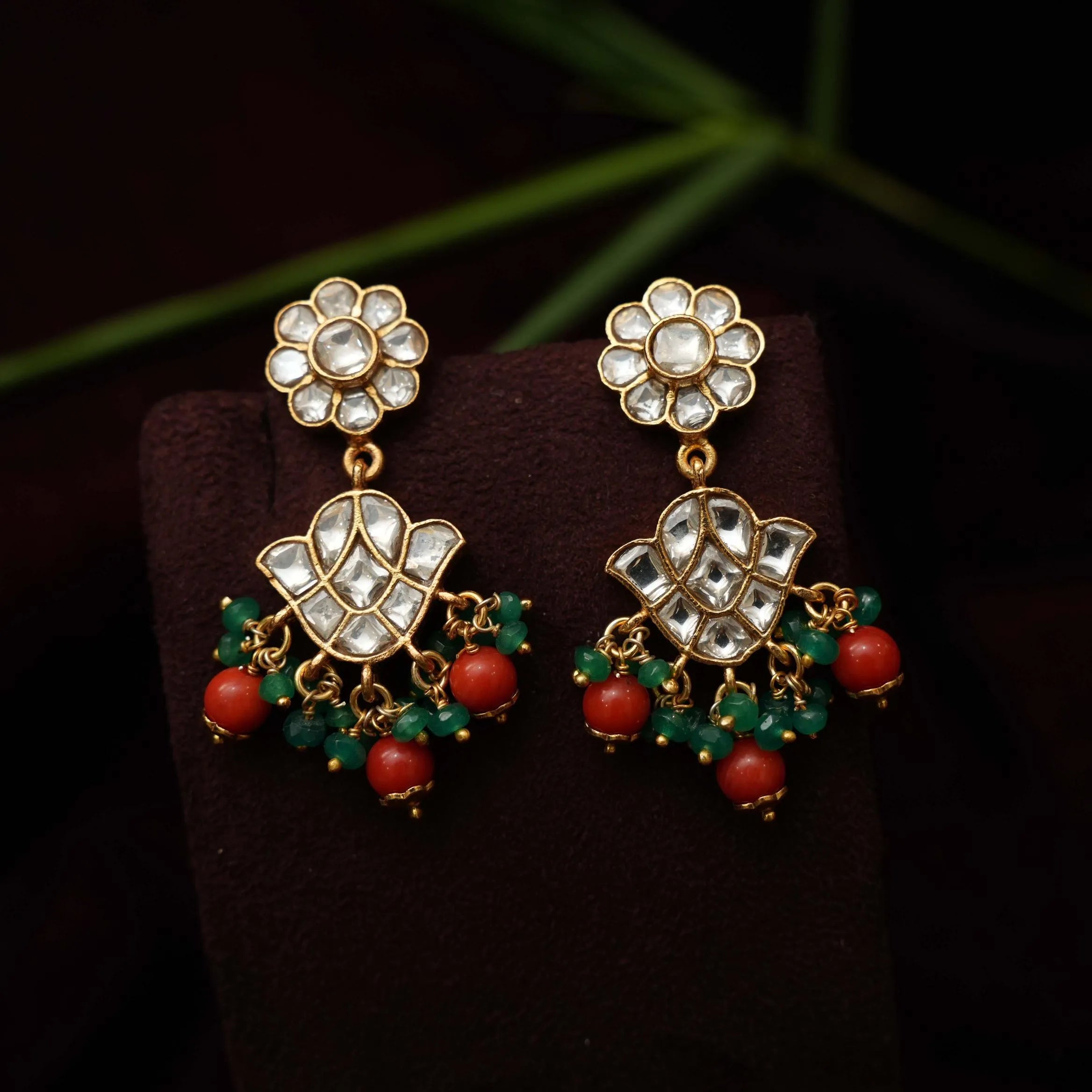 A regal silver designer earrings in floral motif studded with stones, green beads & coral.