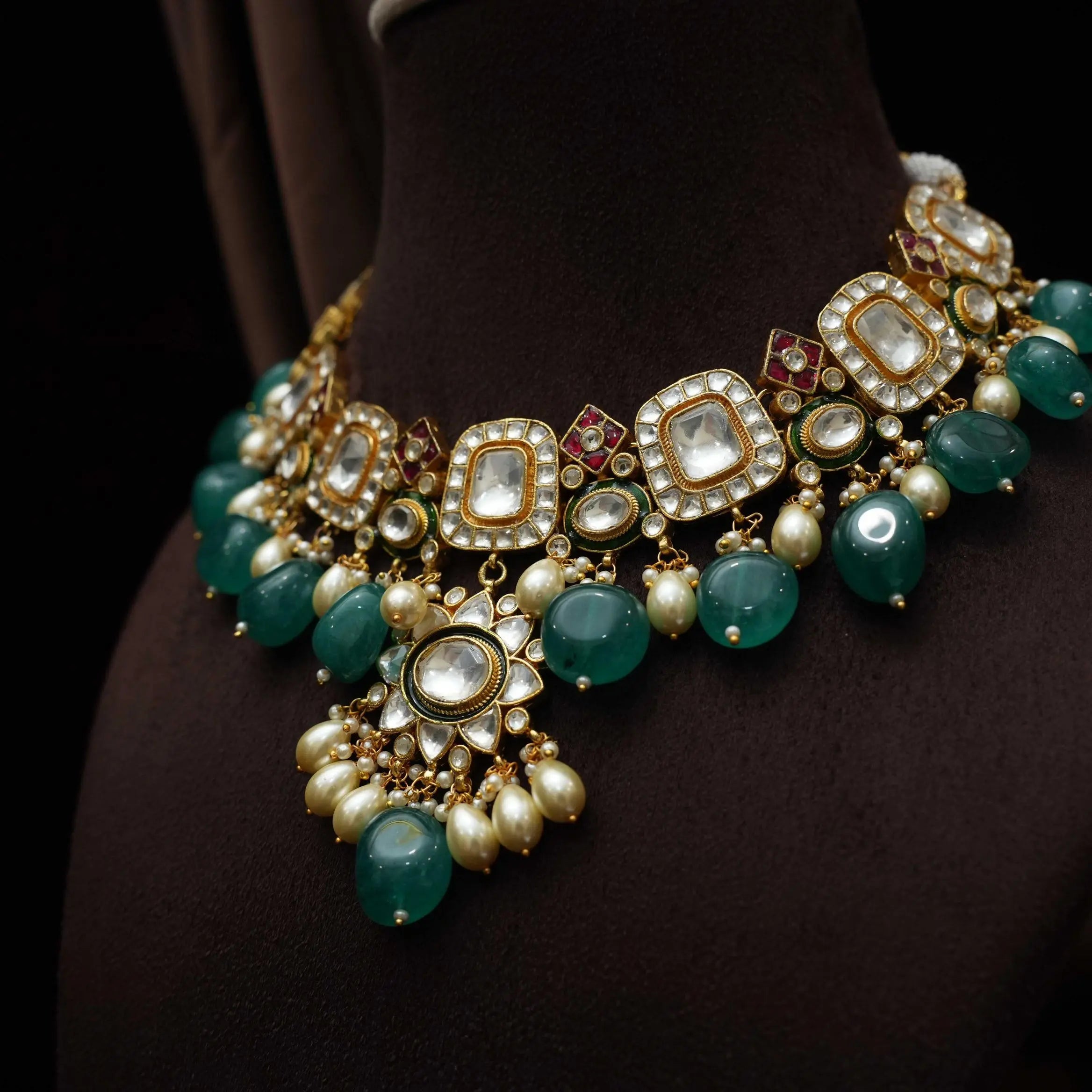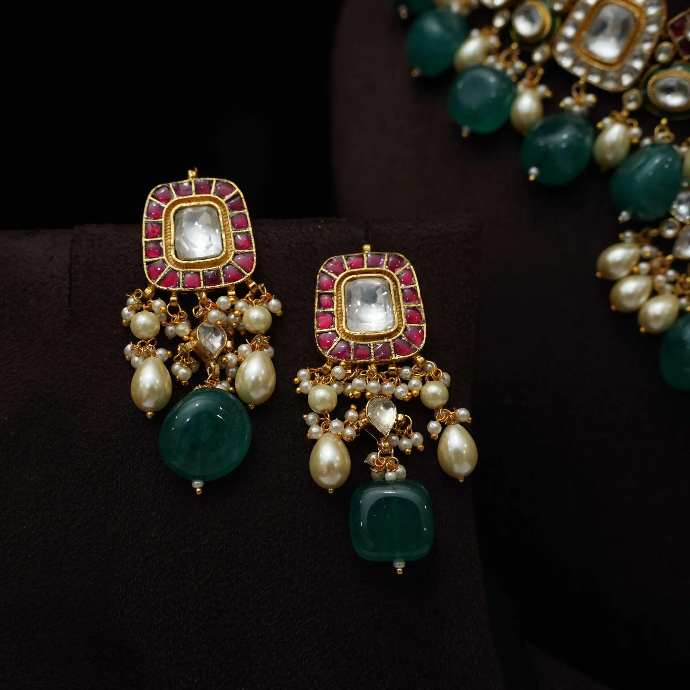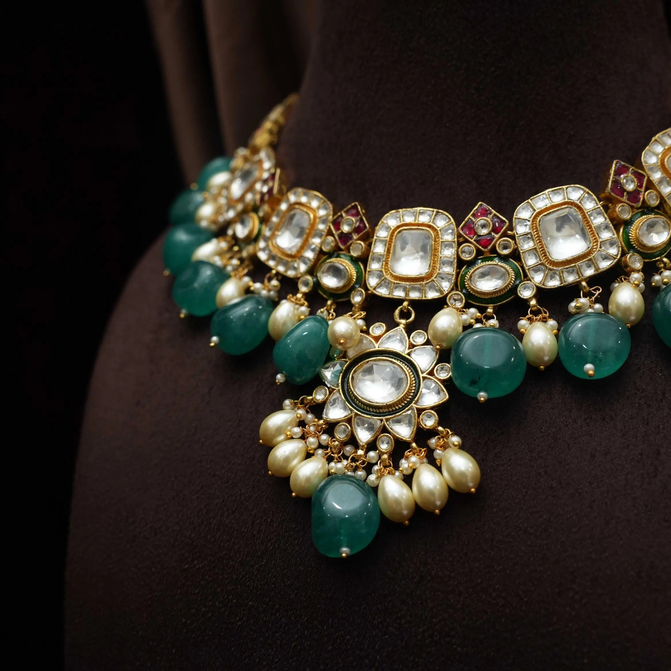Green bead drops and delicate pearls add a graceful finish, enhancing the overall richness and charm of the piece. Paired with matching earrings, this set is perfect for weddings, festive occasions, or any moment that calls for timeless elegance with a contemporary edge.