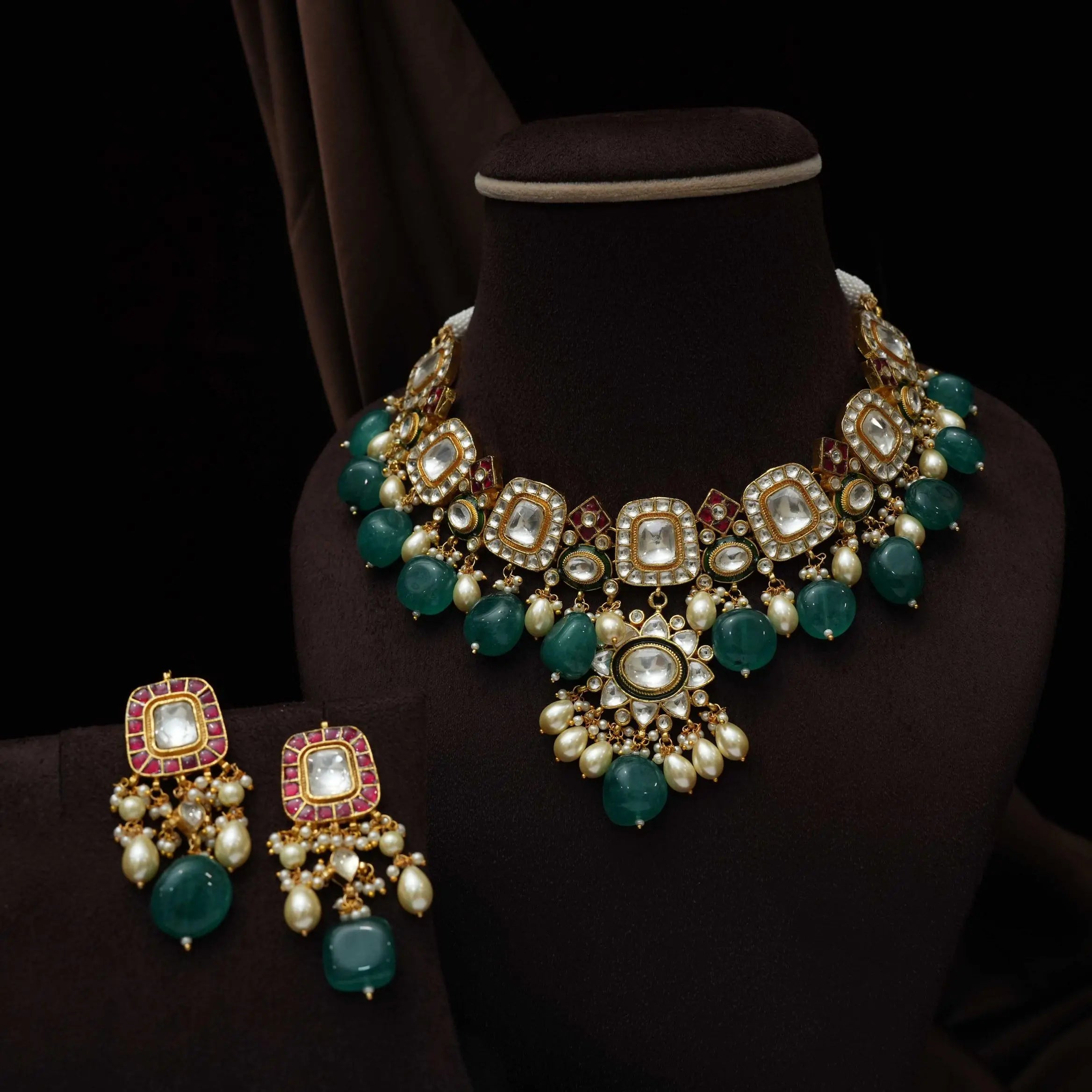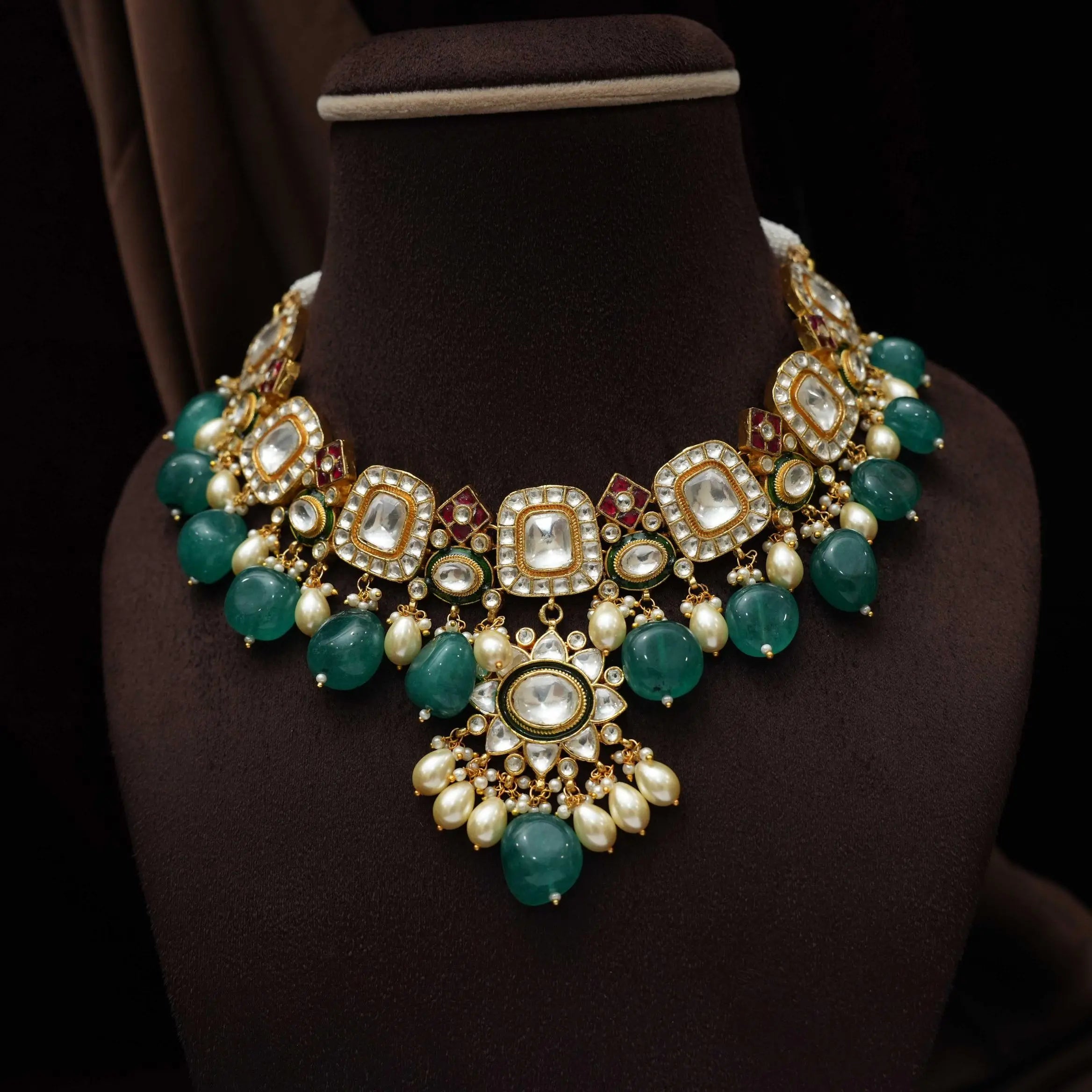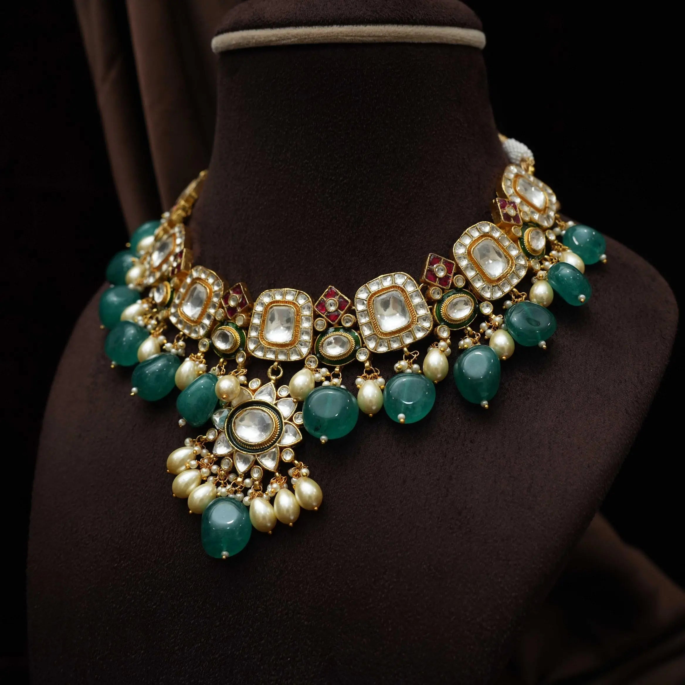 Green bead drops and delicate pearls add a graceful finish, enhancing the overall richness and charm of the piece. Paired with matching earrings, this set is perfect for weddings, festive occasions, or any moment that calls for timeless elegance with a contemporary edge.