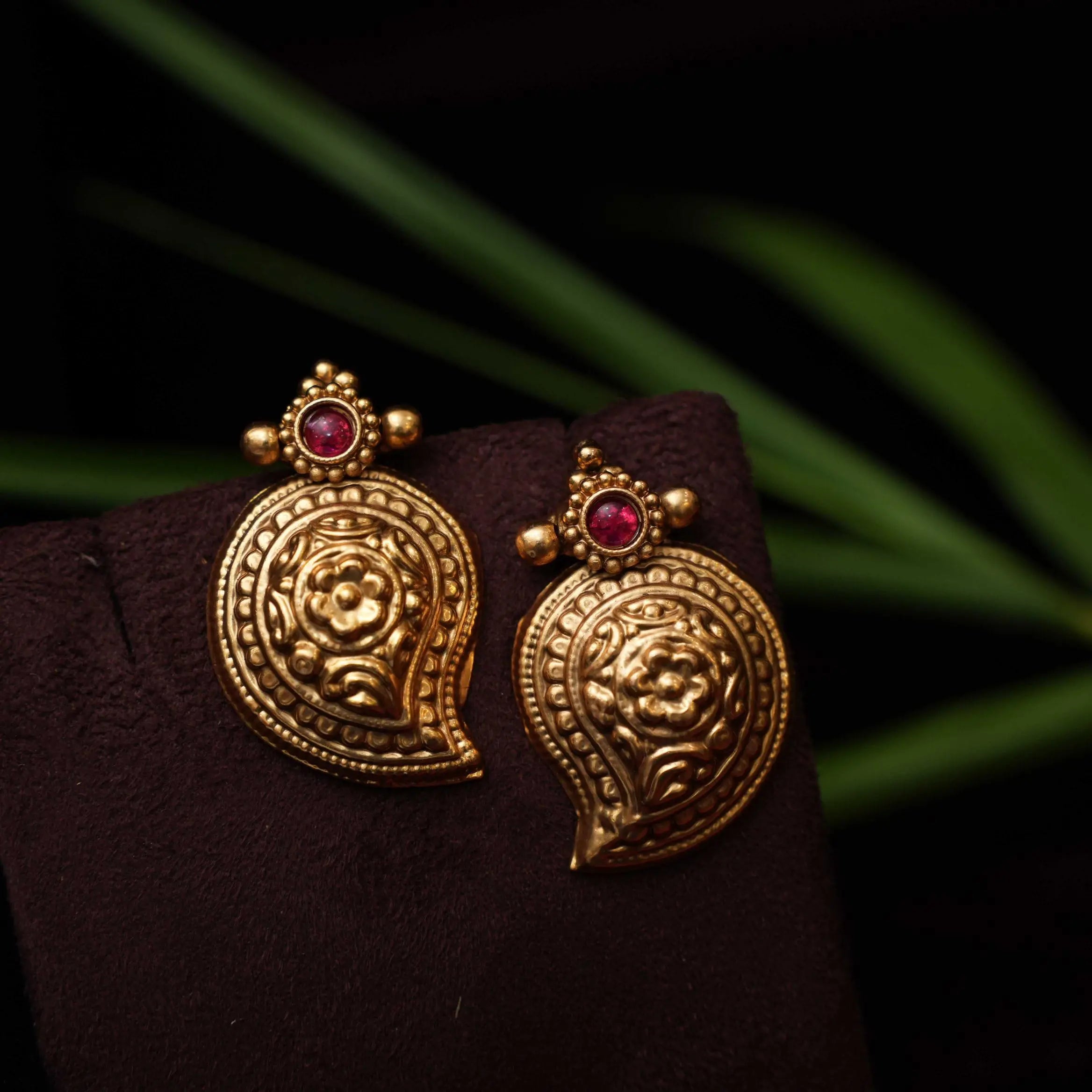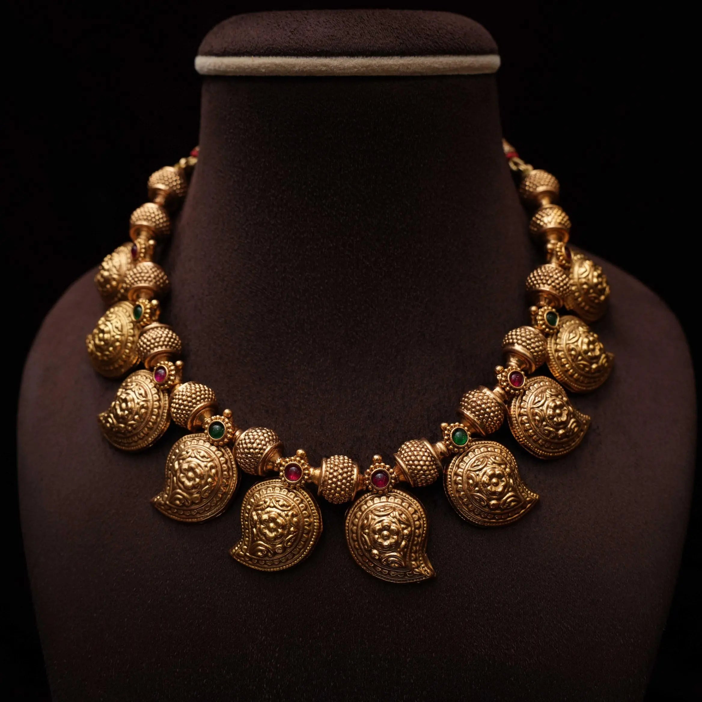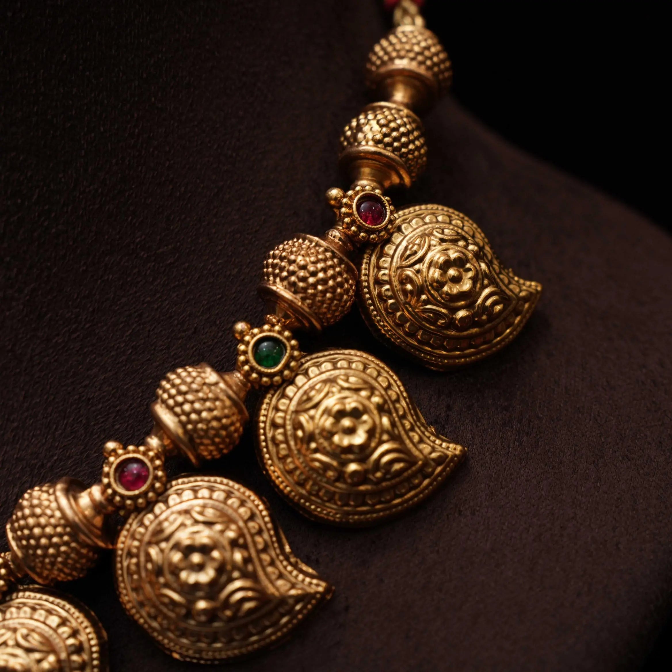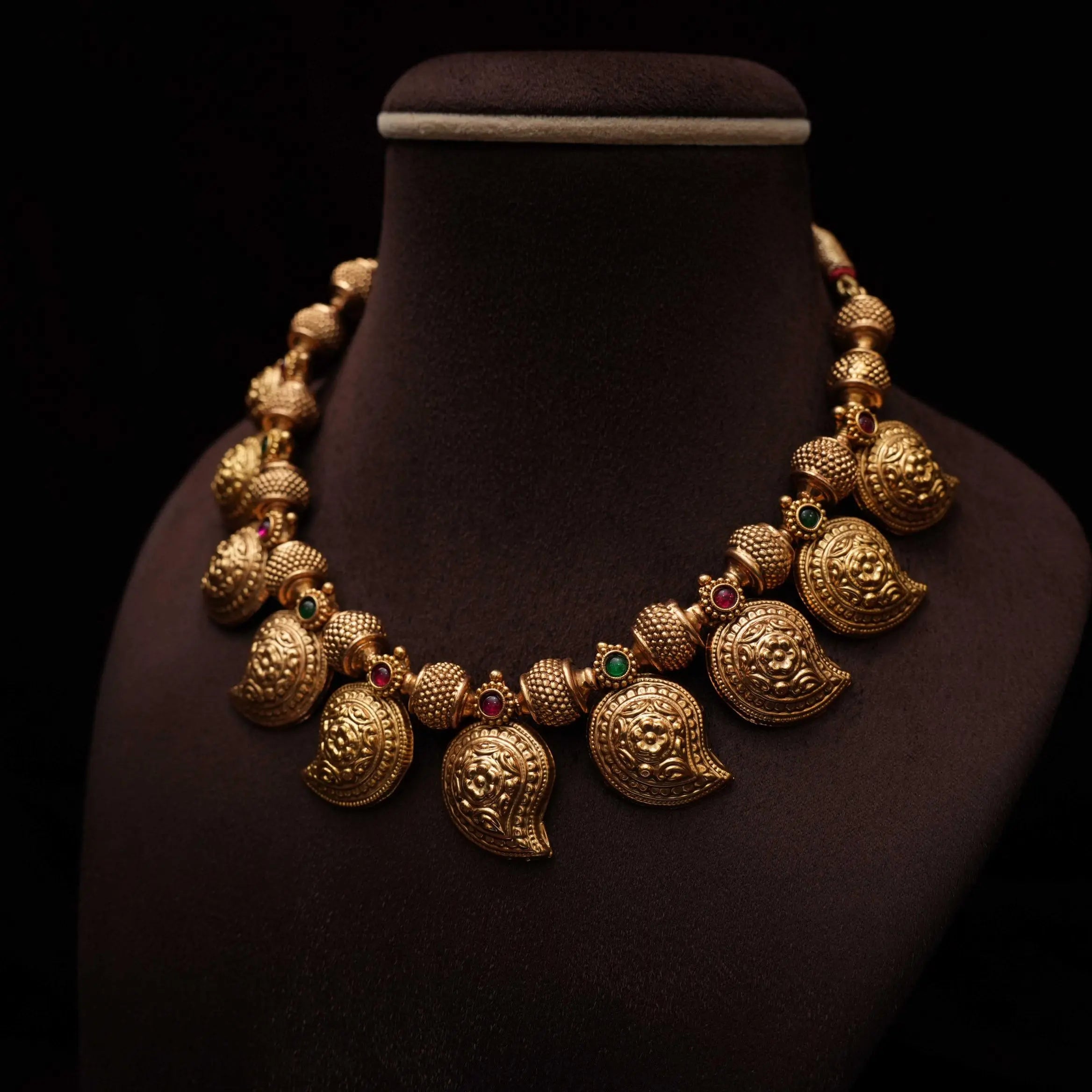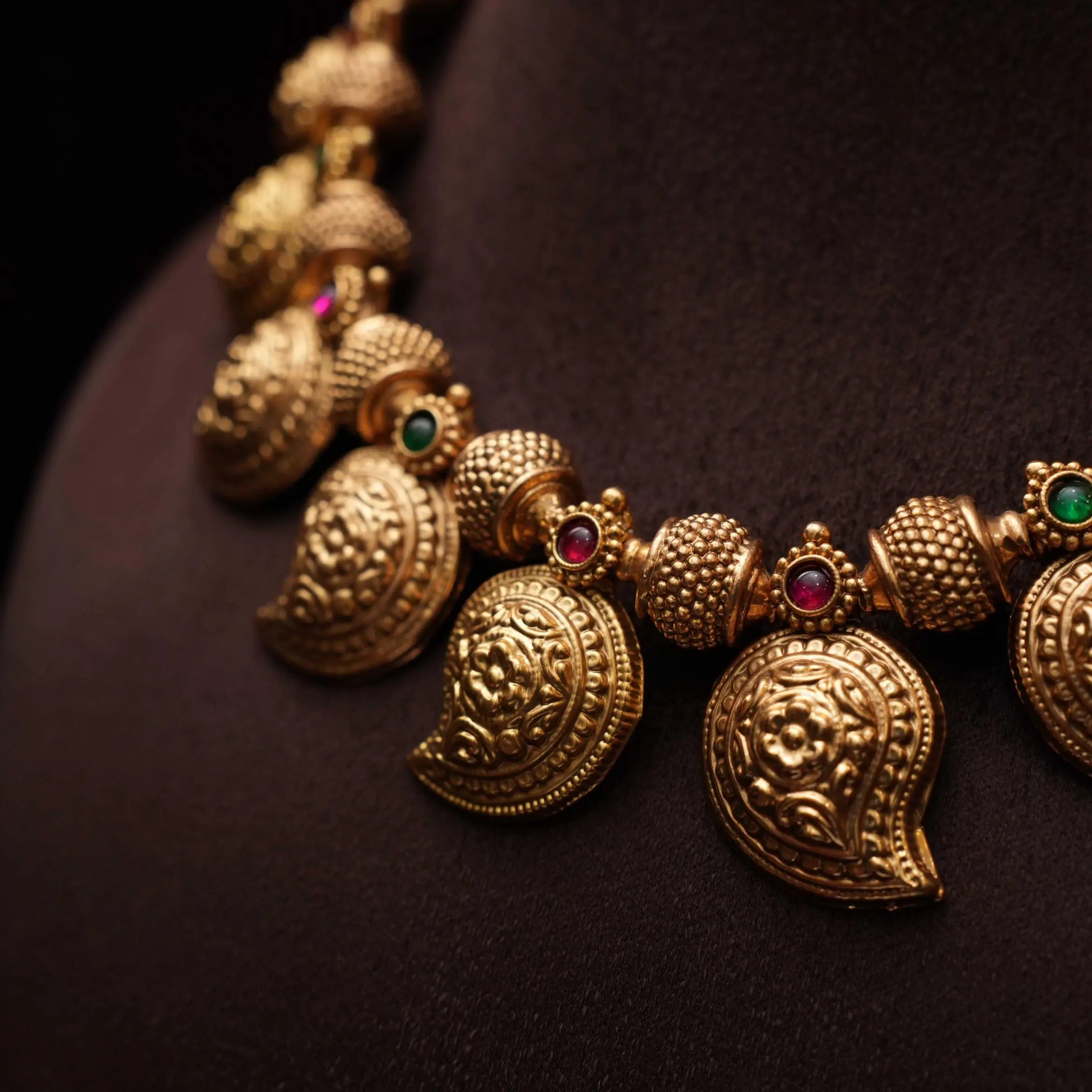 A beautiful and traditional antique necklace handcrafted in mango motif studded with red and green kemp stones. This set comes with a pair of ear stud.