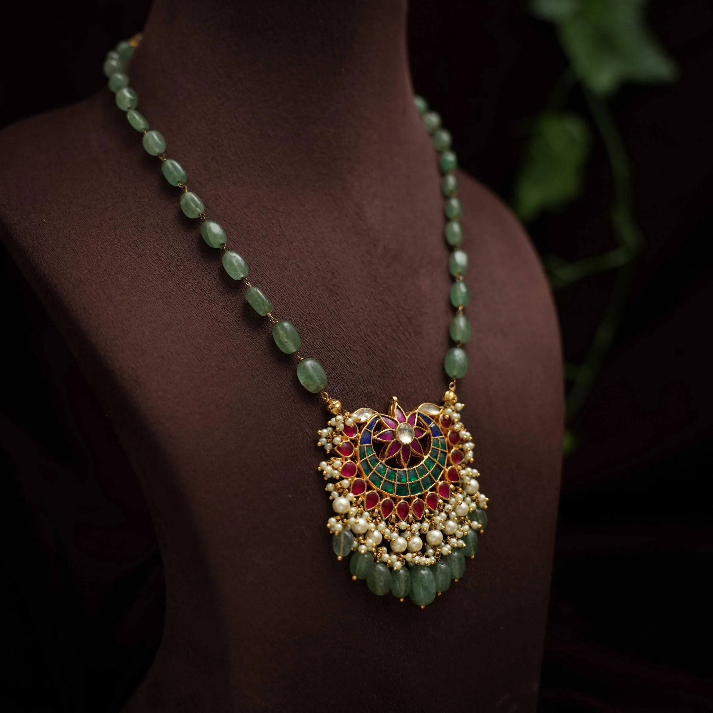 A classic necklace in green beads paired to chand polki pendant adorn with pearls & beads. This set comes with a pair of earrings.