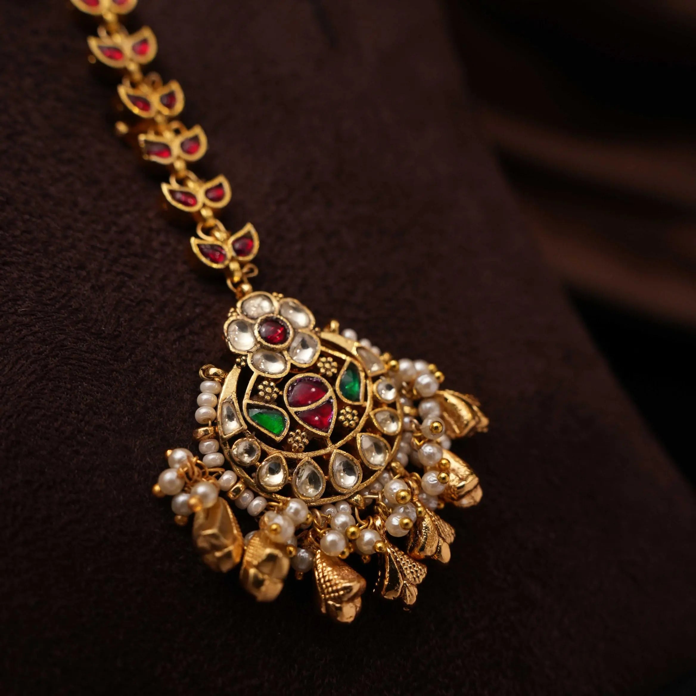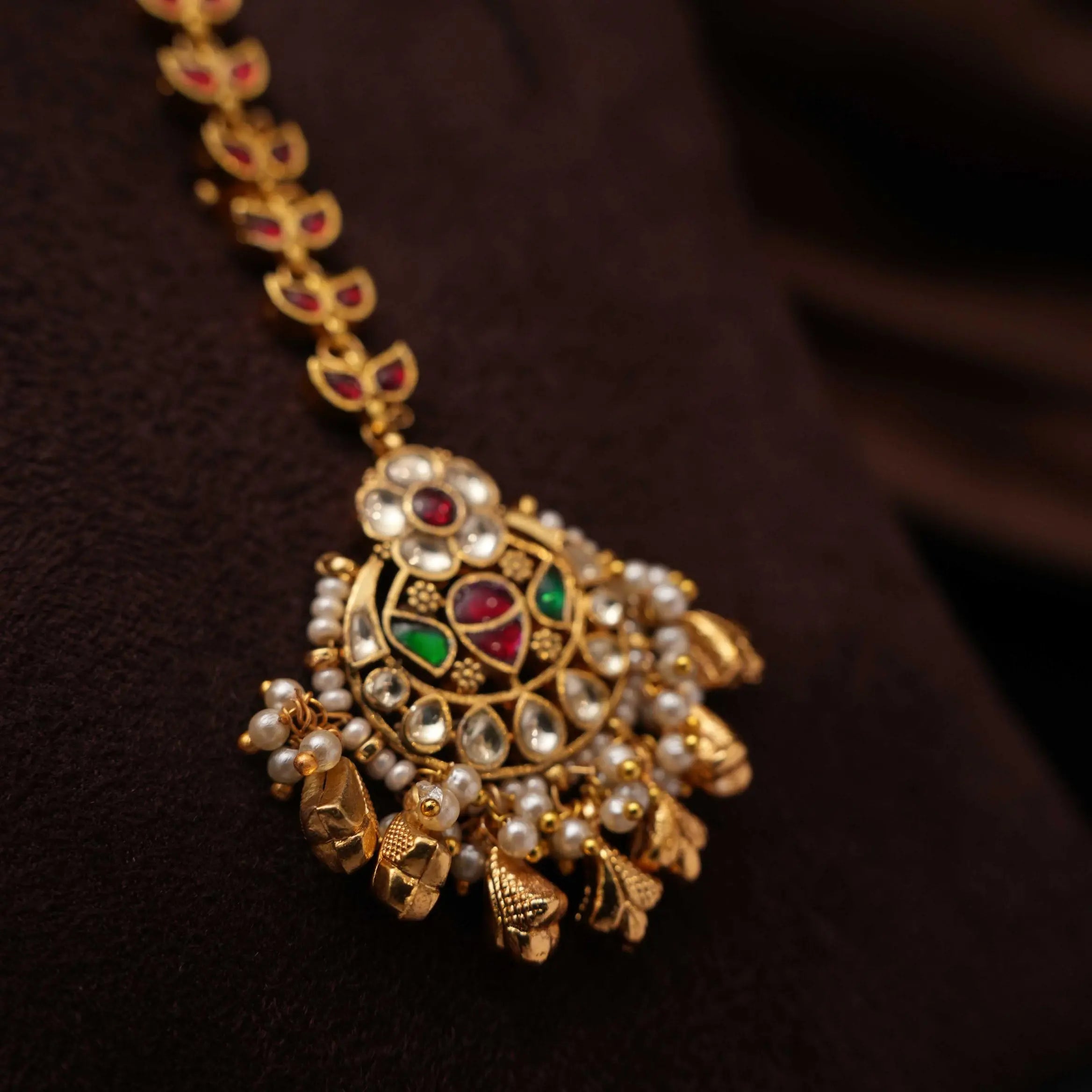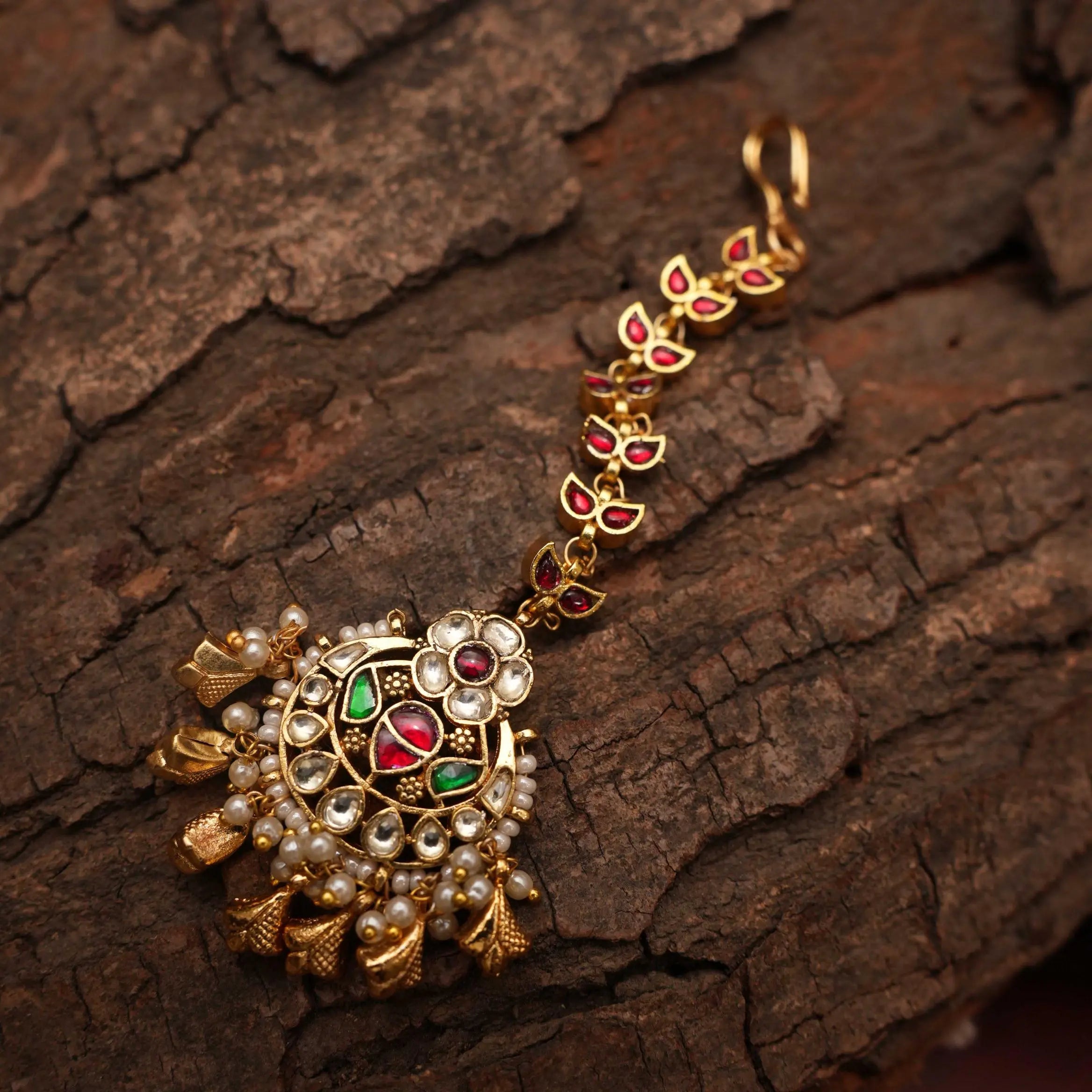A classic tikka in floral motif studded with polki stones, pearls and golden balls and finely finished in antique finish.