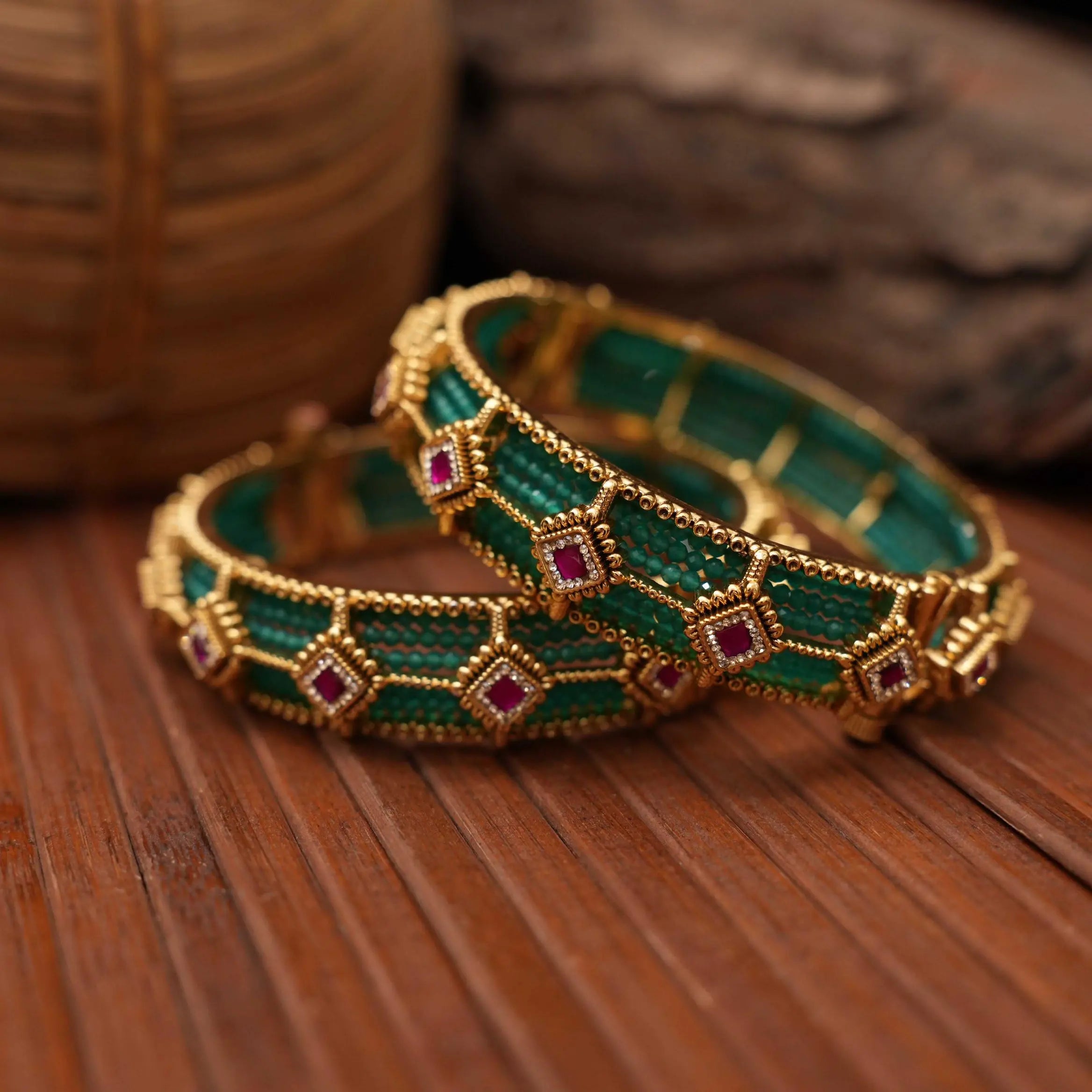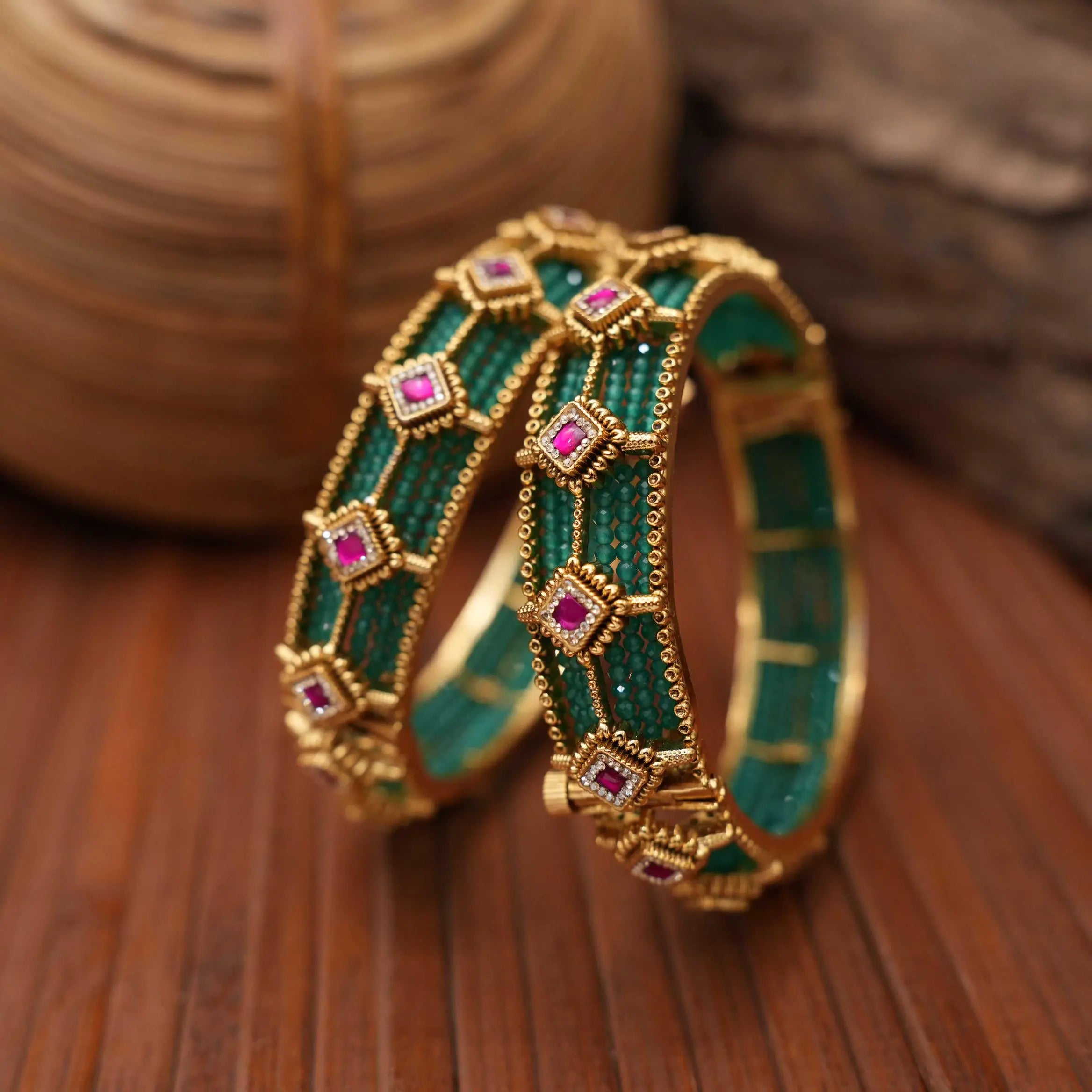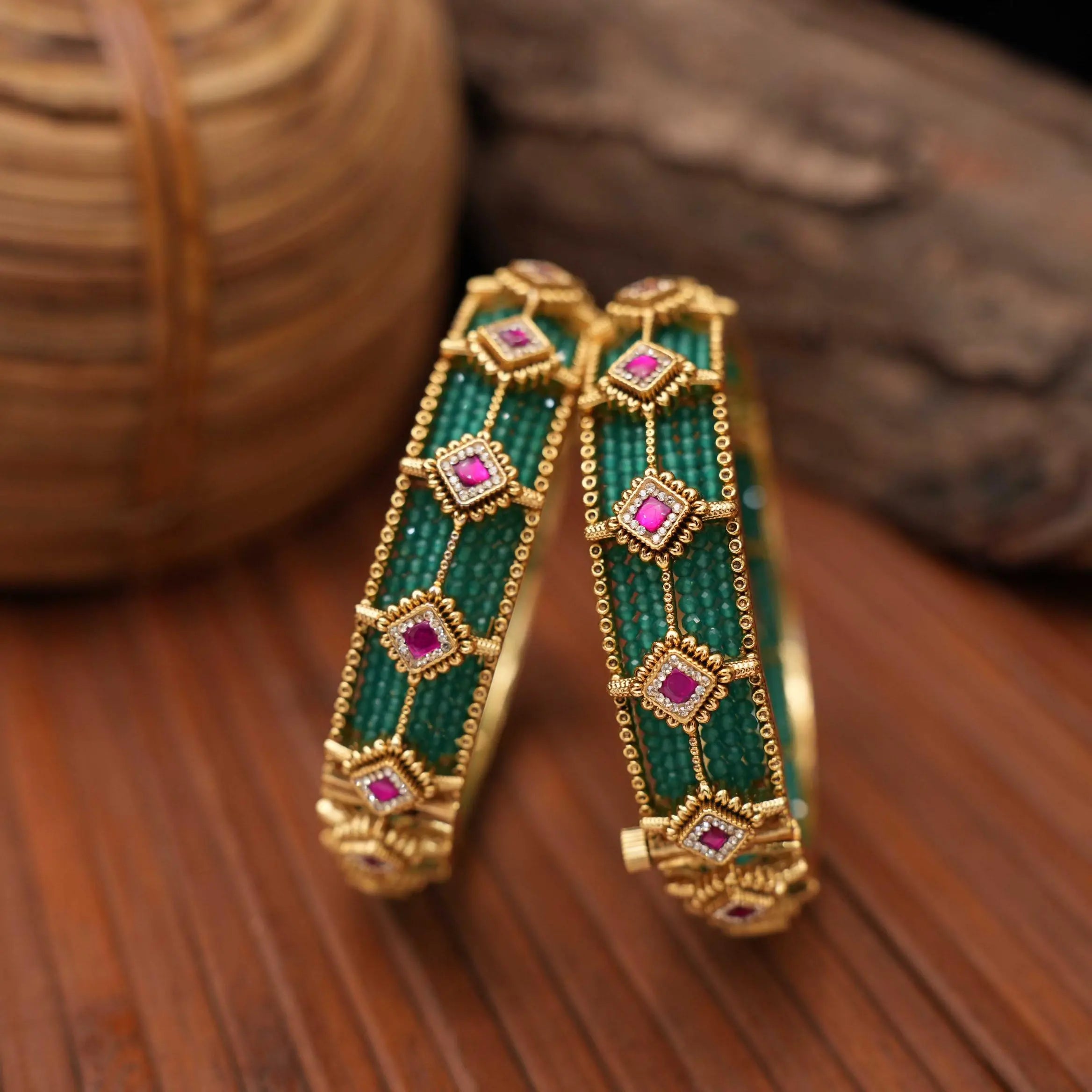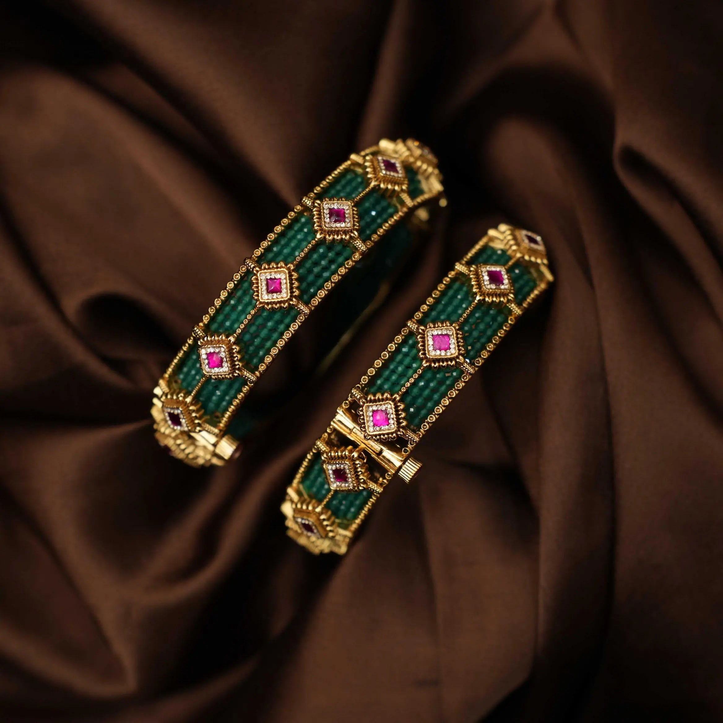 A beautiful pair of bangles, meticulously handcrafted to reflect traditional elegance. These bangles feature vibrant green beads intricately arranged and accented with shimmering Polki stones, creating a rich and regal look. The combination of bold color and classic craftsmanship makes them a perfect accessory for festive occasions, weddings, or adding a touch of heritage to any ethnic ensemble.