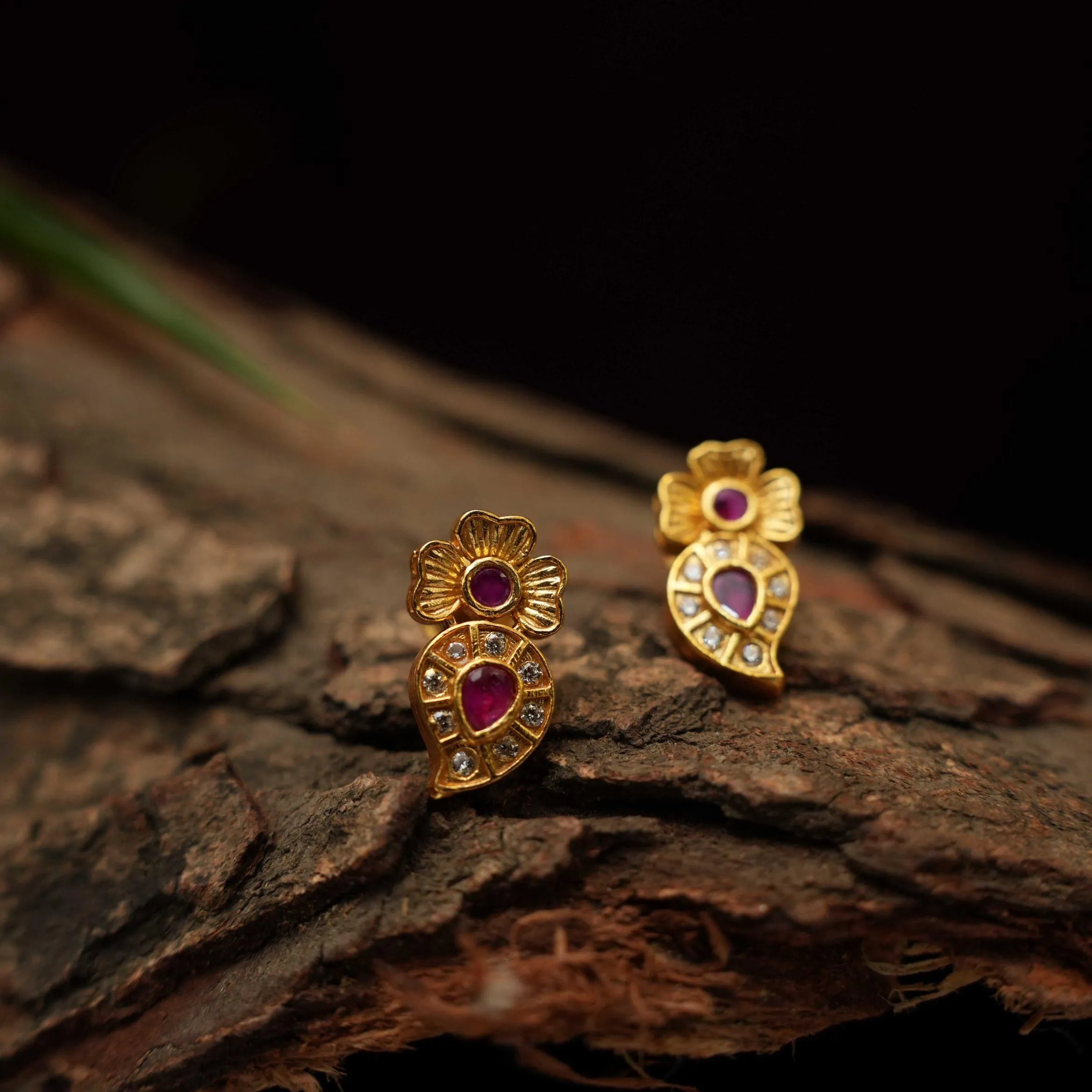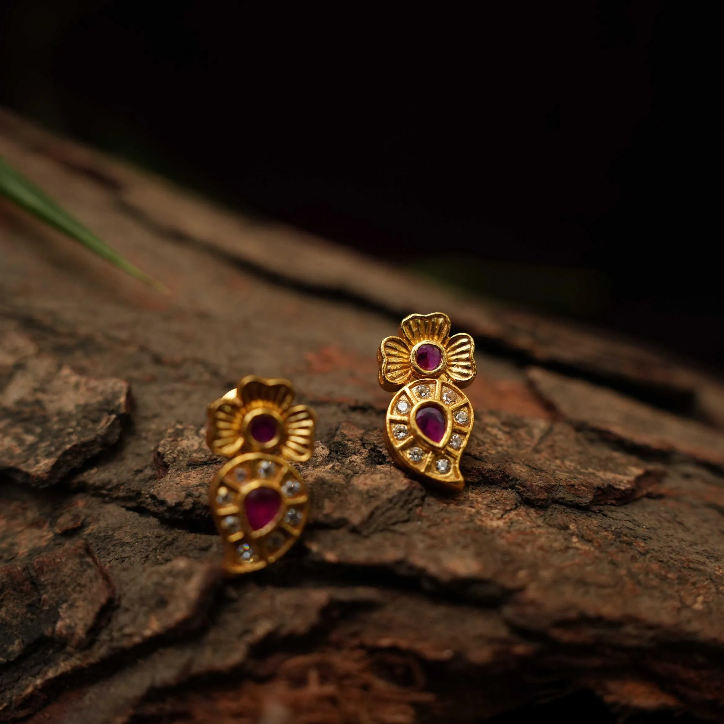 A beautiful silver ear stud in mango motif studded with red & white stones.