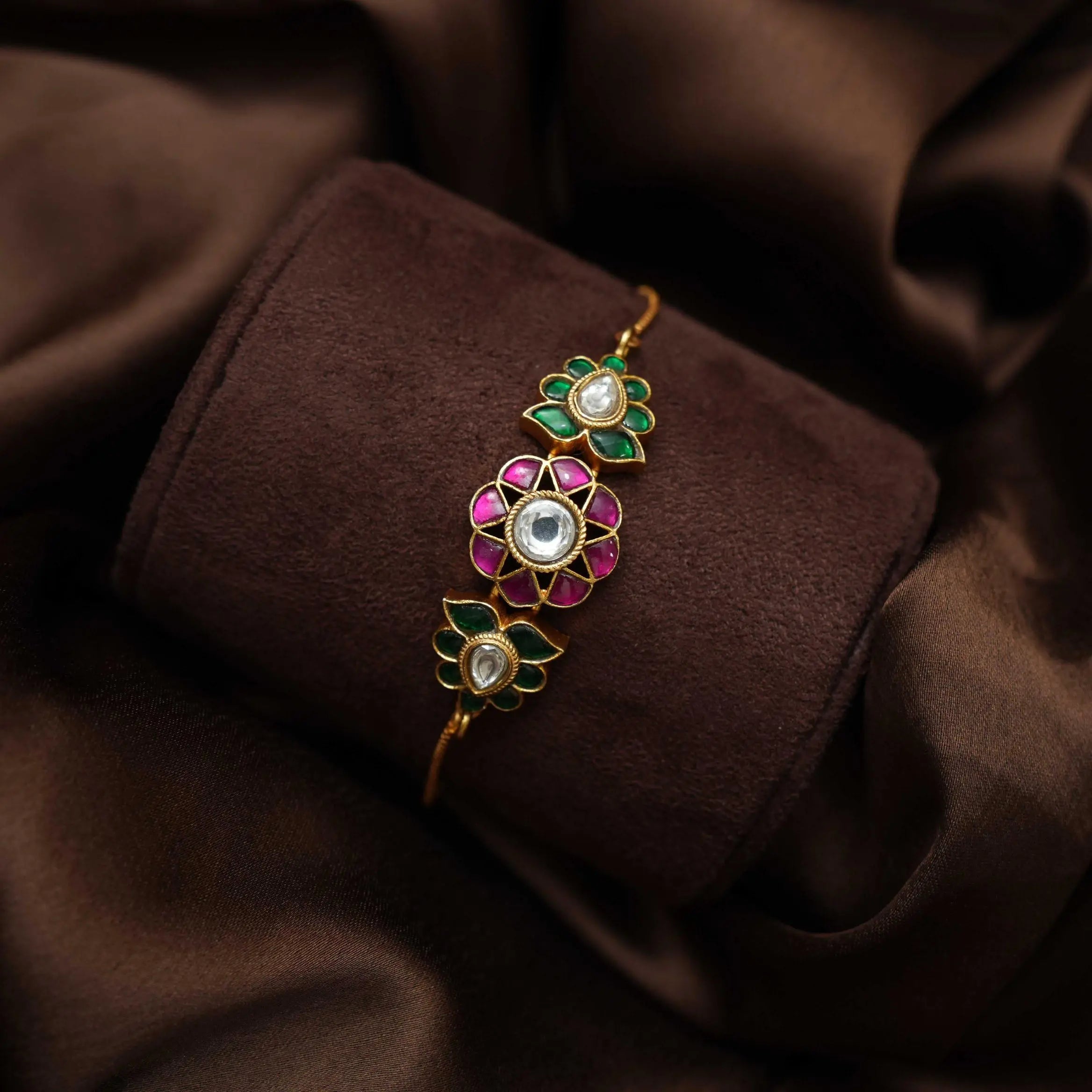 A beautiful silver bracelet in geometrical motif studded with multicolor stones.