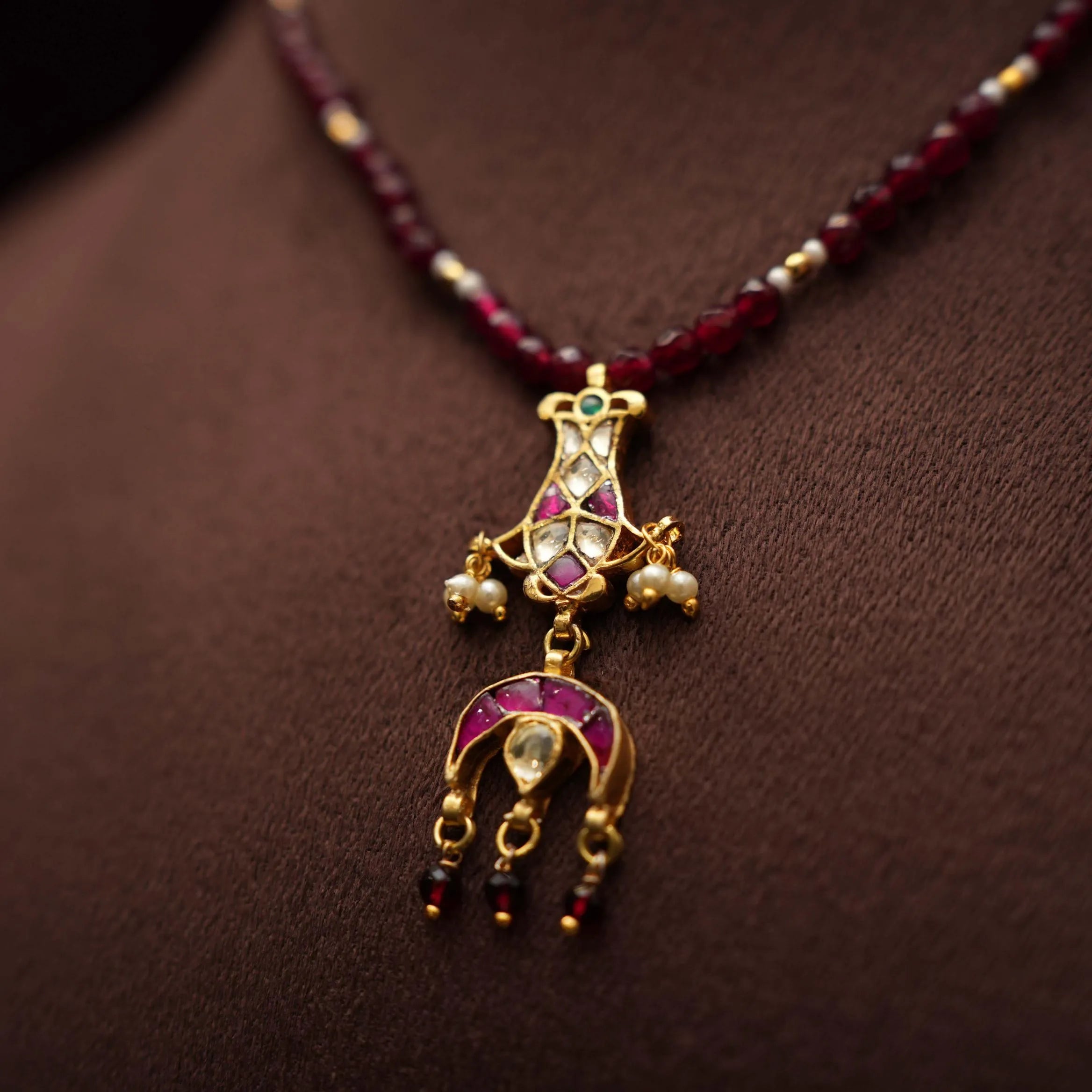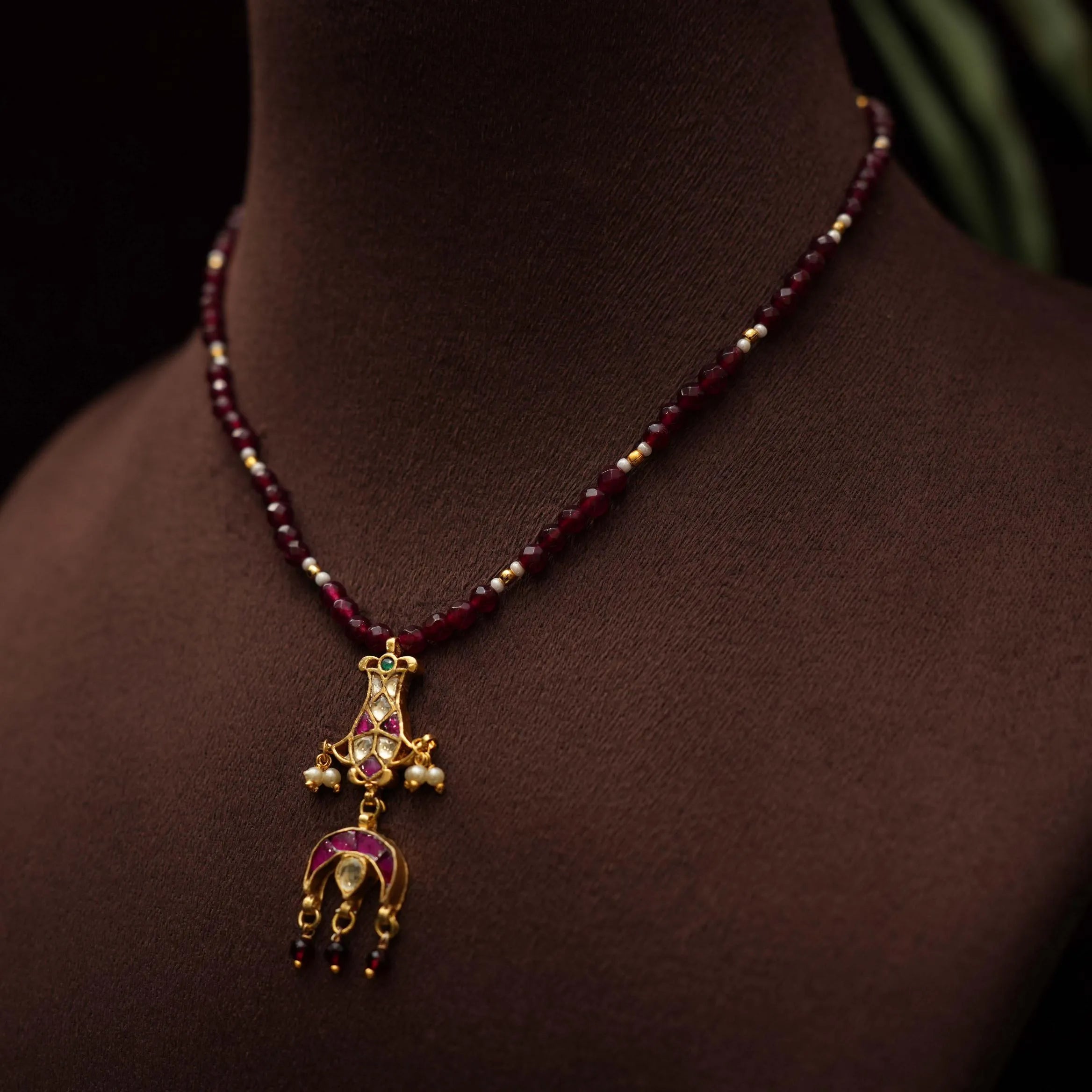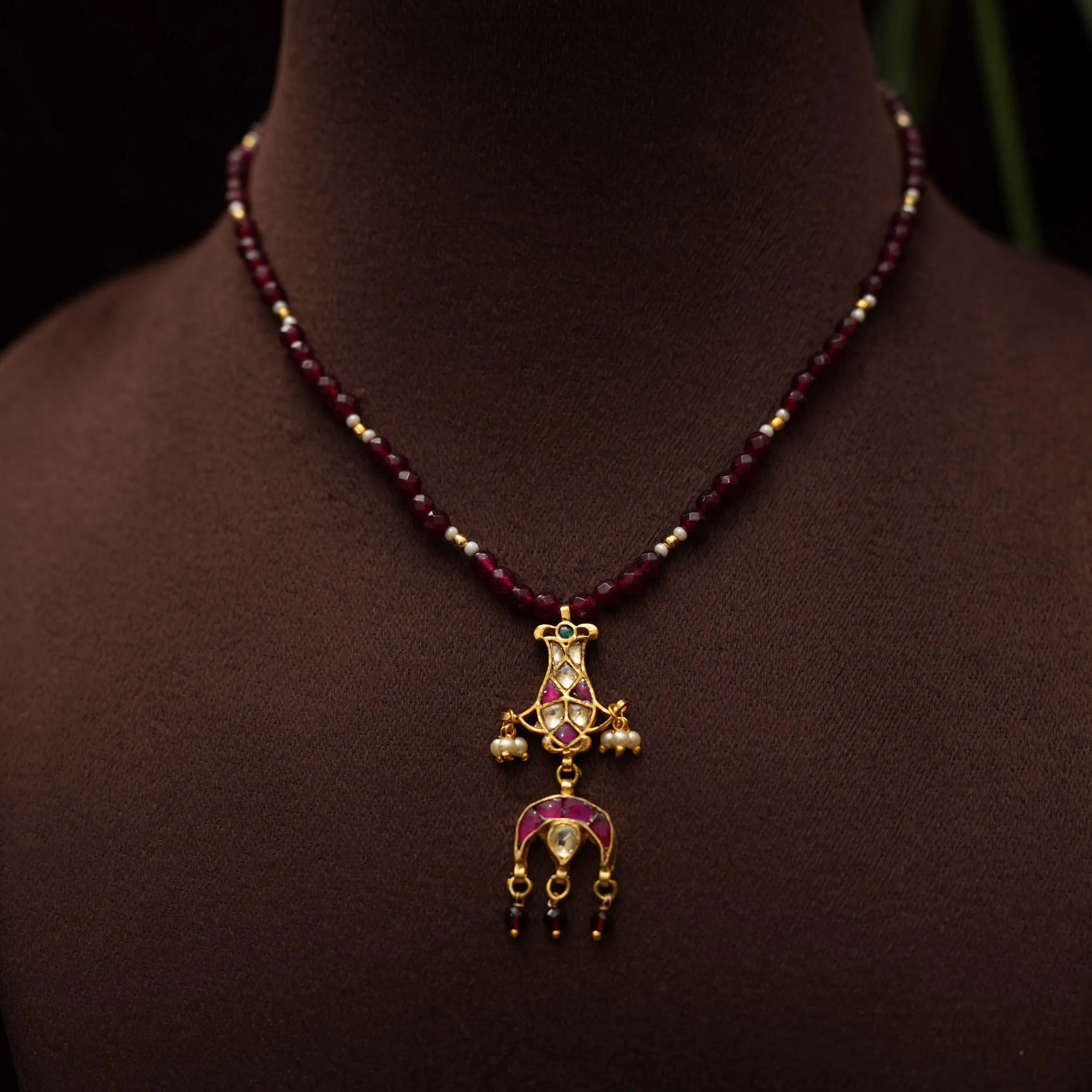 A simple & elegant necklace in maroon beads paired to chand polki pendant.