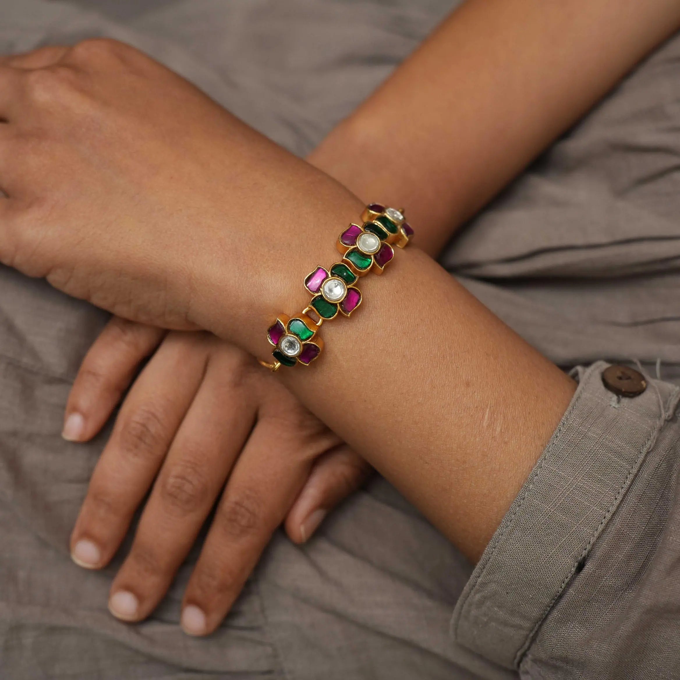 A classic silver bracelet in floral motif studded with multicolor stones.