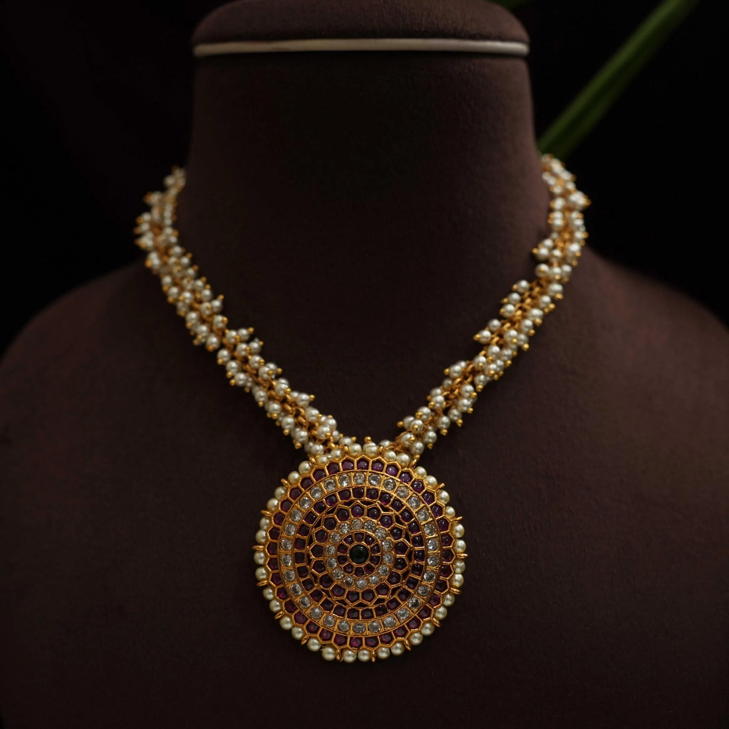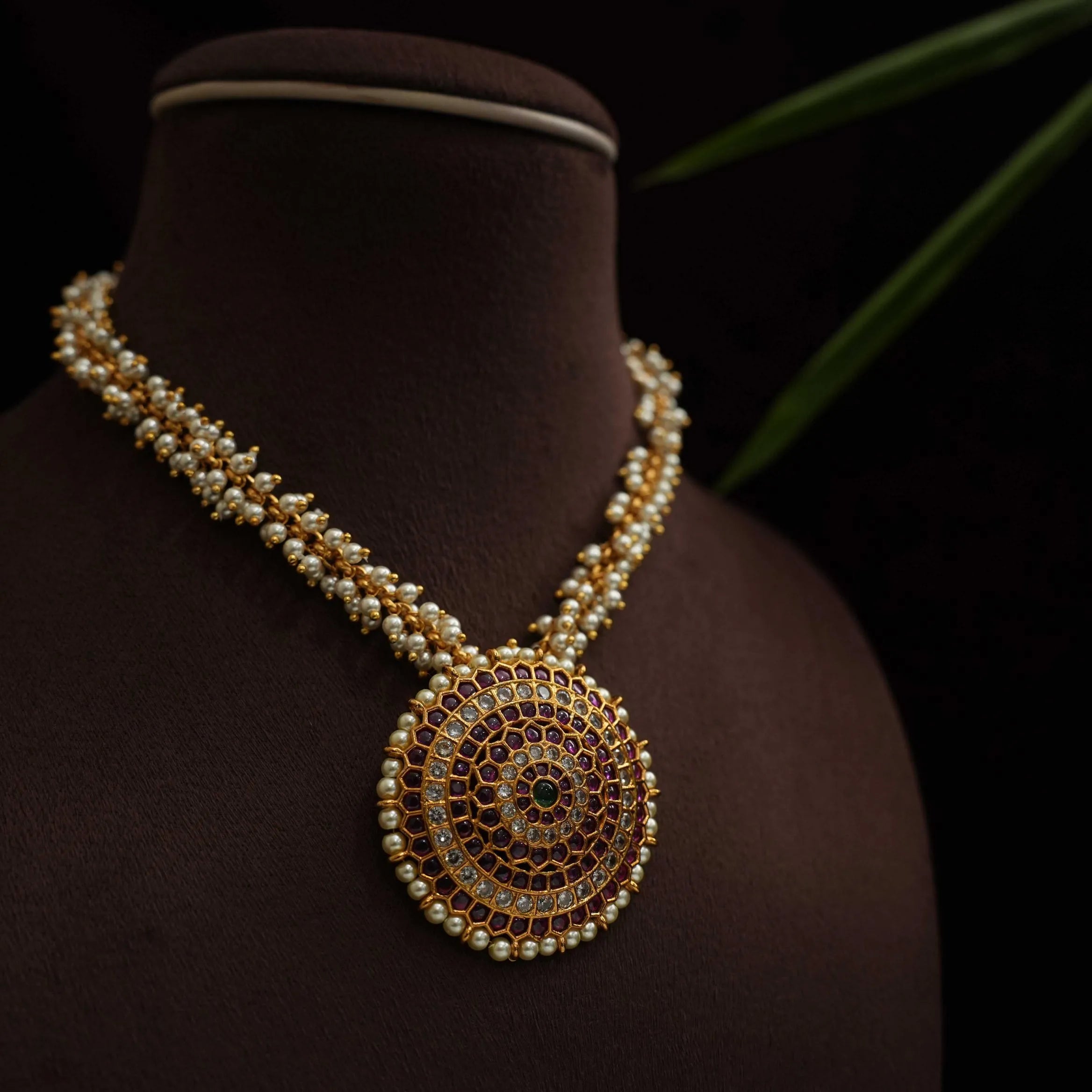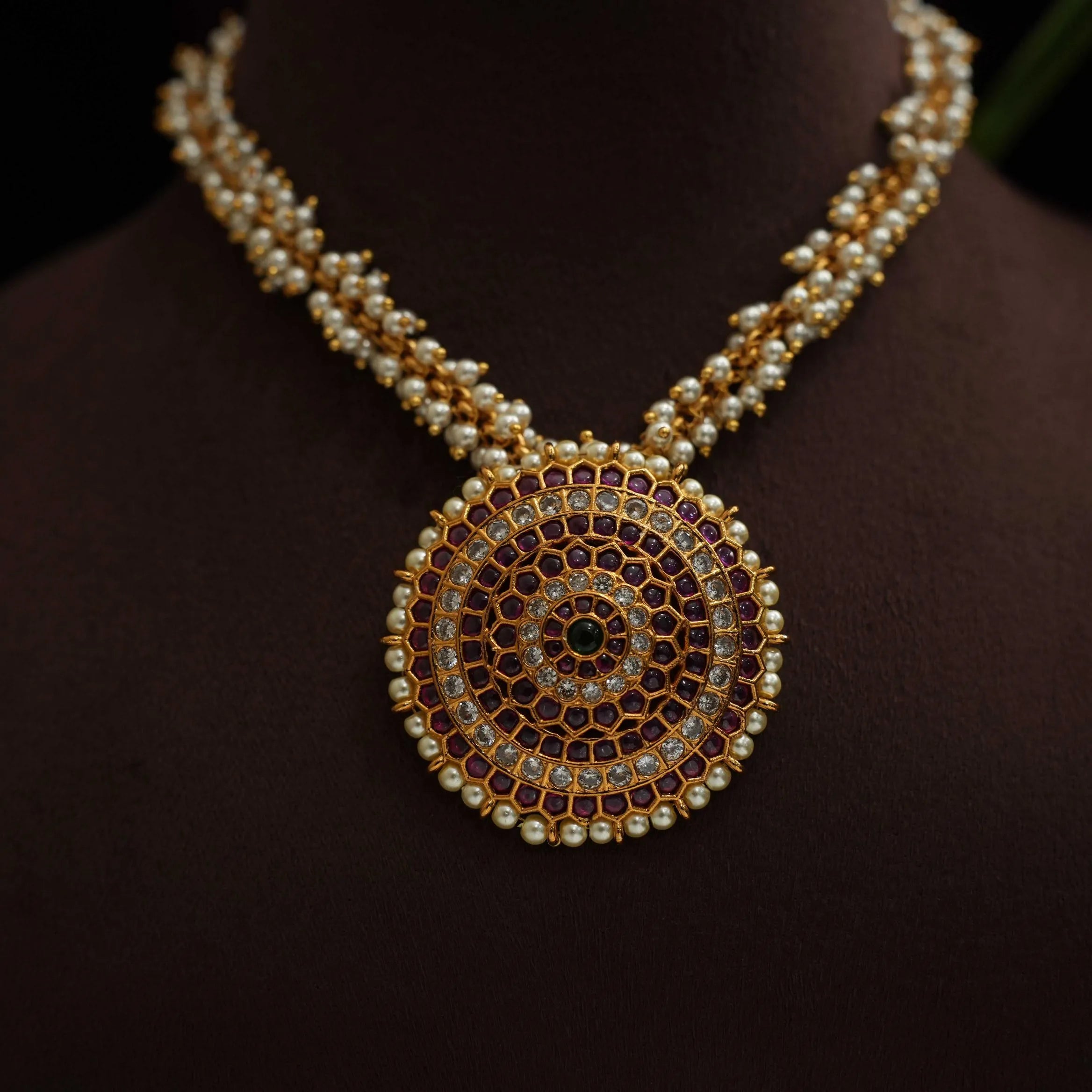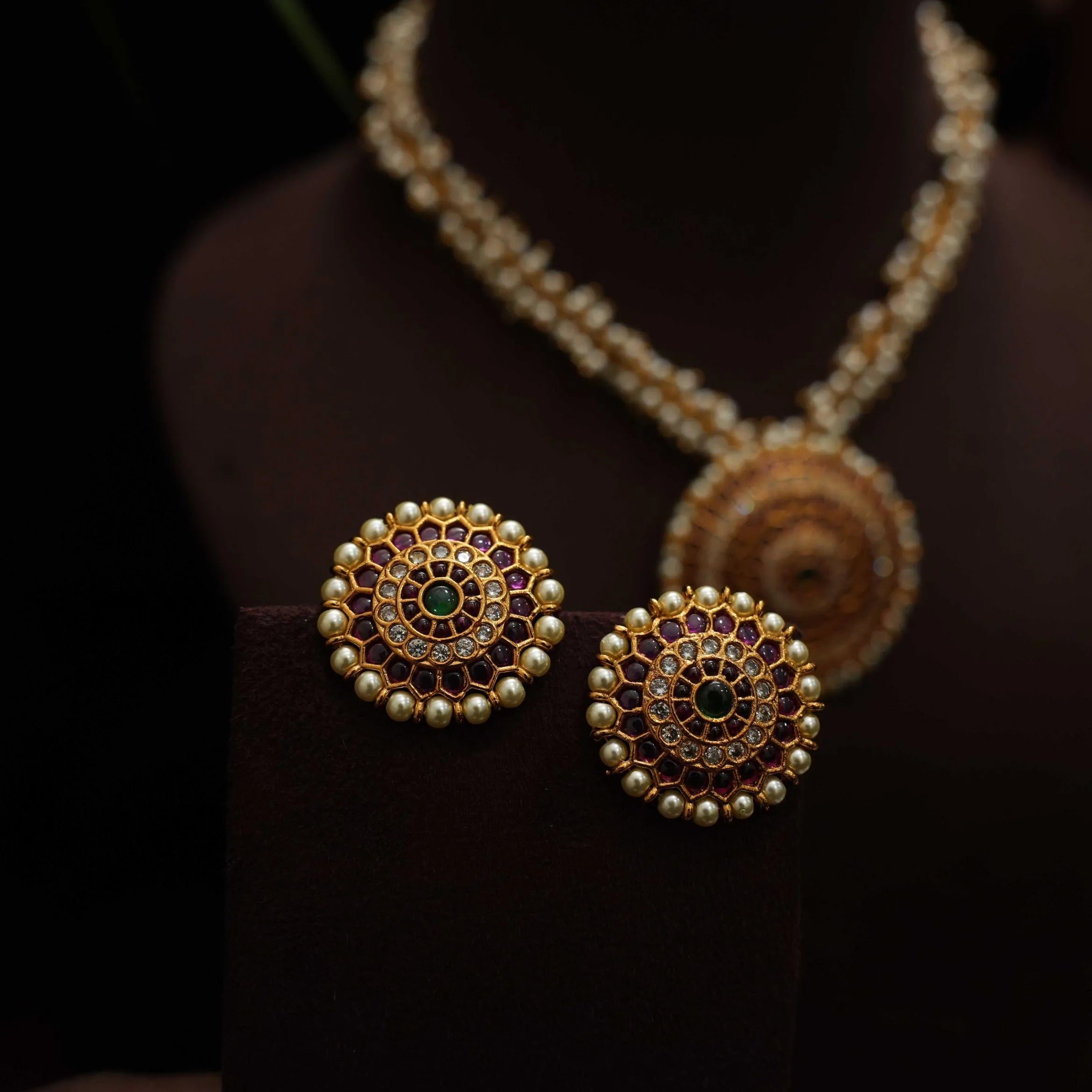 An elegant contemporary antique necklace crafted with intricate detailing, featuring a harmonious blend of pearl clusters, green enamel accents, and ruby-toned stone drops. The design is delicately finished with evenly spaced dangling elements that add graceful movement and timeless charm. Paired with matching earrings, this set creates a refined and balanced look—perfect for weddings, festive occasions, and traditional celebrations.