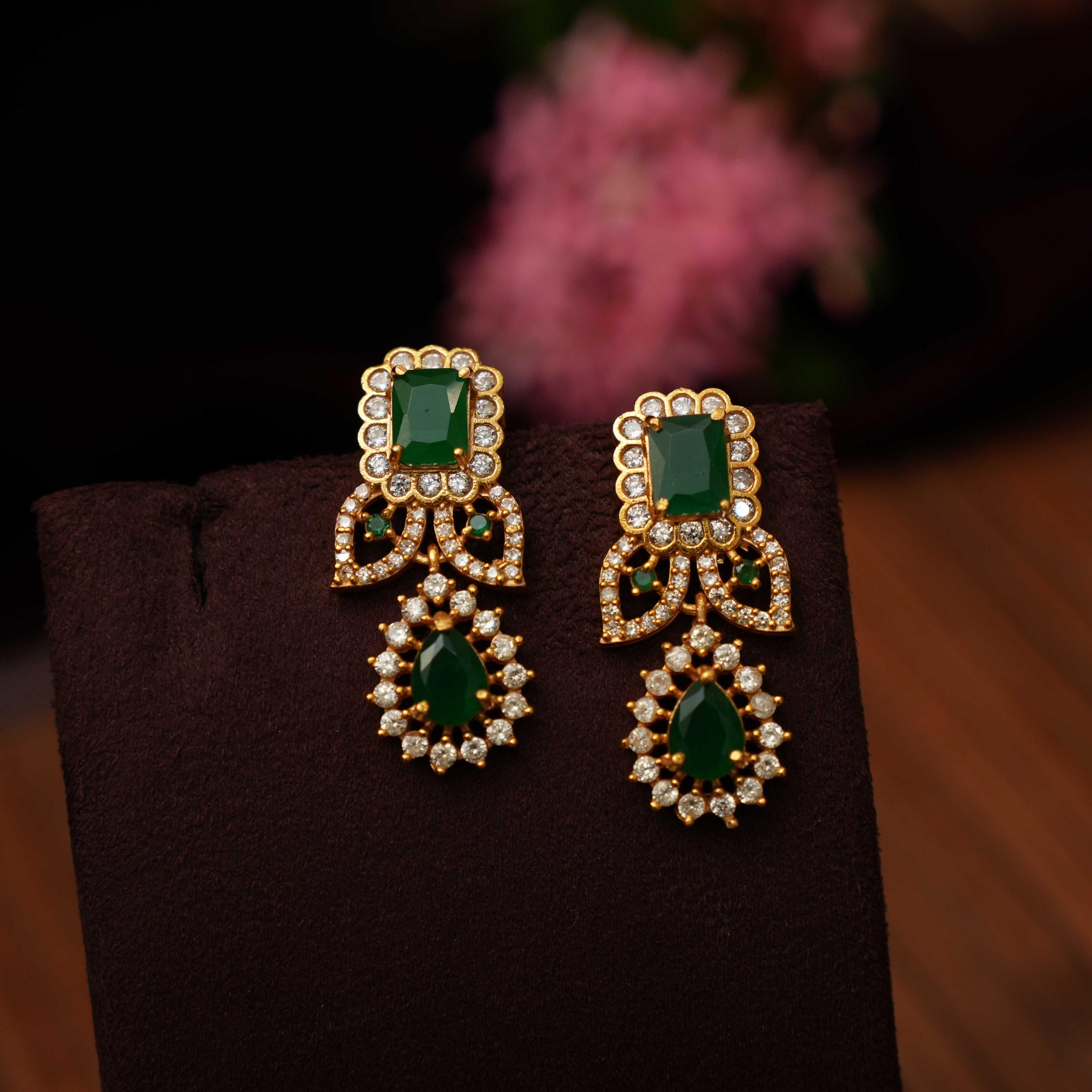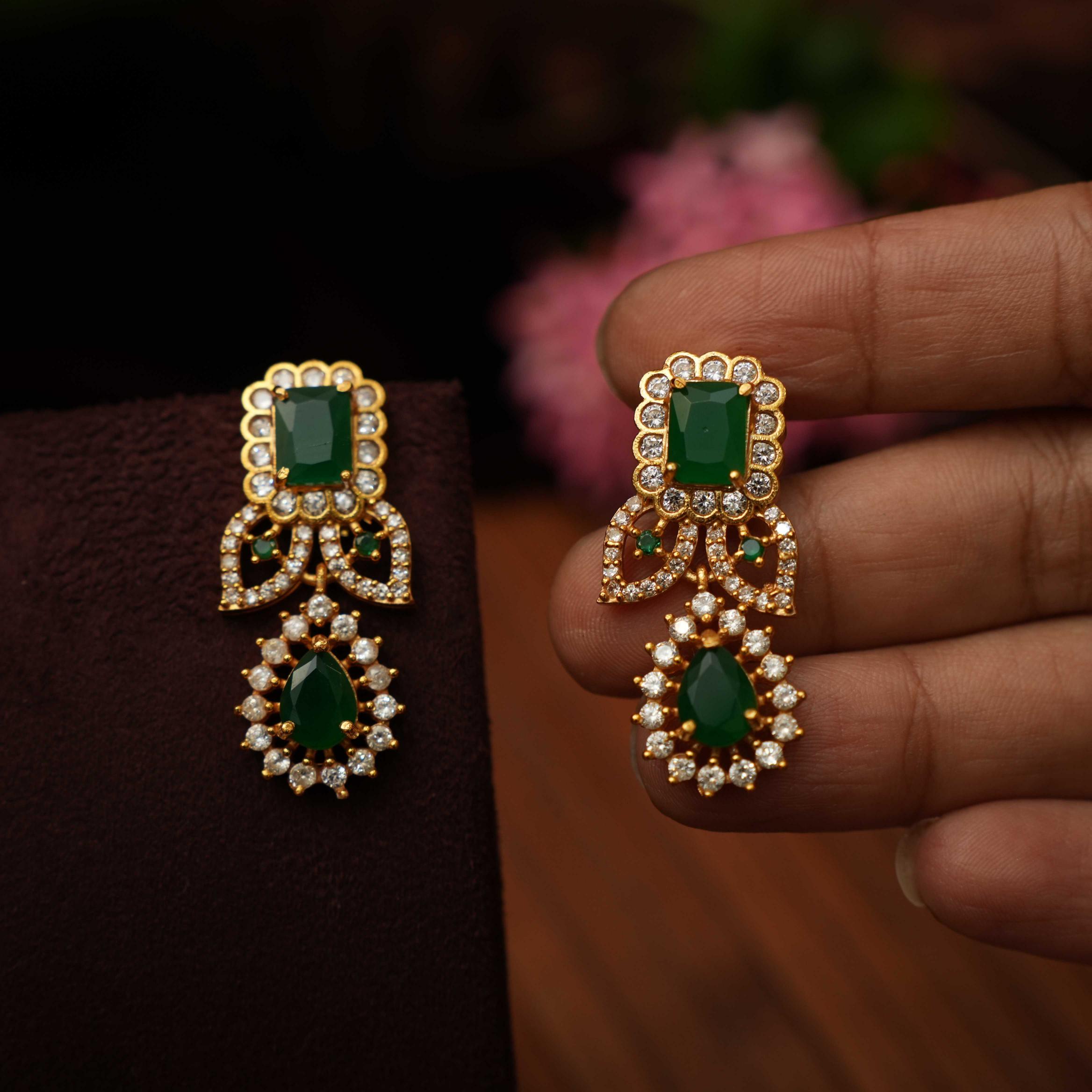 Embrace timeless elegance with our 92.5 gold-plated silver ear stud, in vibrant green and white stones. This intricately designed piece resonates with cultural heritage and vibrant sophistication.