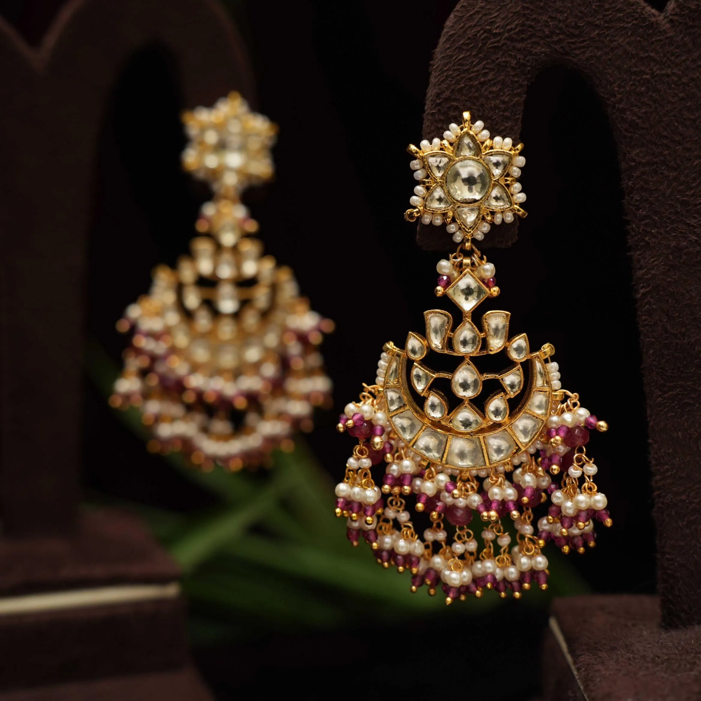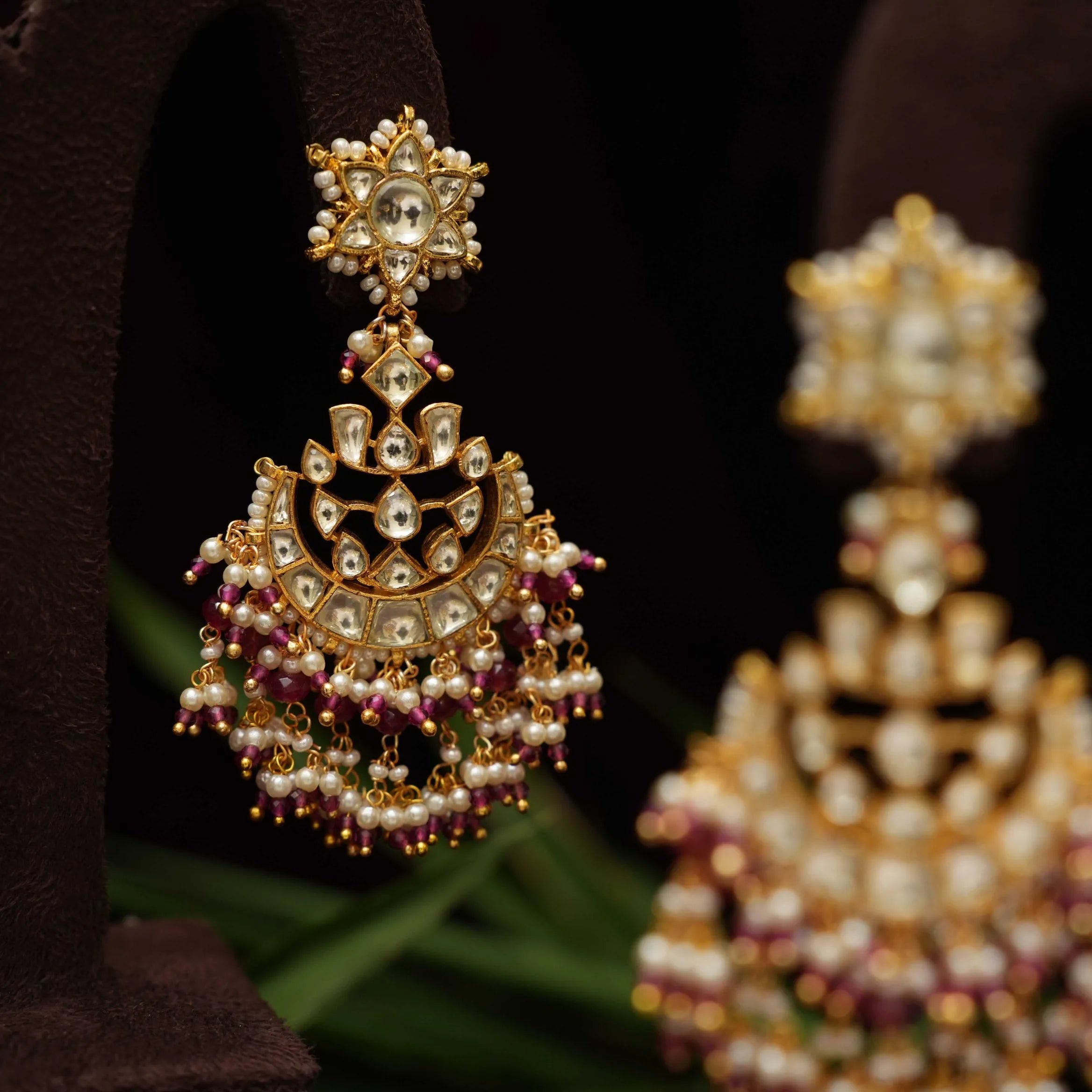 A beautiful chandbali earrings studded with polki stones & green beads, pearls.