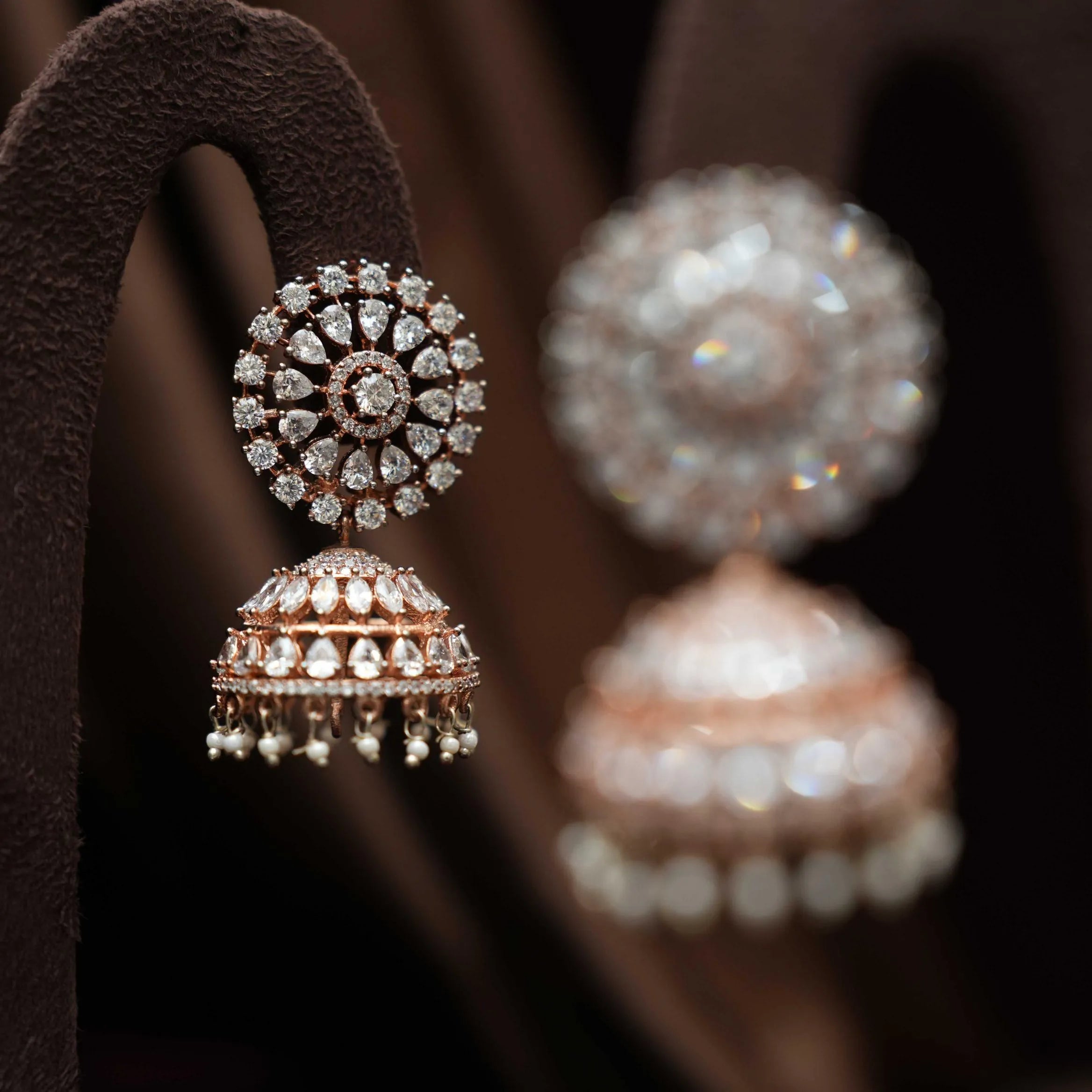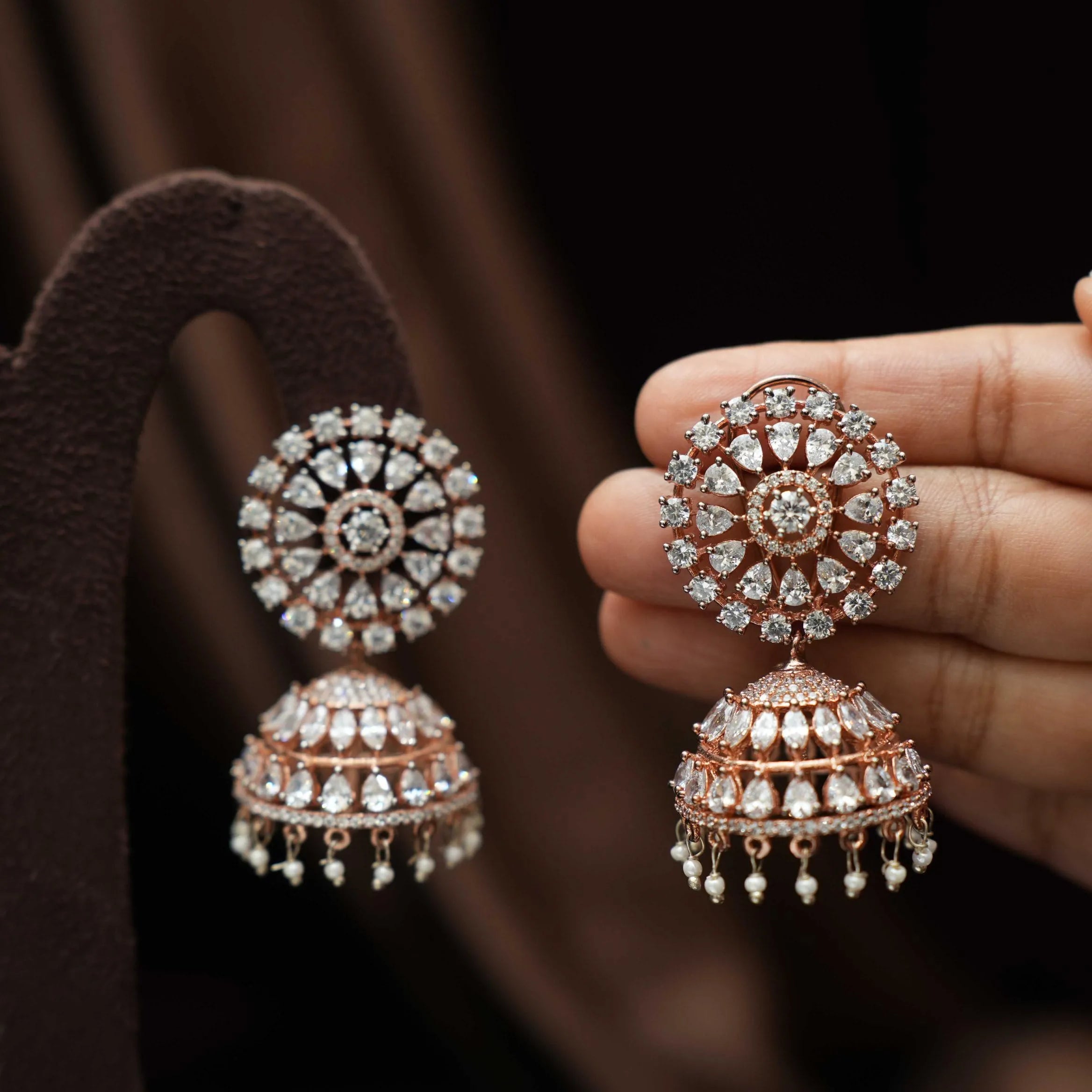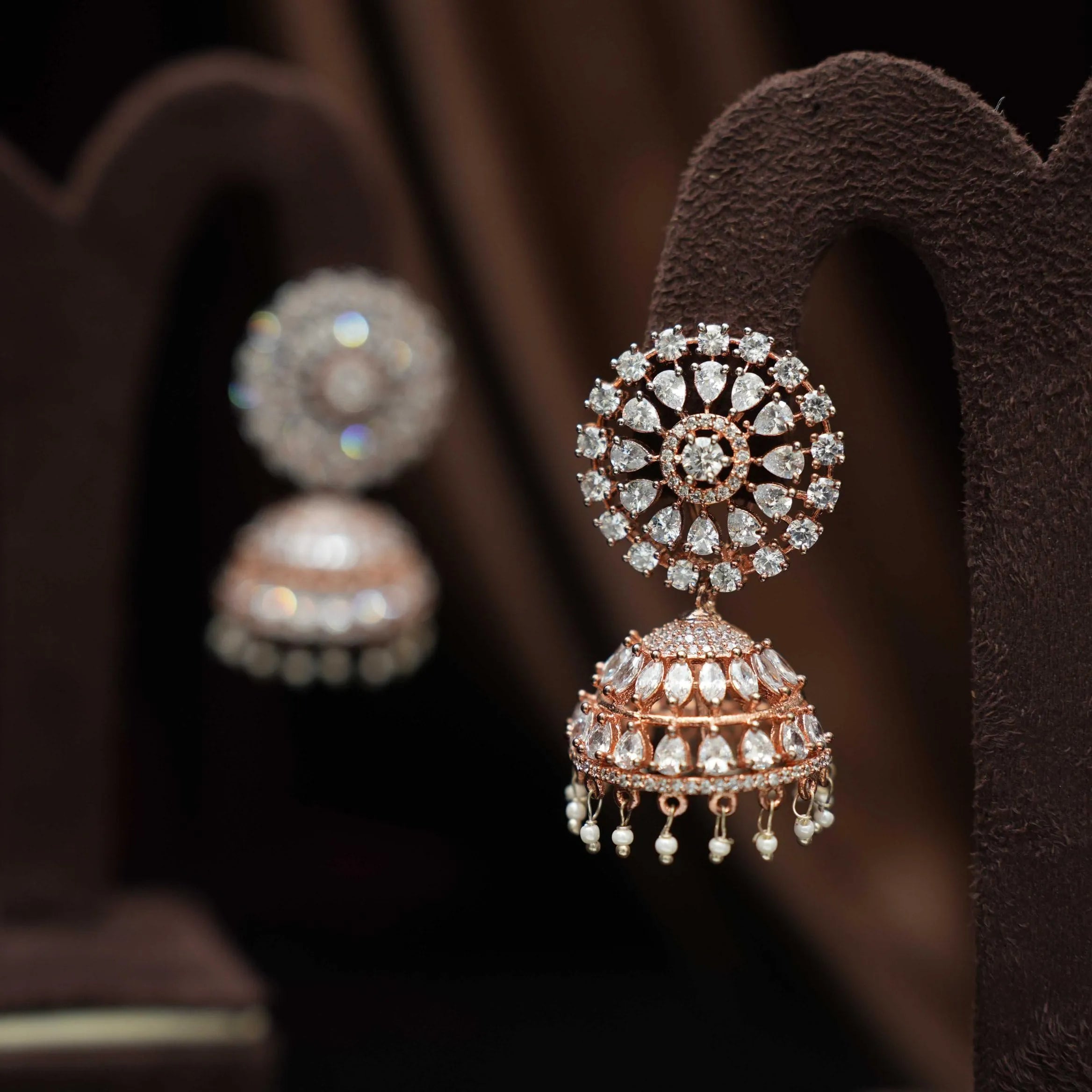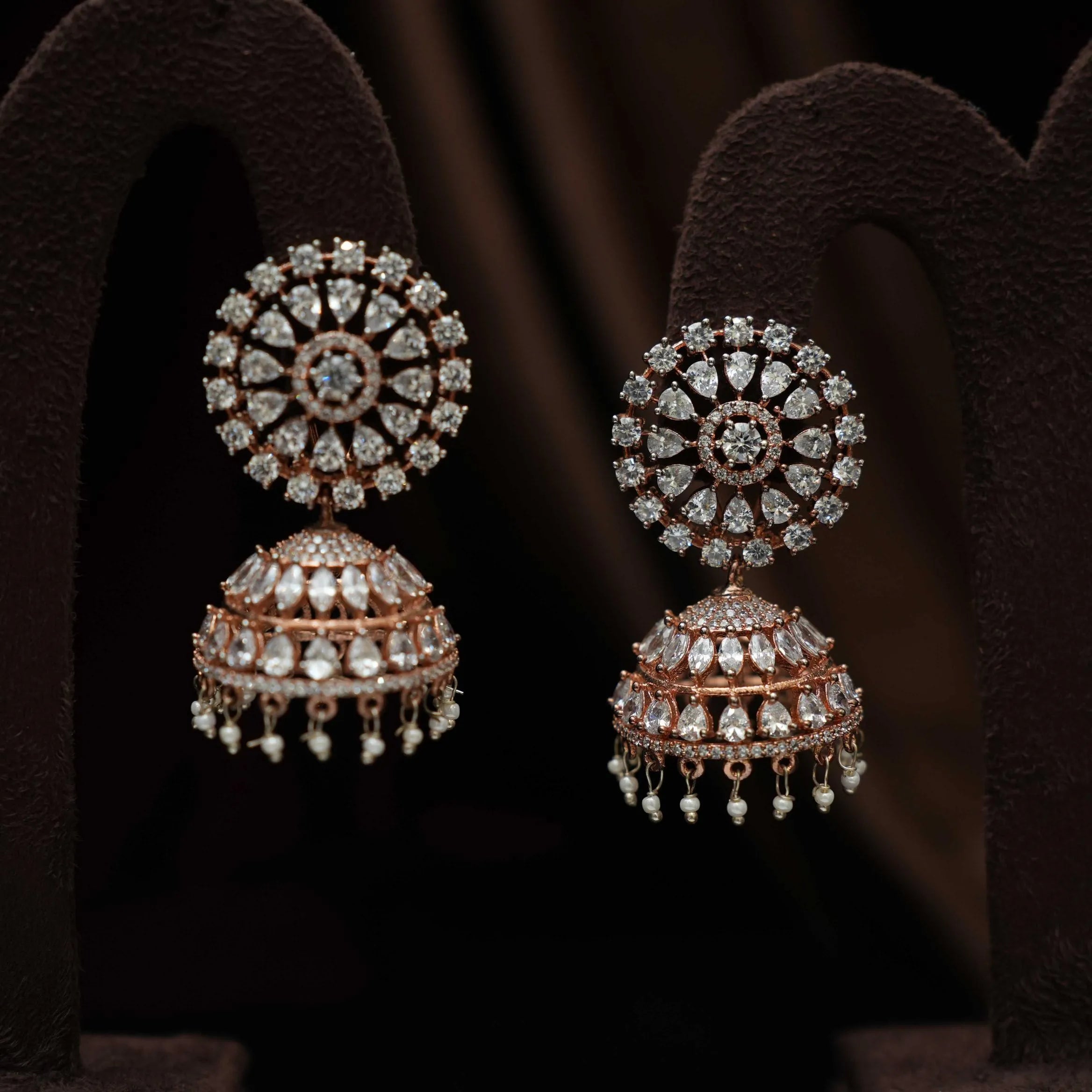 A beautiful and traditional designer jhumka earrings in peacock handcrafted with zircon stones.