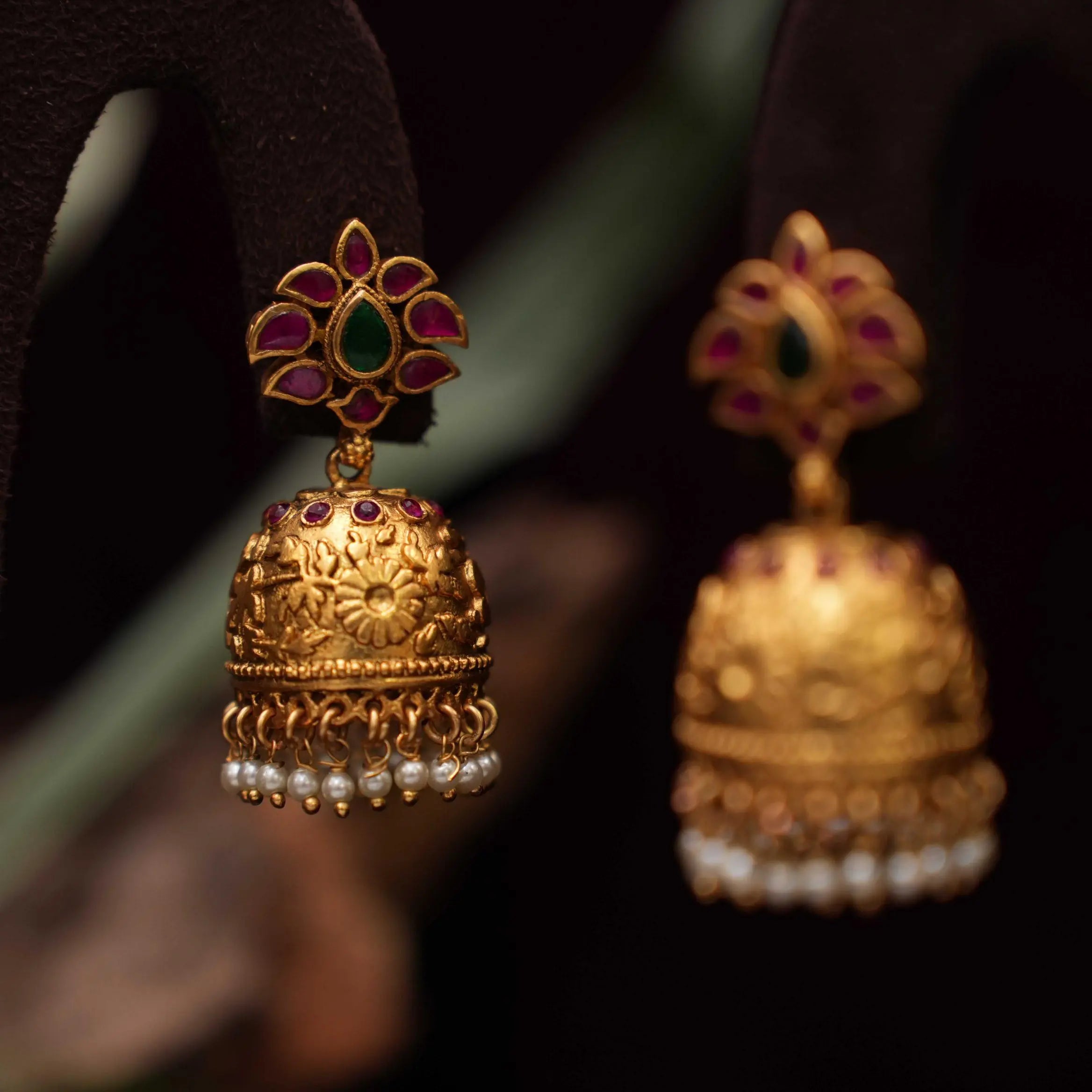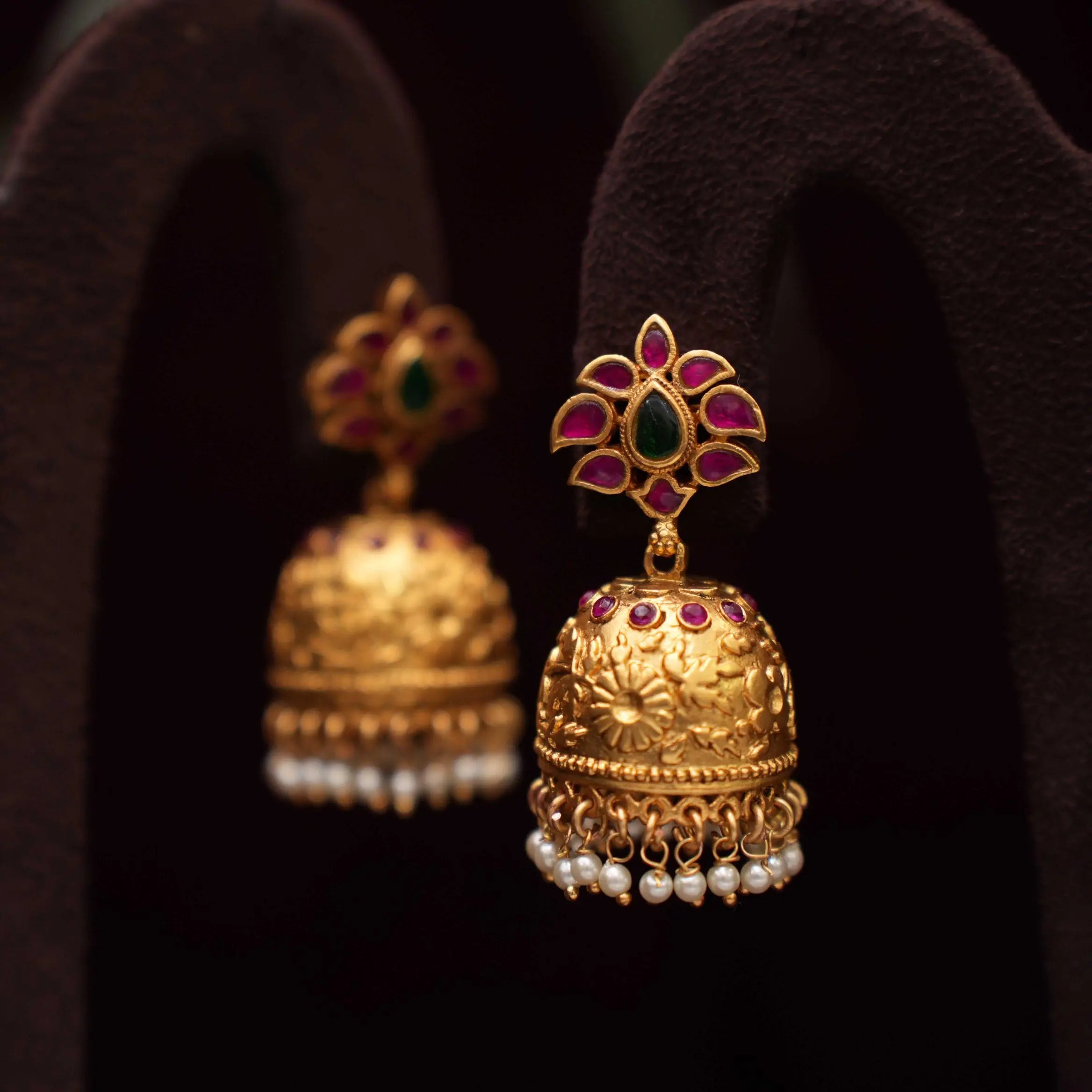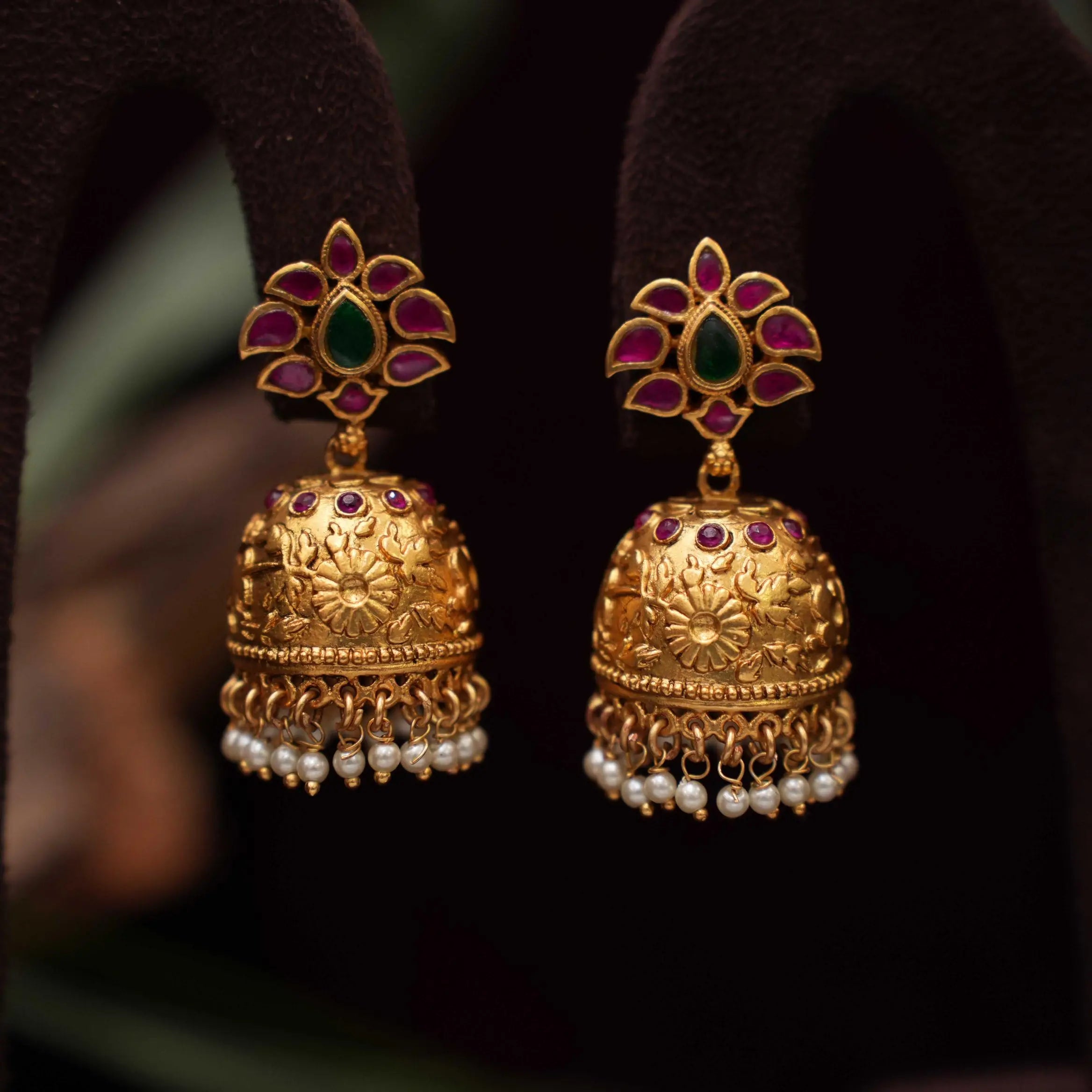 A casual antique jhumka earrings in floral motifs studded with kemp stones adorn by pearls.