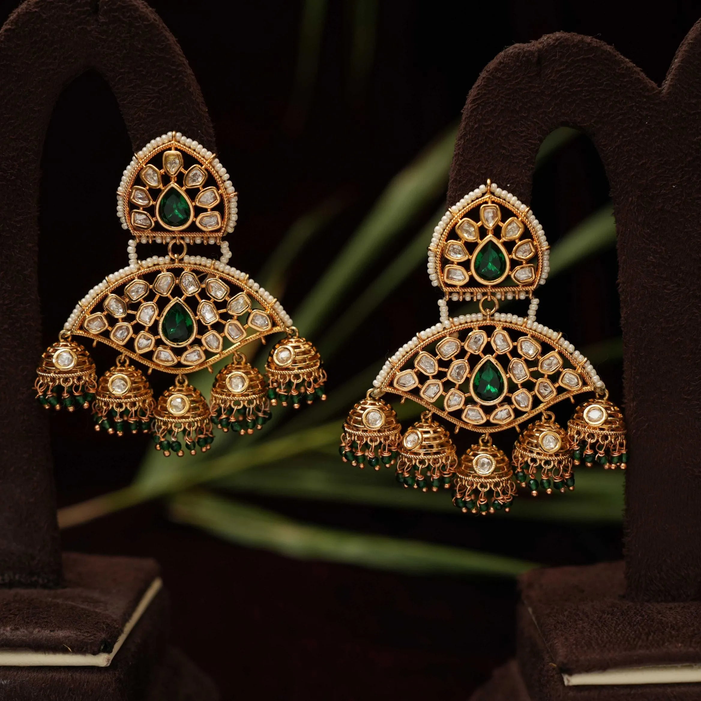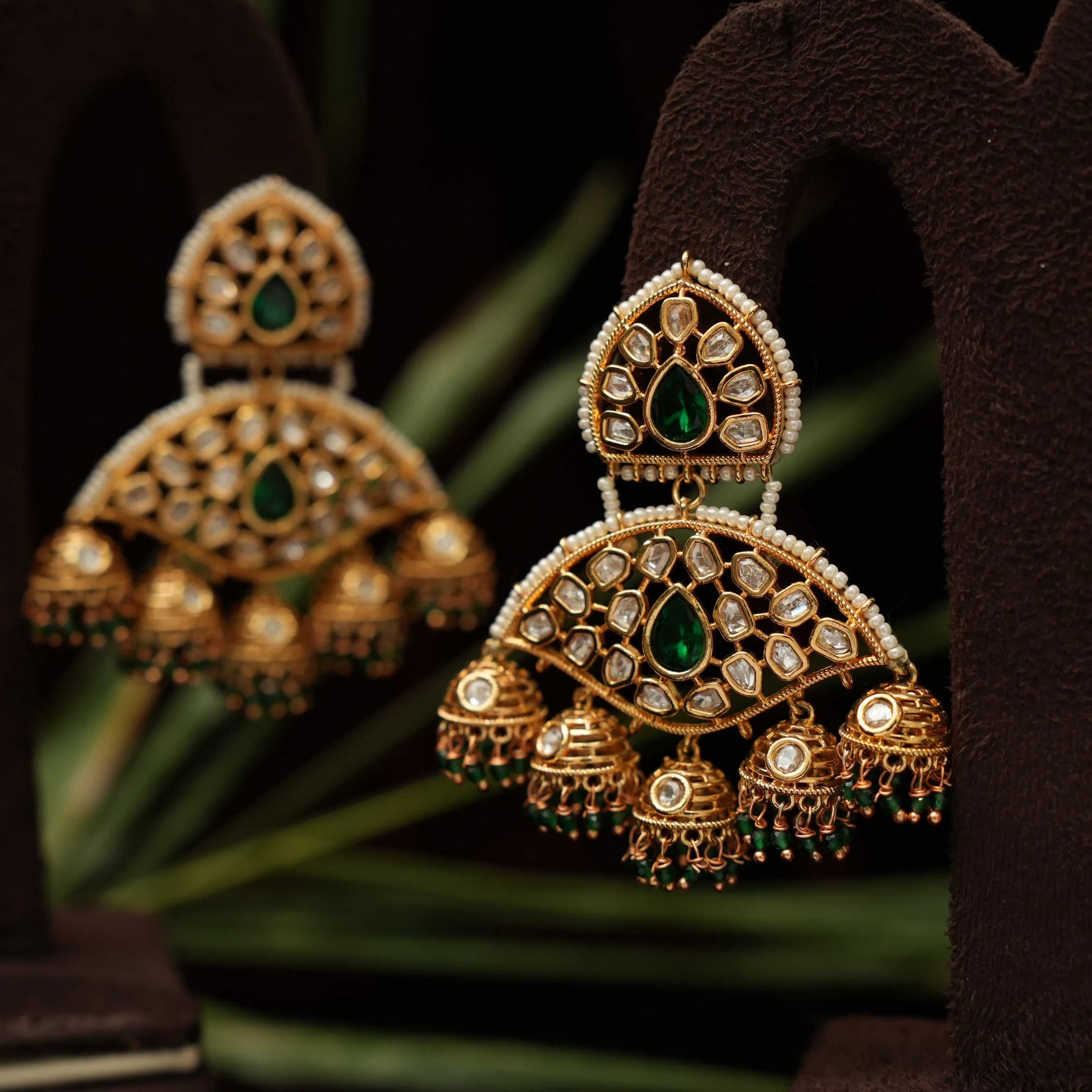 A beautiful designer jhumka earrings studded with polki stones and pearls.