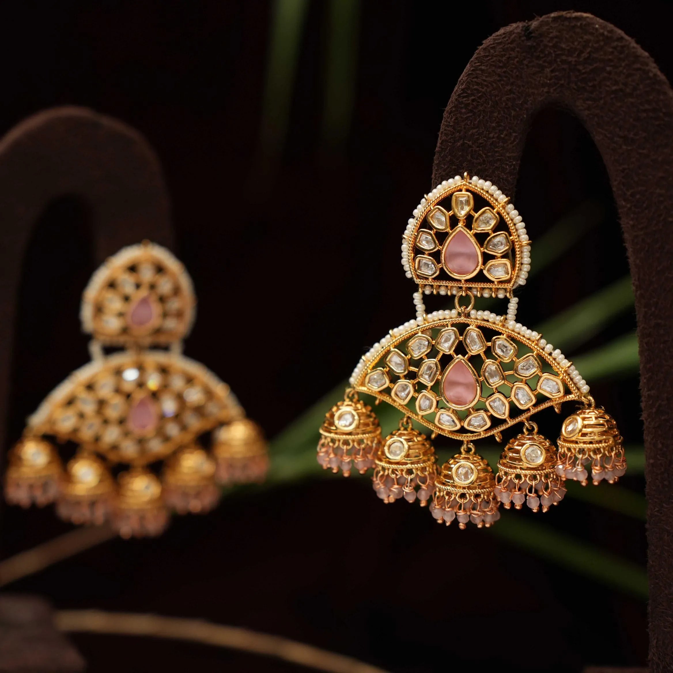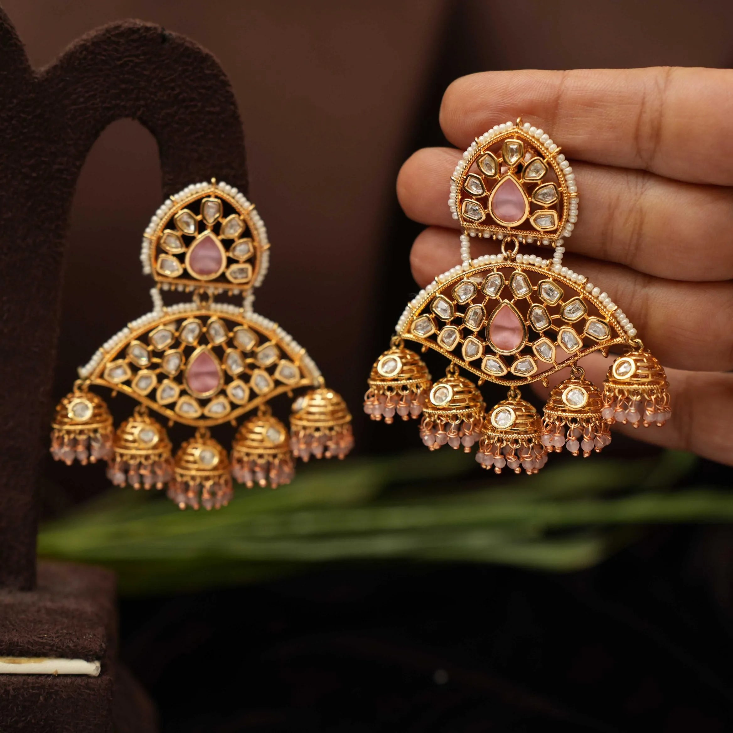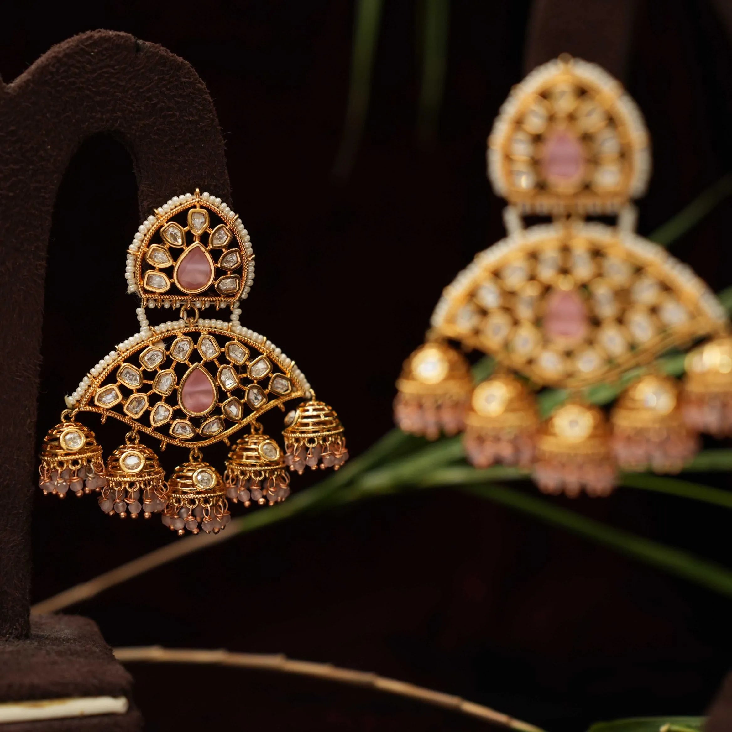 A beautiful designer jhumka earrings studded with zircon stones and pearls.