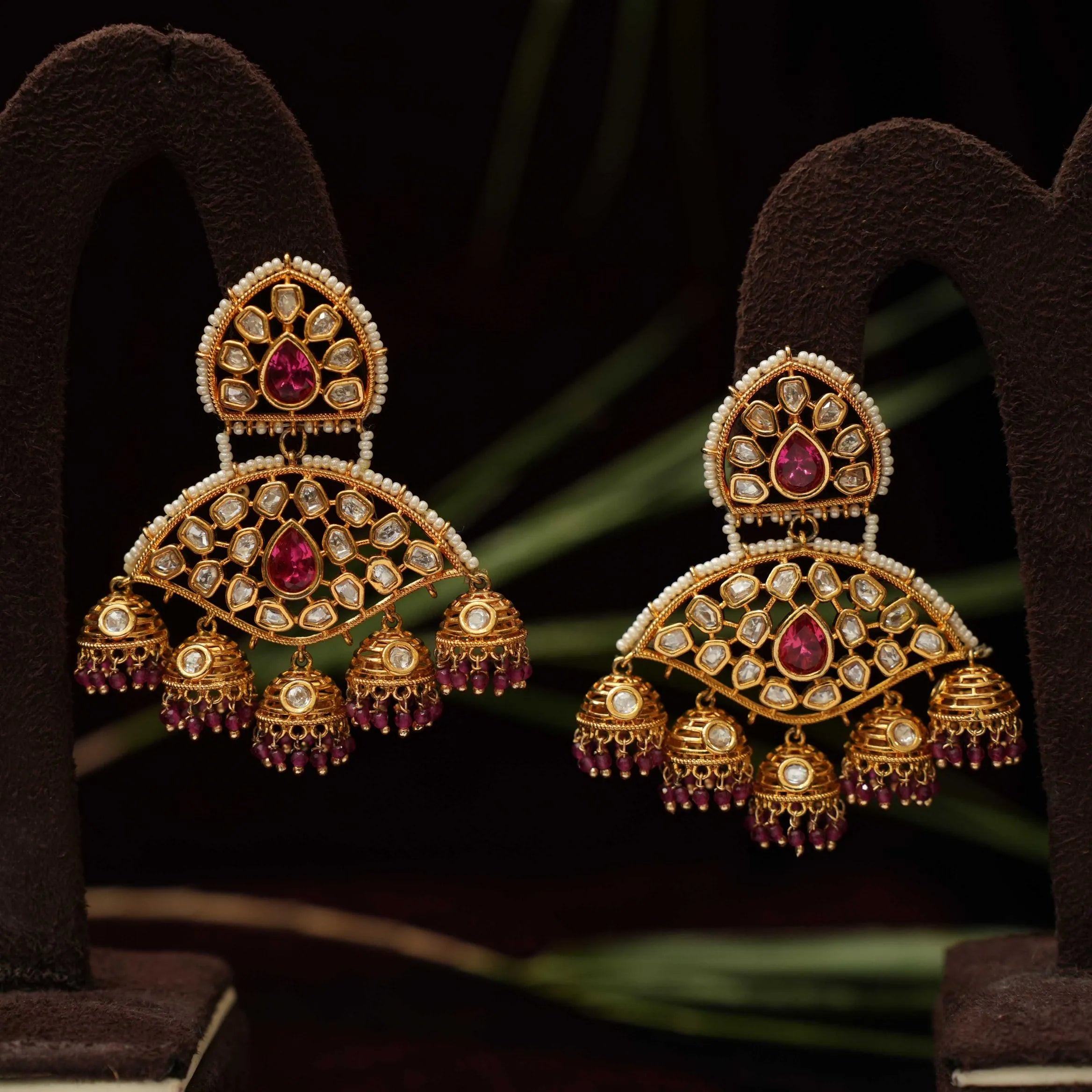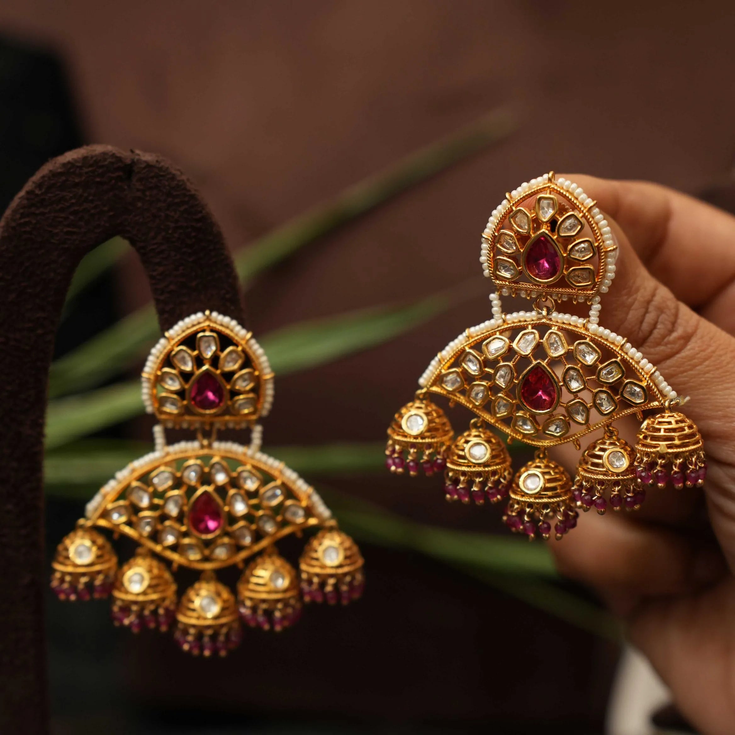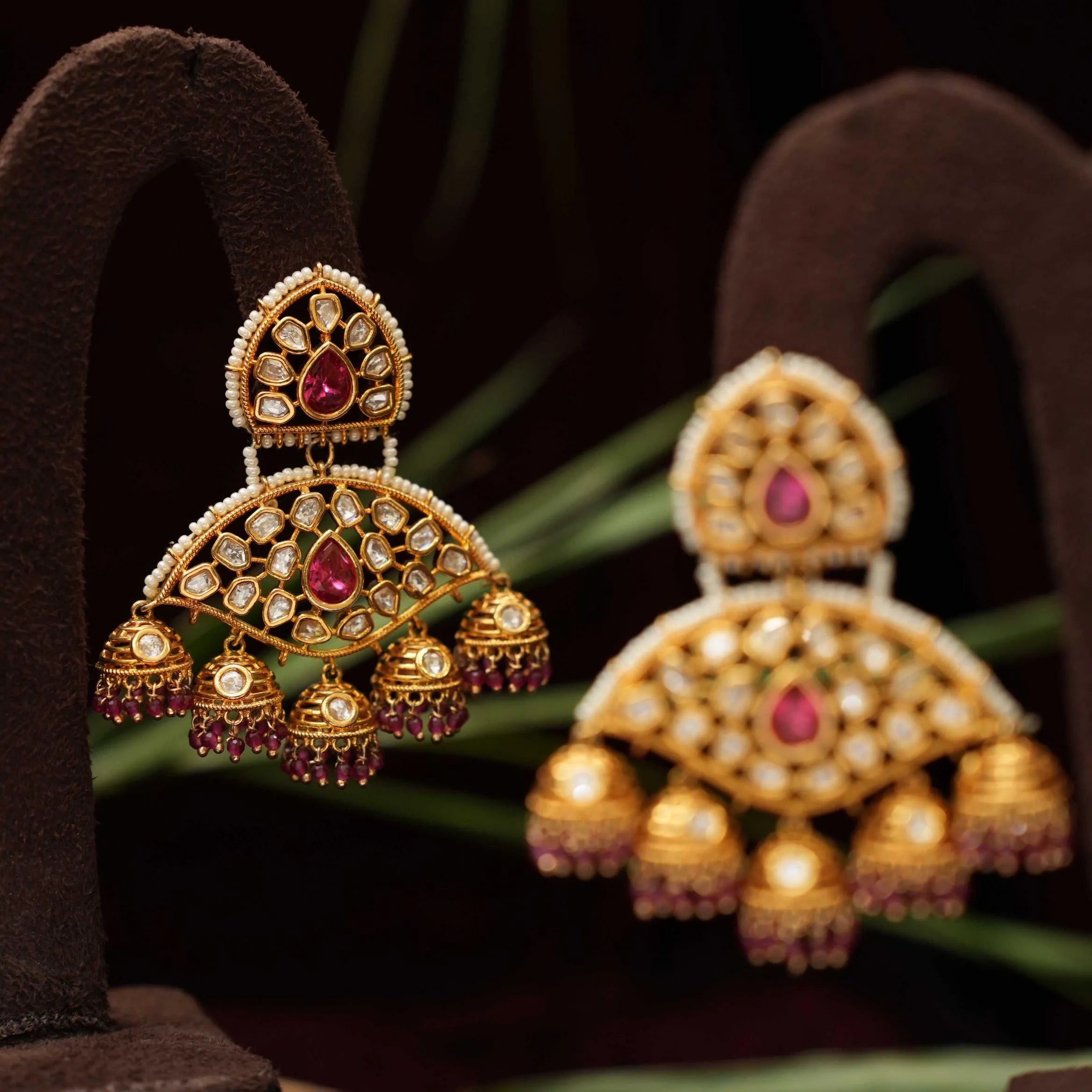 A beautiful designer jhumka earrings studded with polki stones and pearls.