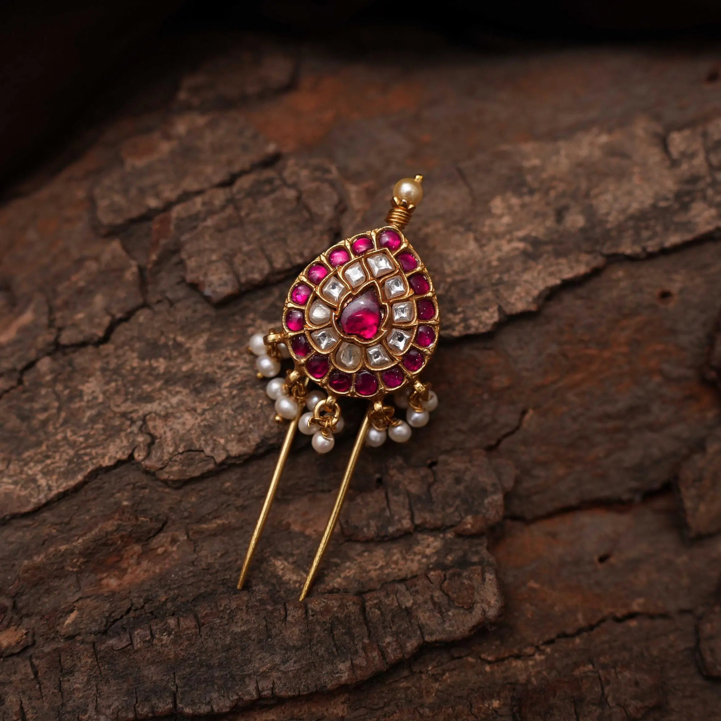 A stunning silver hair pin in geometrical motif studded with kundan stones adorn with pearls.