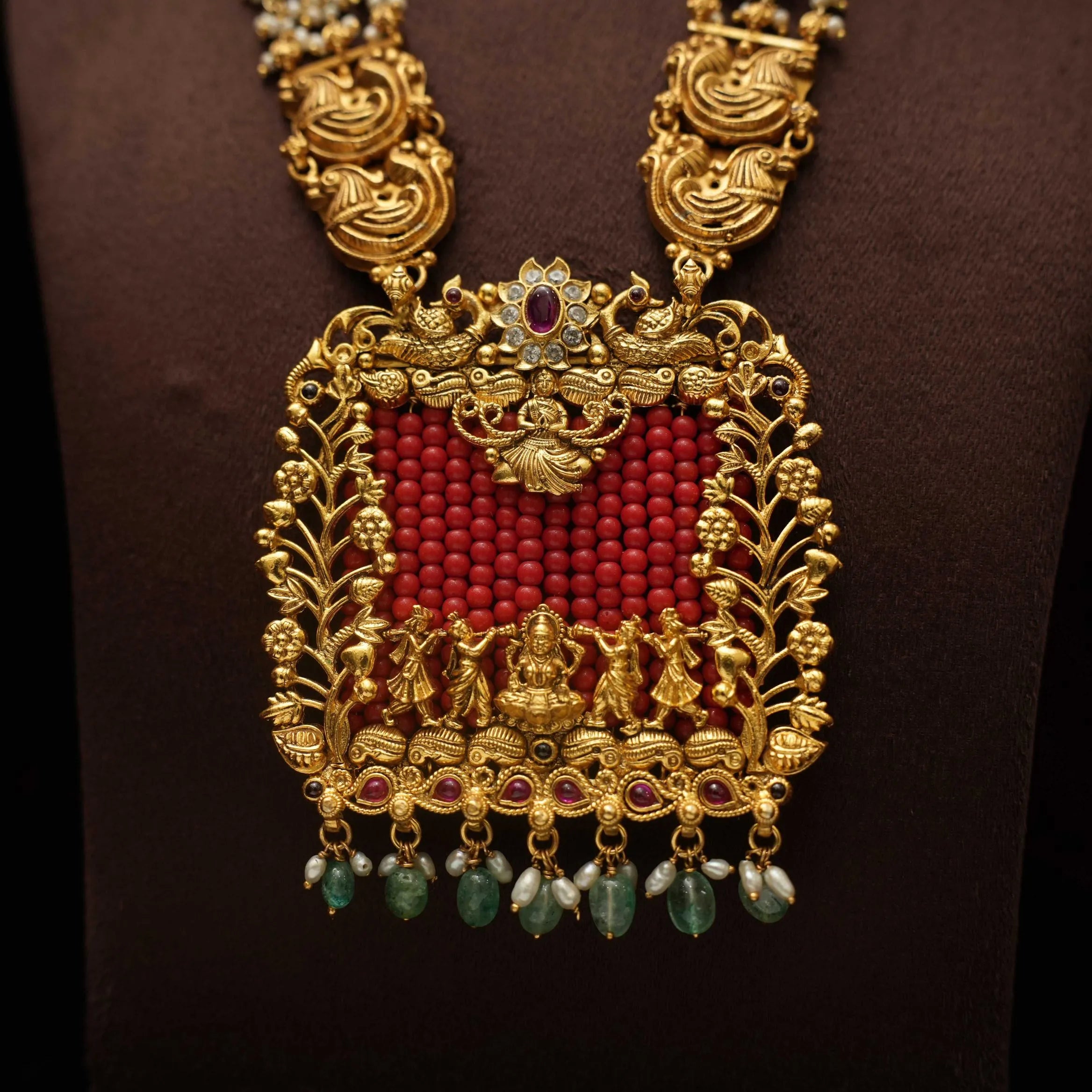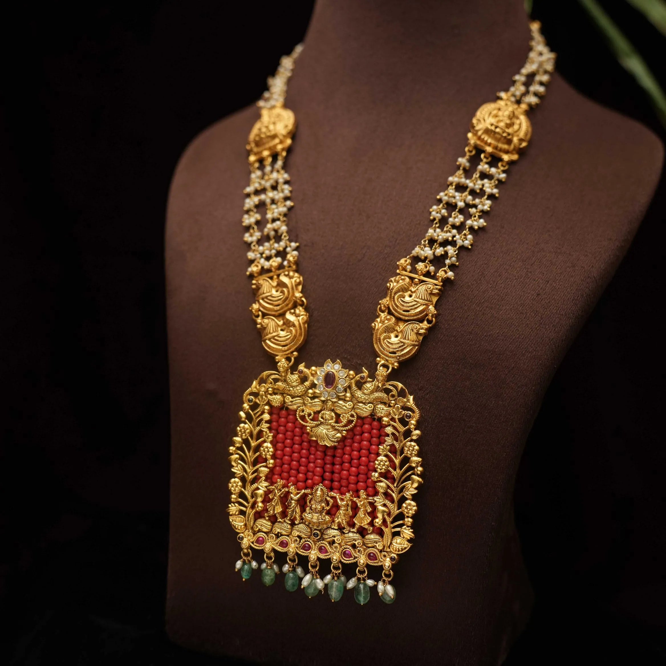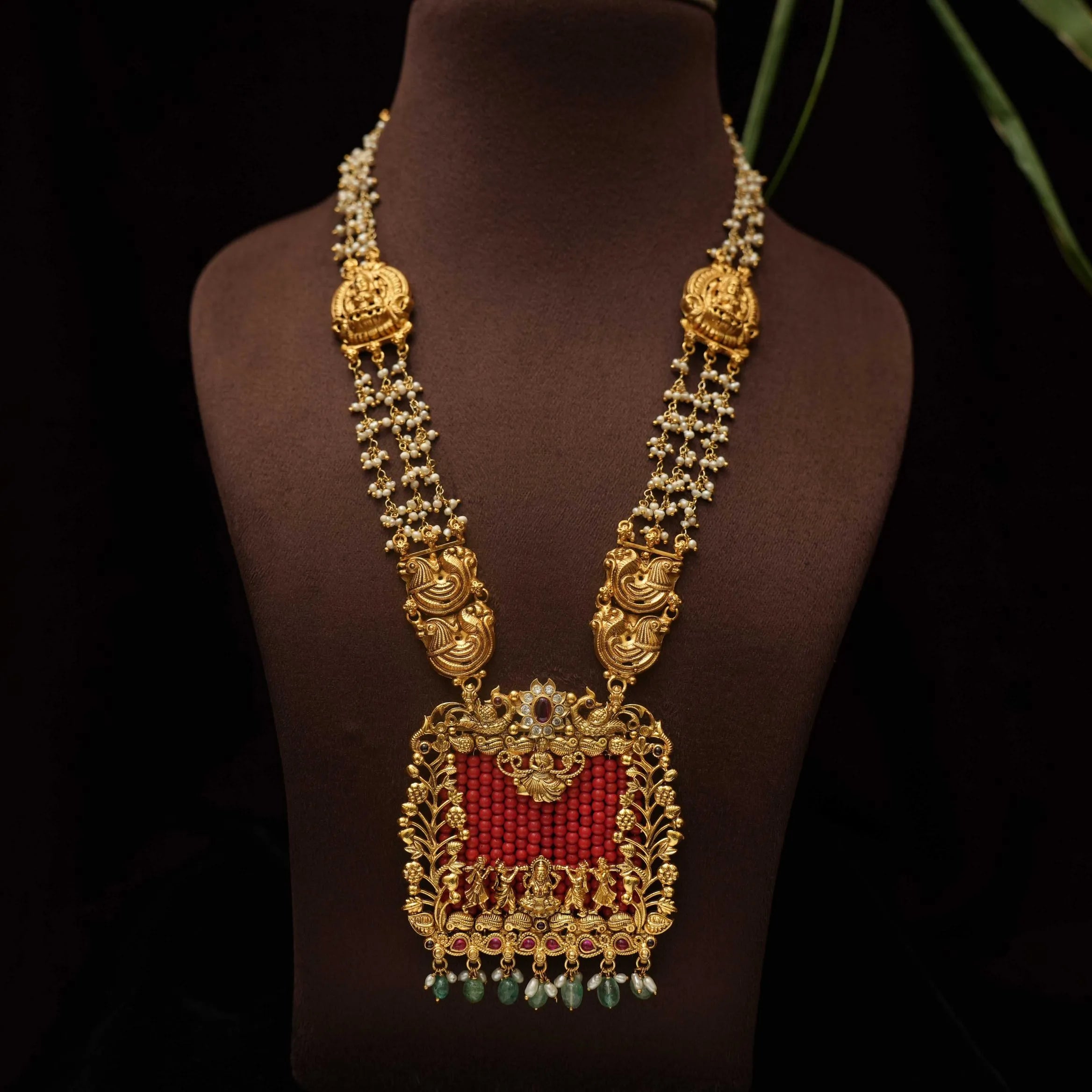 A traditional silver necklace handcrafted with pearls, Goddess motif and corals adorn with green beads.