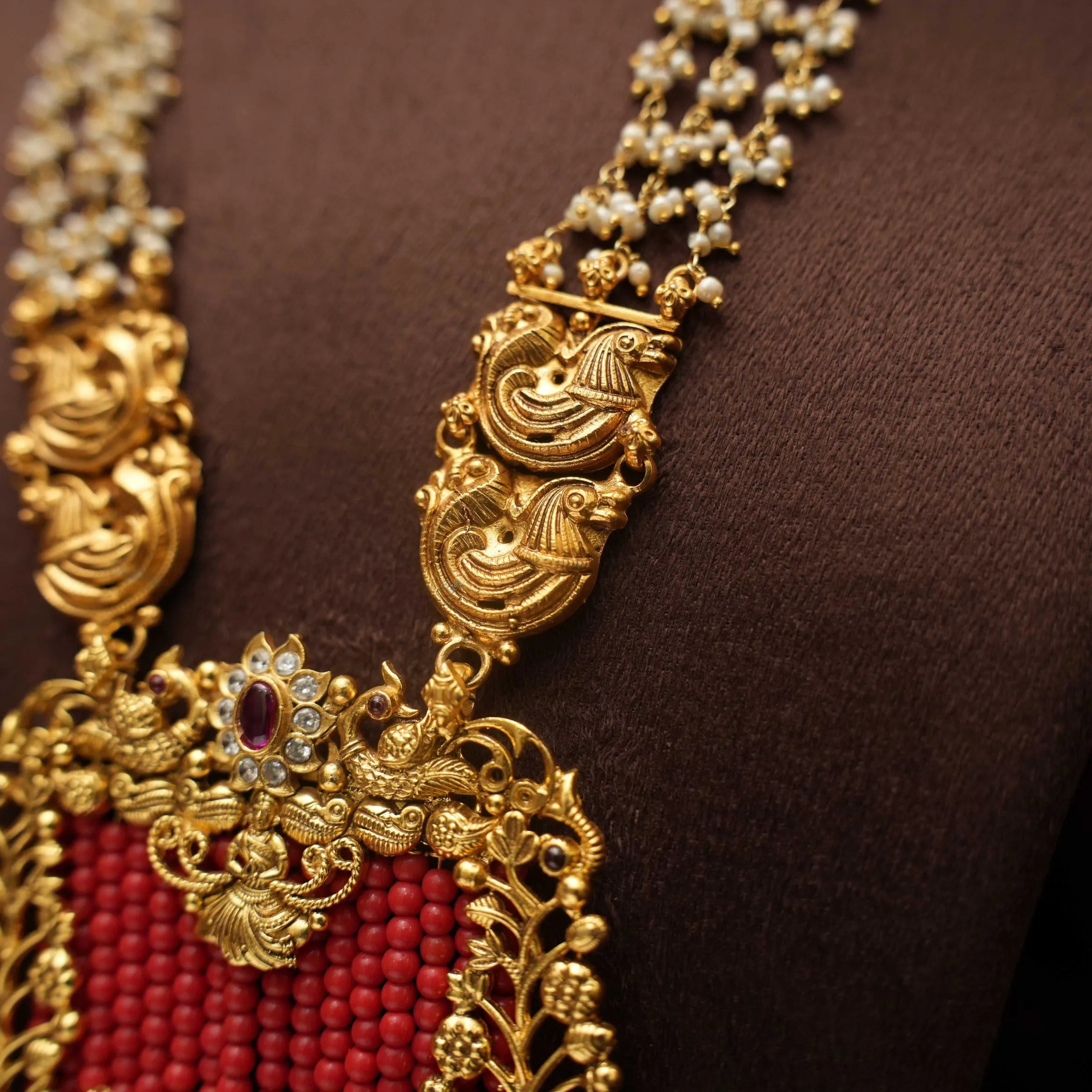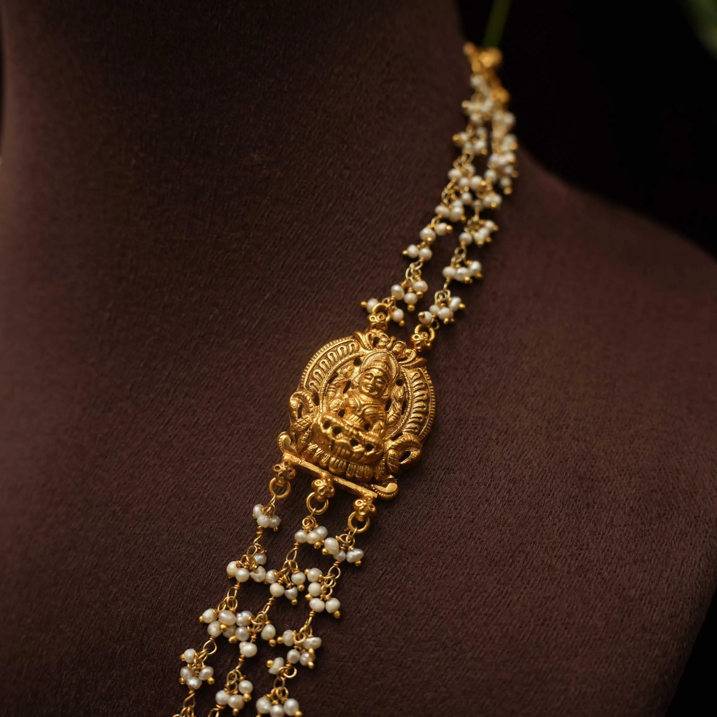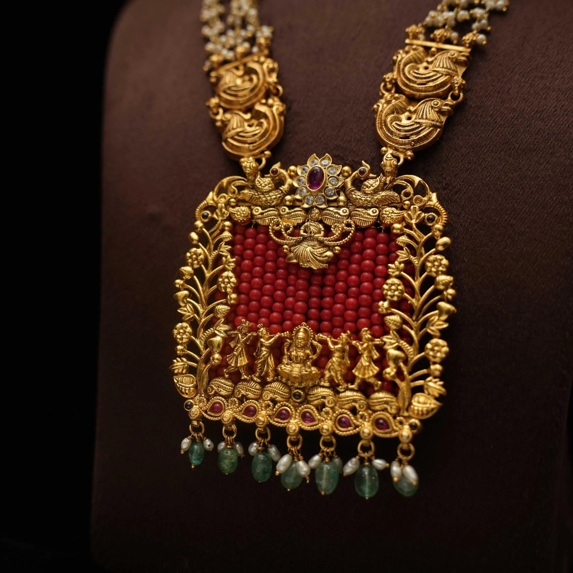 A traditional silver necklace handcrafted with pearls, Goddess motif and corals adorn with green beads.