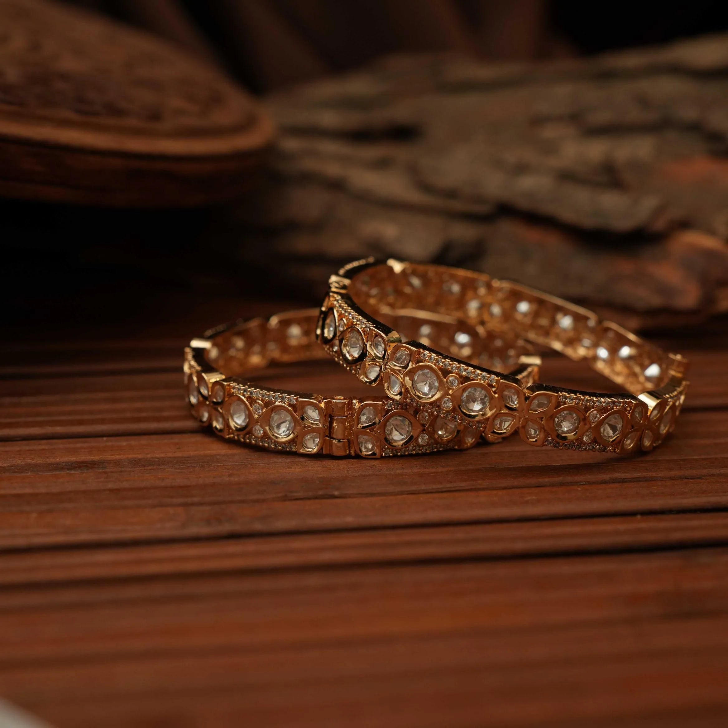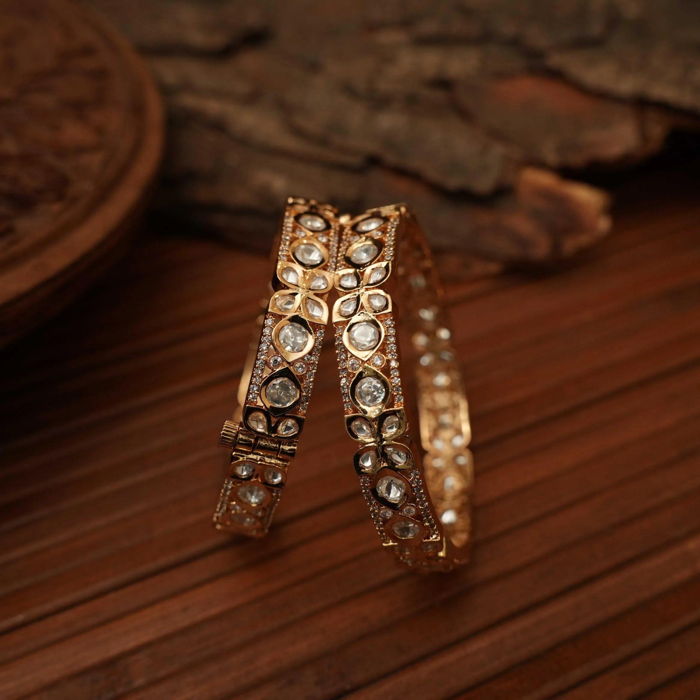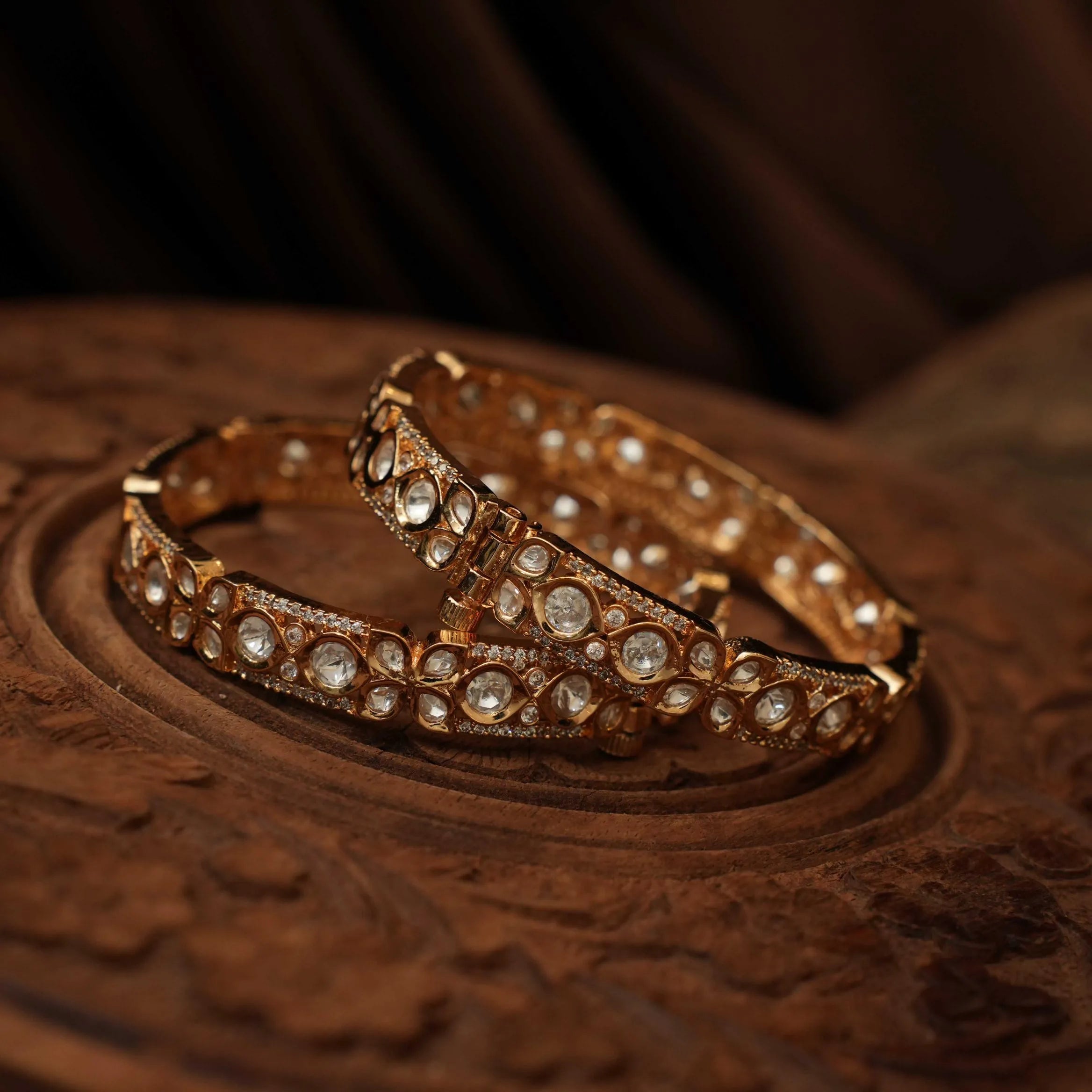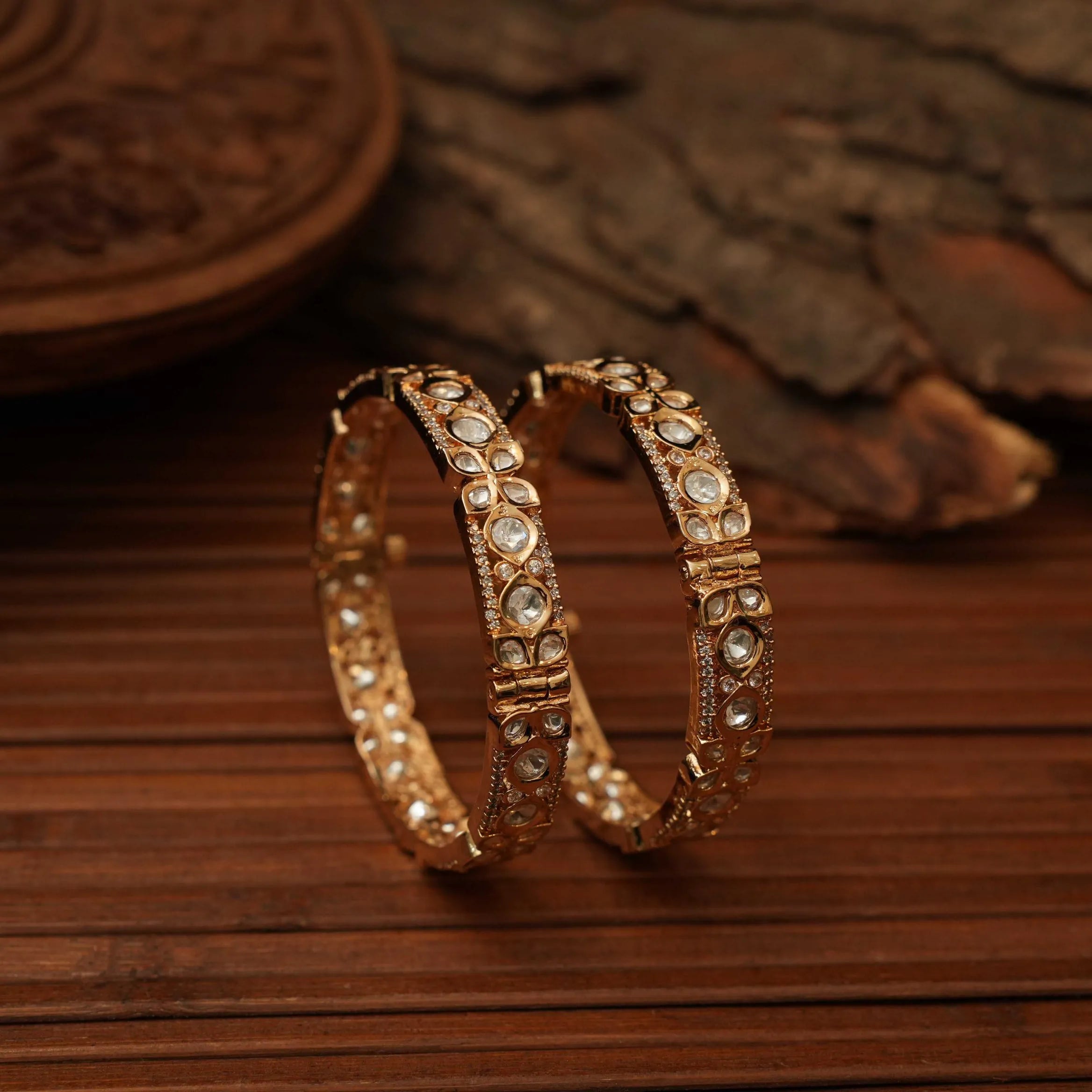 An elegant pair of bangles adorn with polki stones highlighted by pearls.