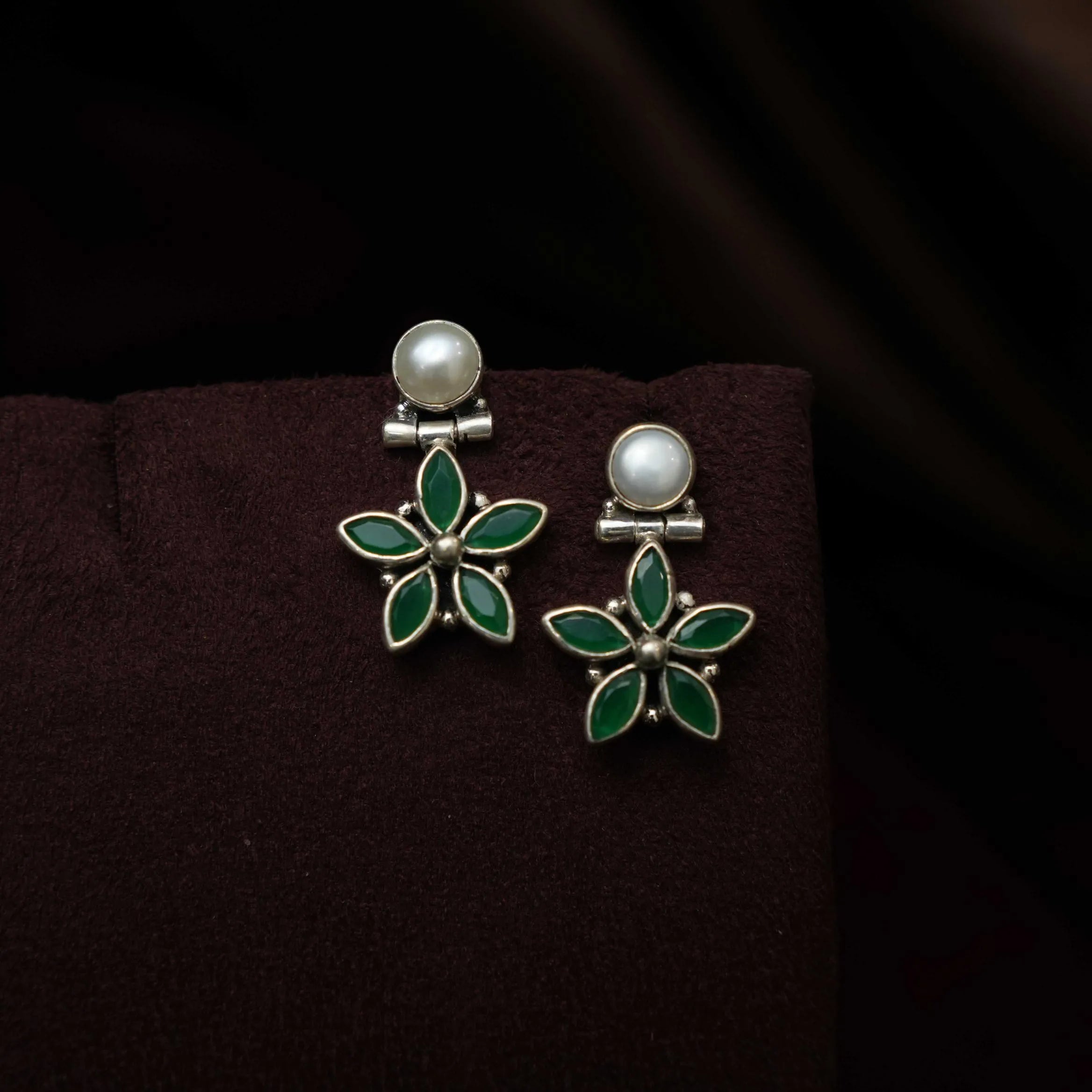 A regal silver oxidised in floral motif studded with pearl and green stones.