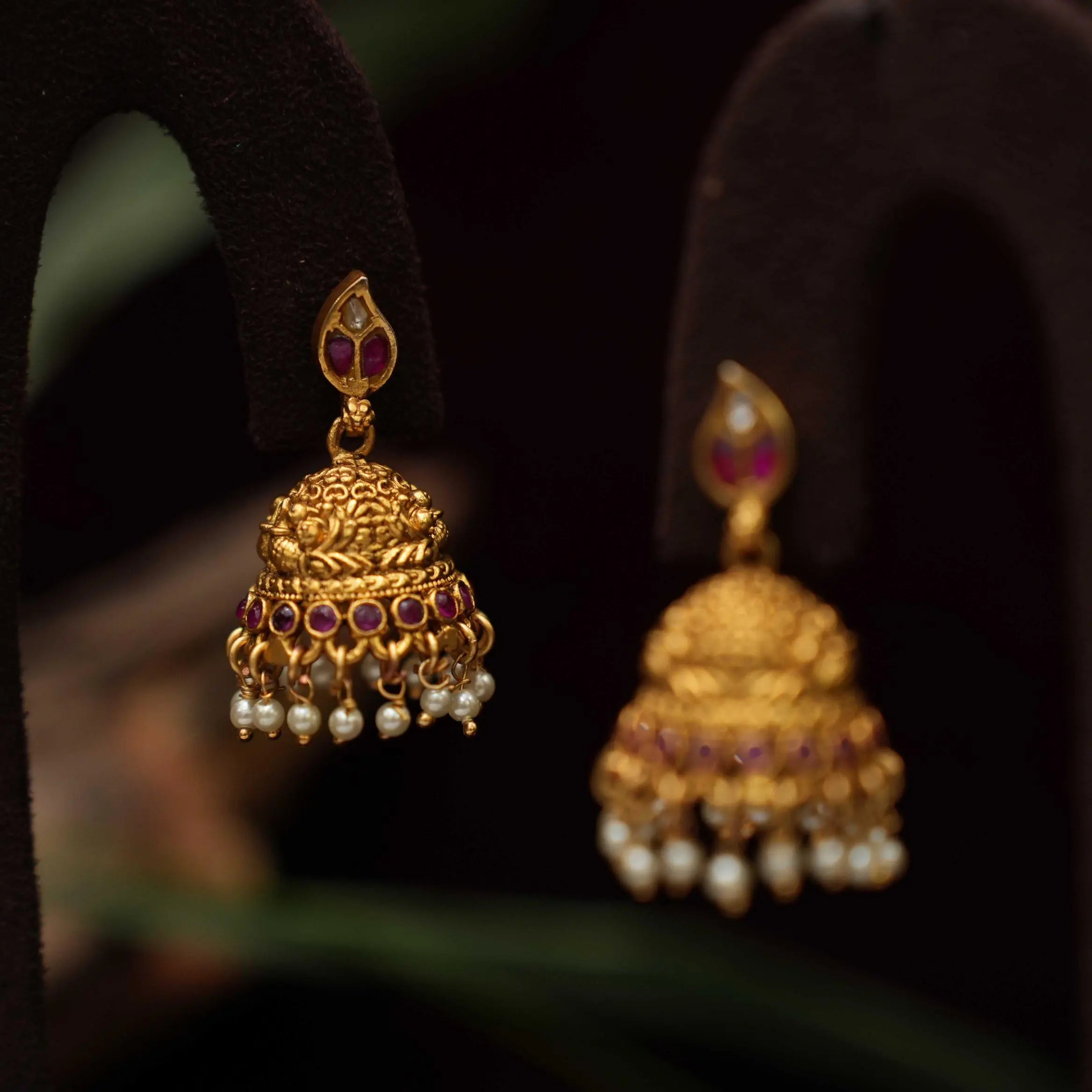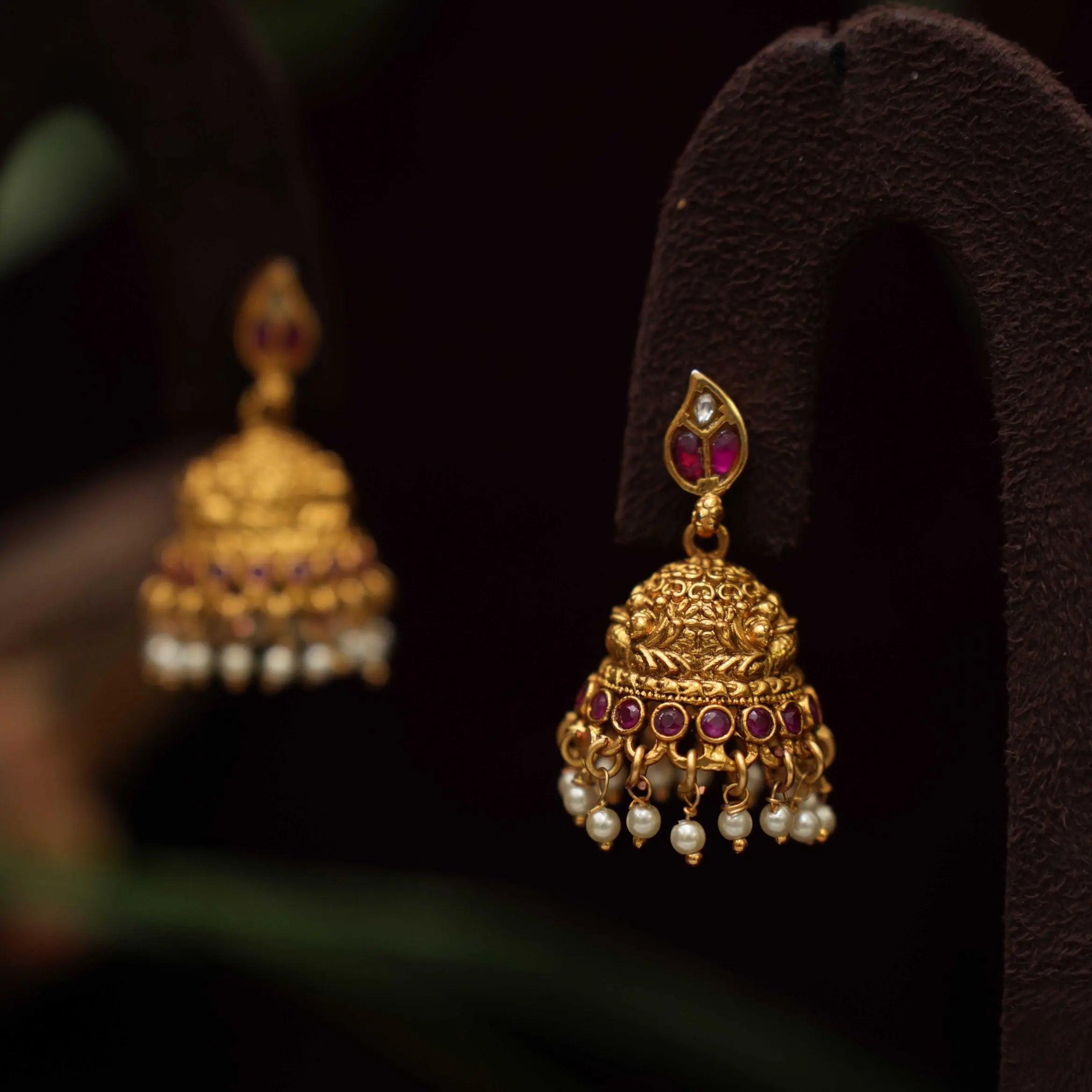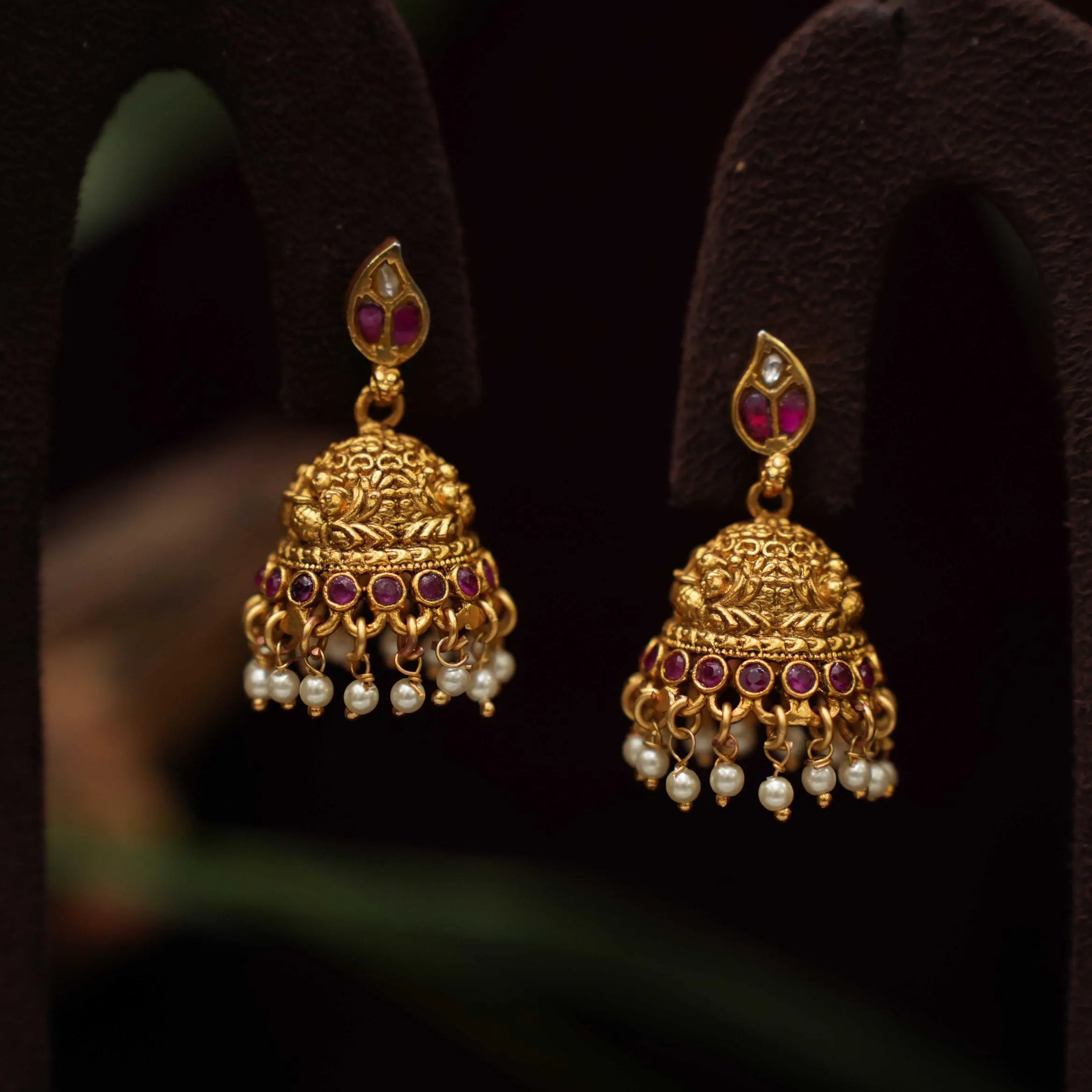 A beautiful antique earrings in leaf motif adorn with jhumka studded with kemp stones and pearls.