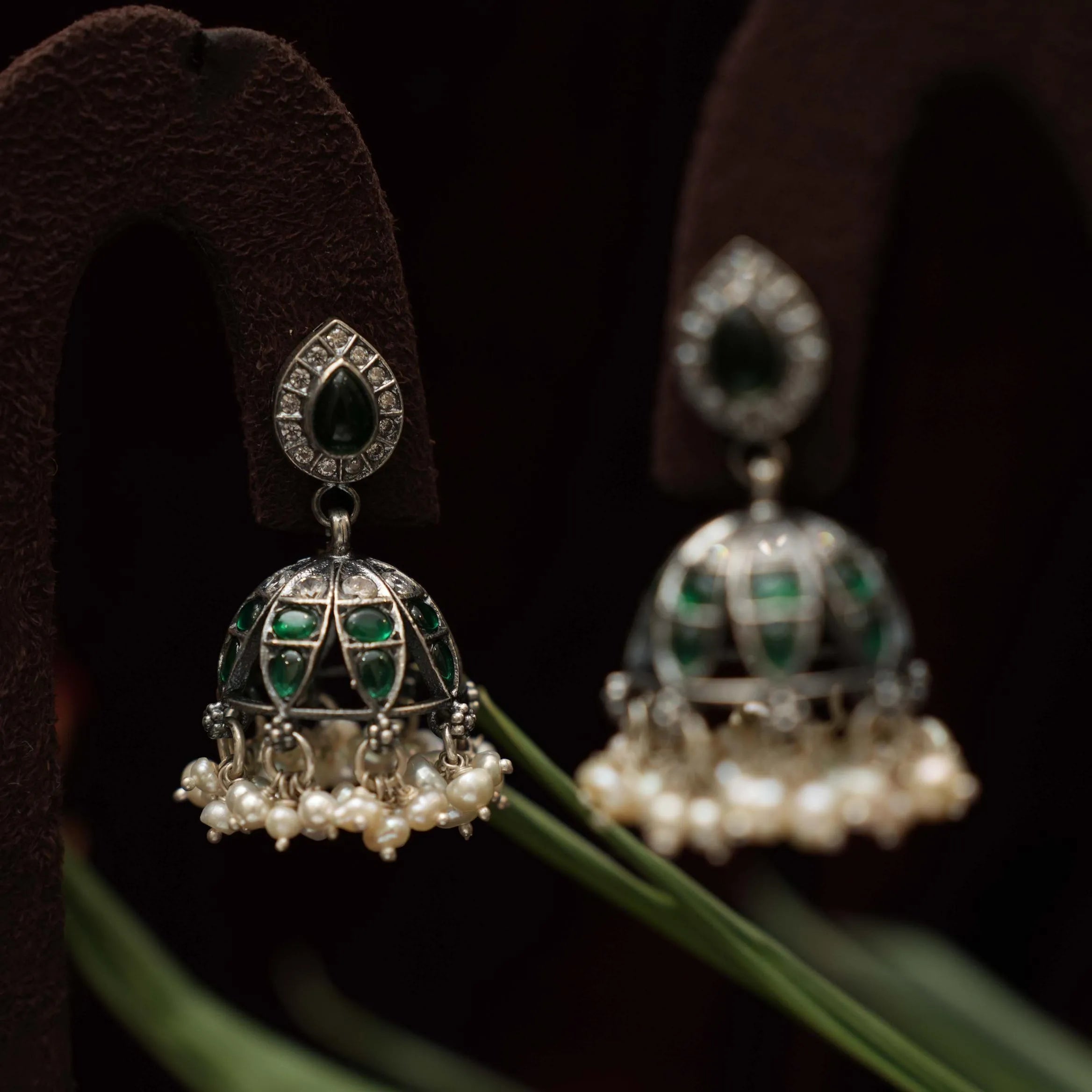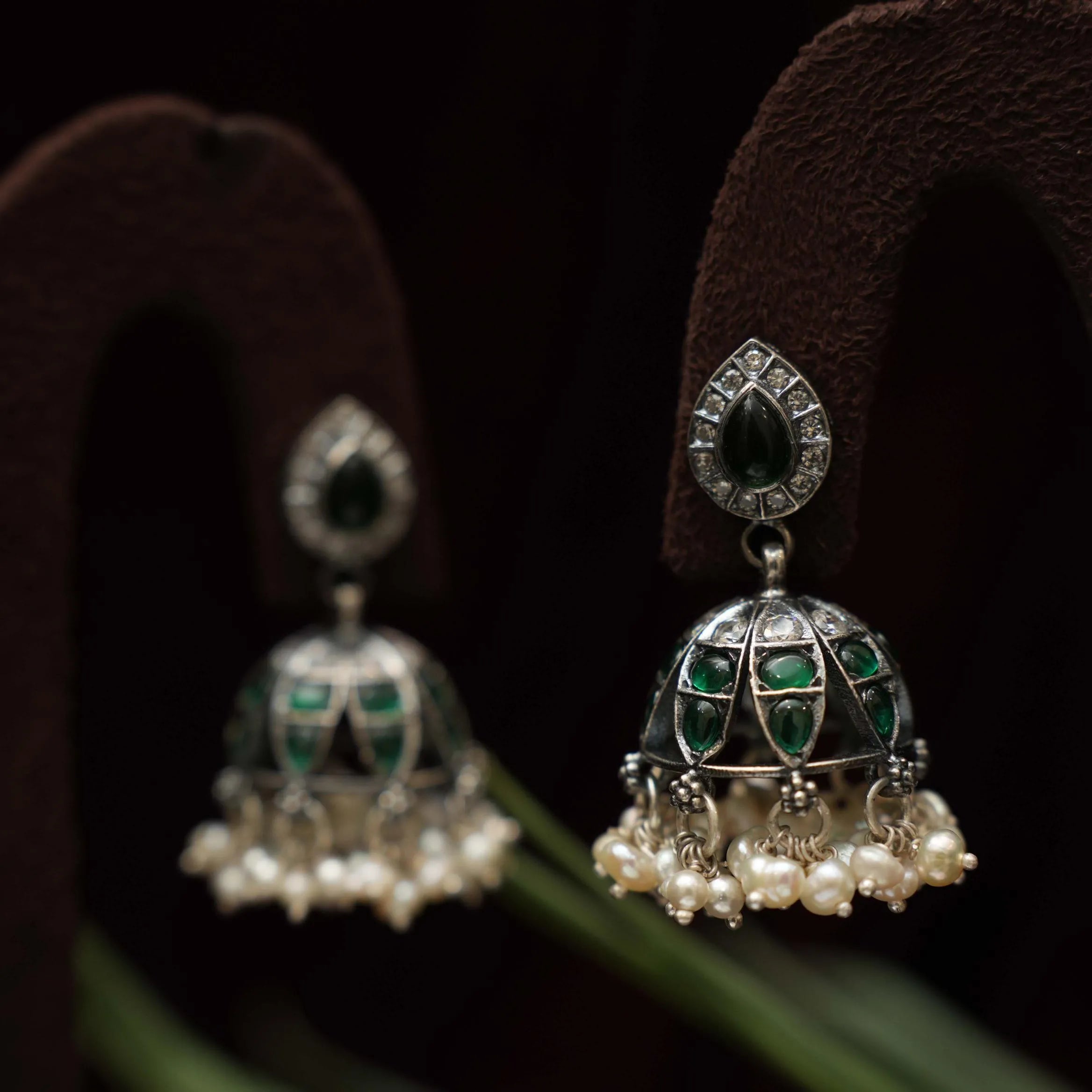 A beautiful silver oxidised silver jhumka earrings adorn with green stones & pearls.