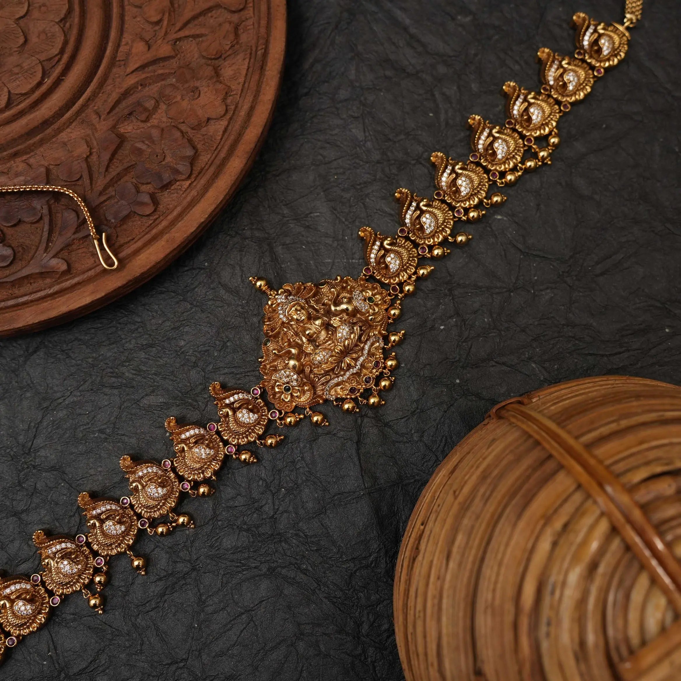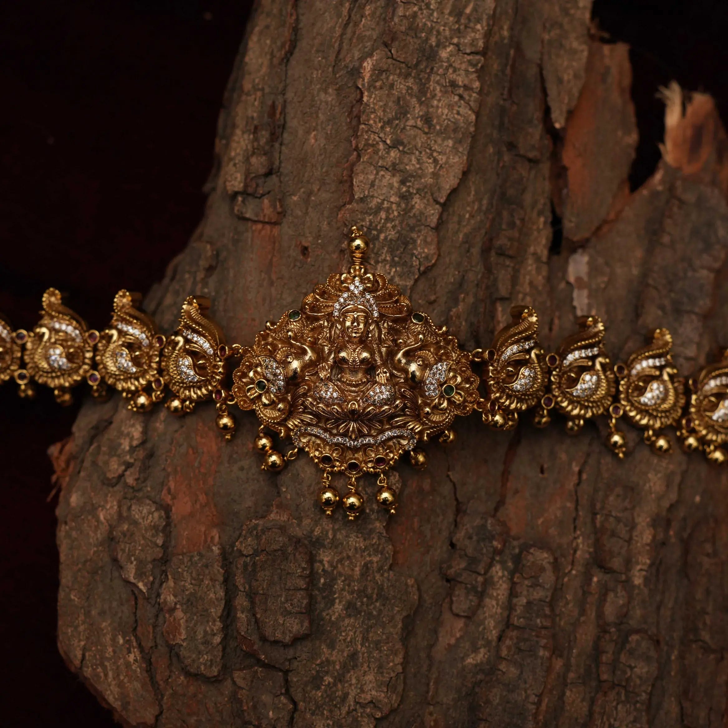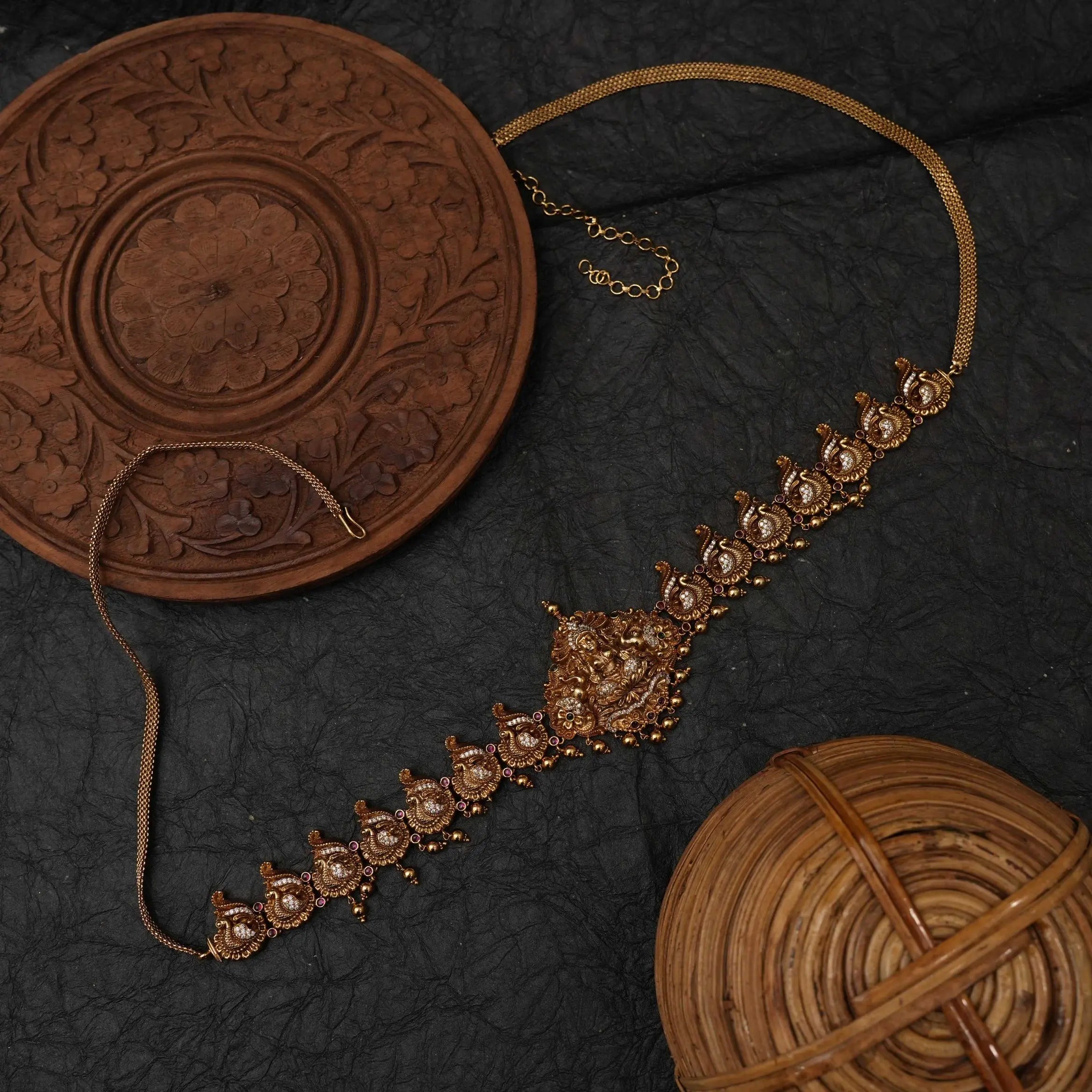 A beautifully handcrafted antique nagas-finish hip belt that embodies the richness of traditional South Indian temple jewellery. At the centre sits a finely sculpted Goddess Lakshmi, symbolising prosperity and grace. She is surrounded by elaborate nakshi carvings, featuring floral motifs and mythological elements that highlight the depth and artistry of skilled craftsmanship. The belt showcases a uniform pattern of intricately detailed designs across its length, giving it a balanced and regal appearance. The lower edge is adorned with a delicate row of pearls and miniature bead clusters, adding graceful movement and enhancing its antique charm.