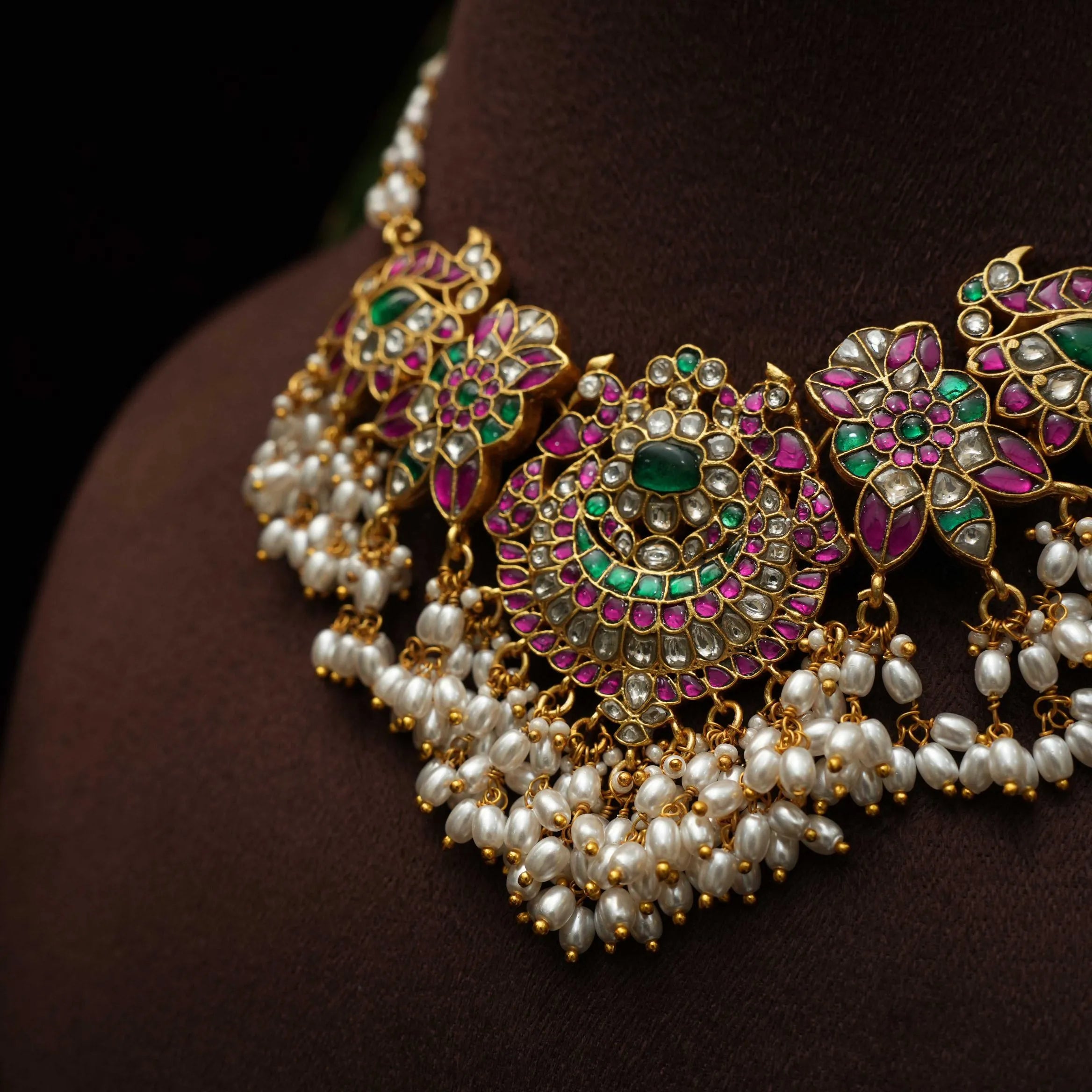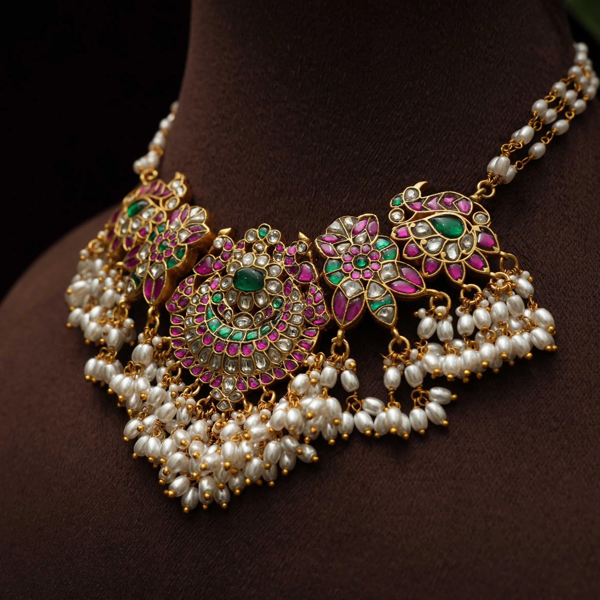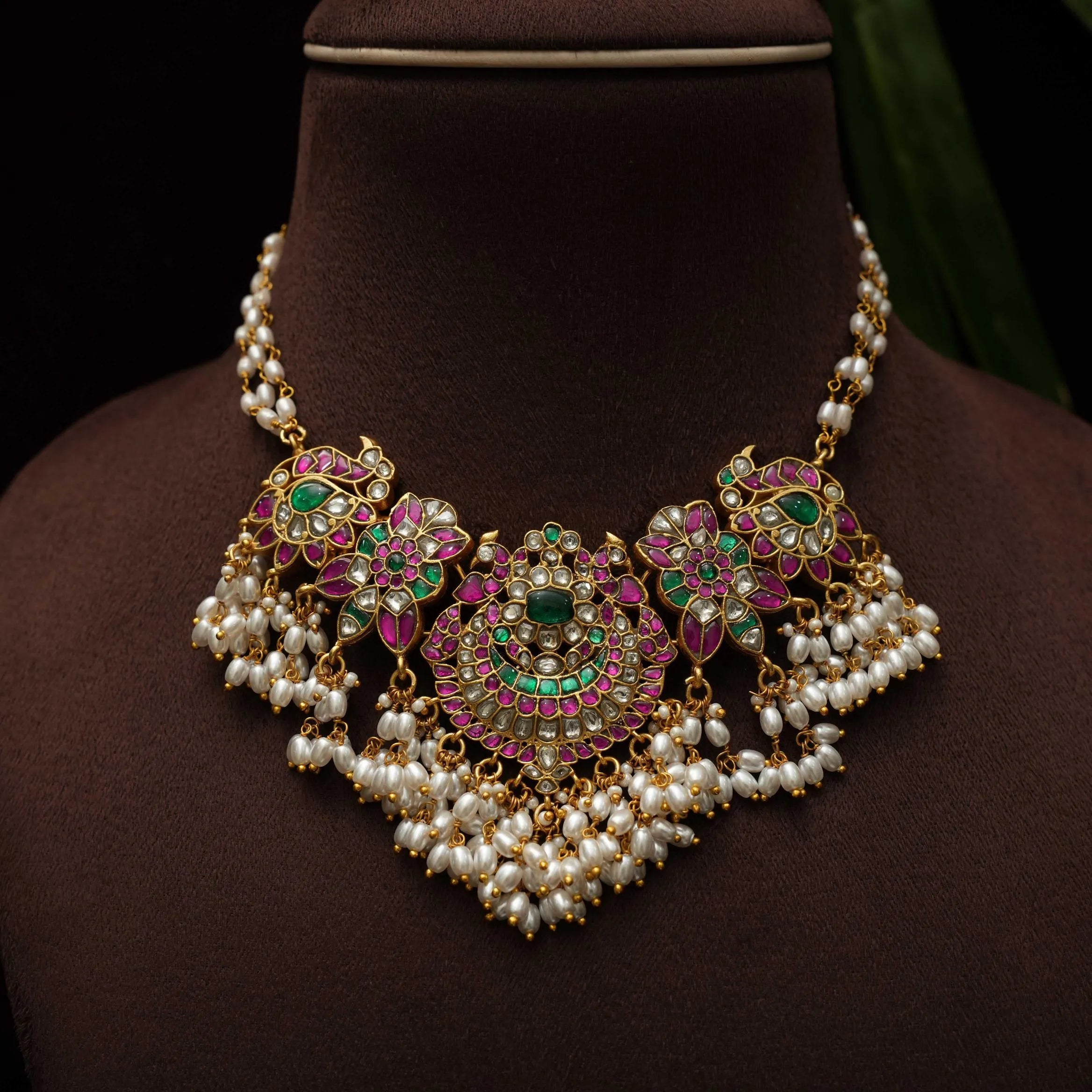 A statement necklace in peacock and floral motifs studded fine polki stones and rice water pearls.