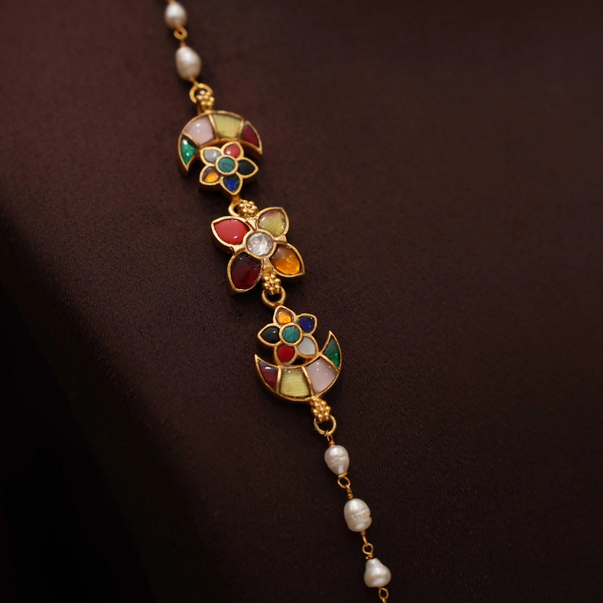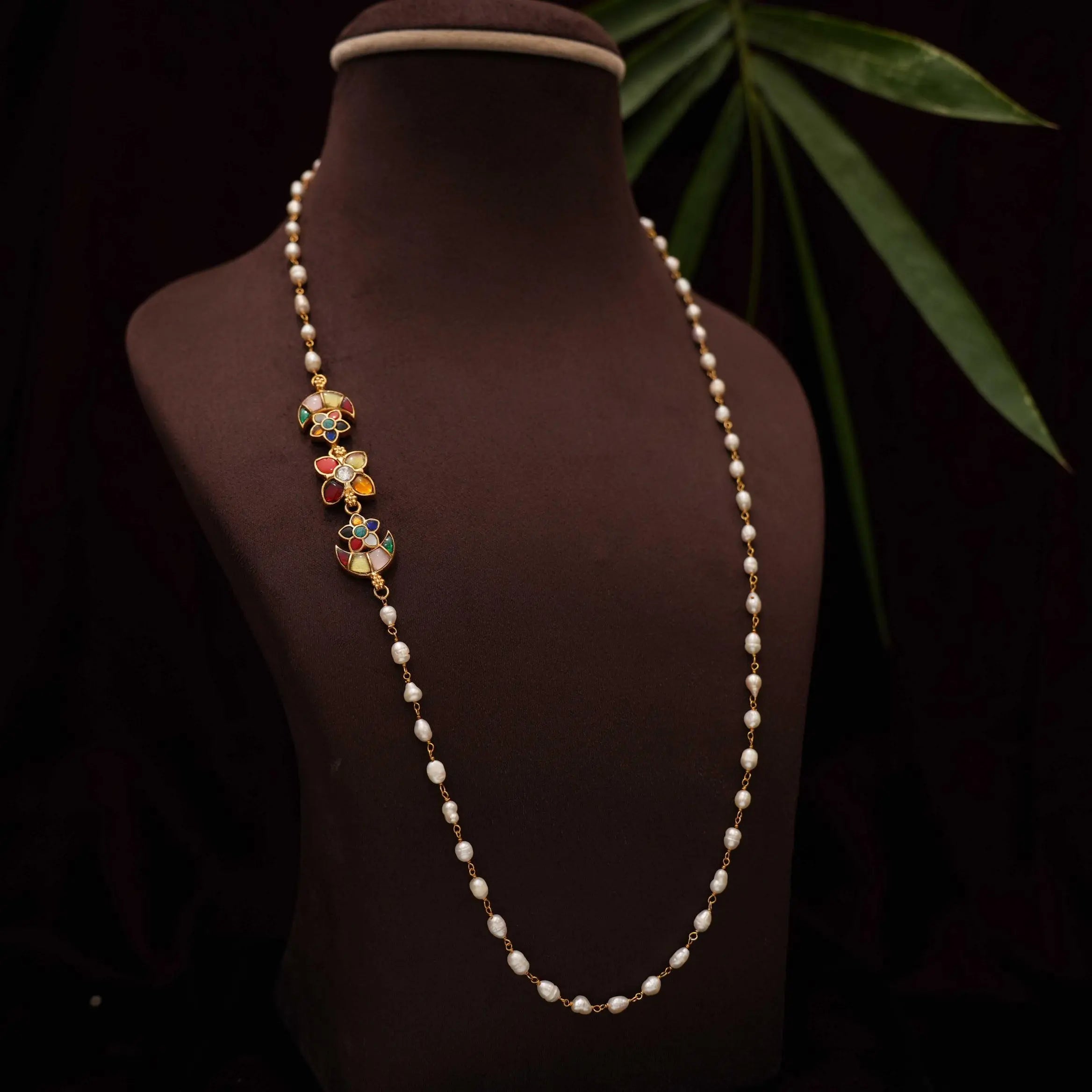 A simple and elegant silver necklace handcrafted in pearls paired to mugappu pendant studded with kundan stones.