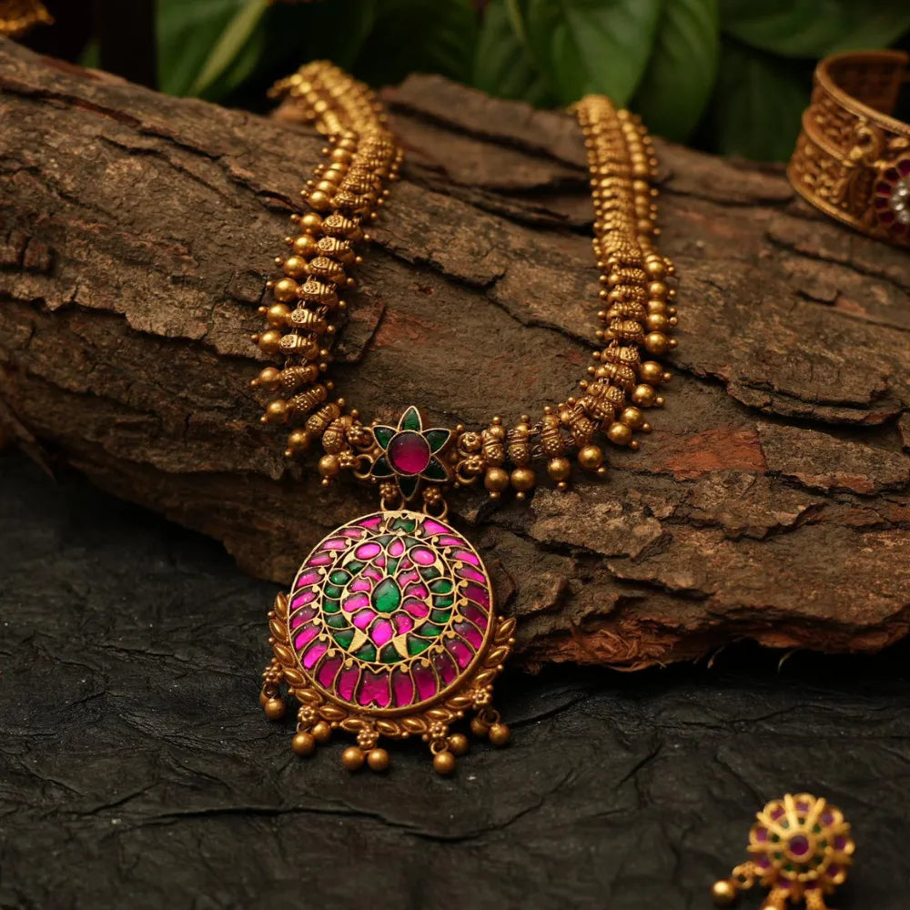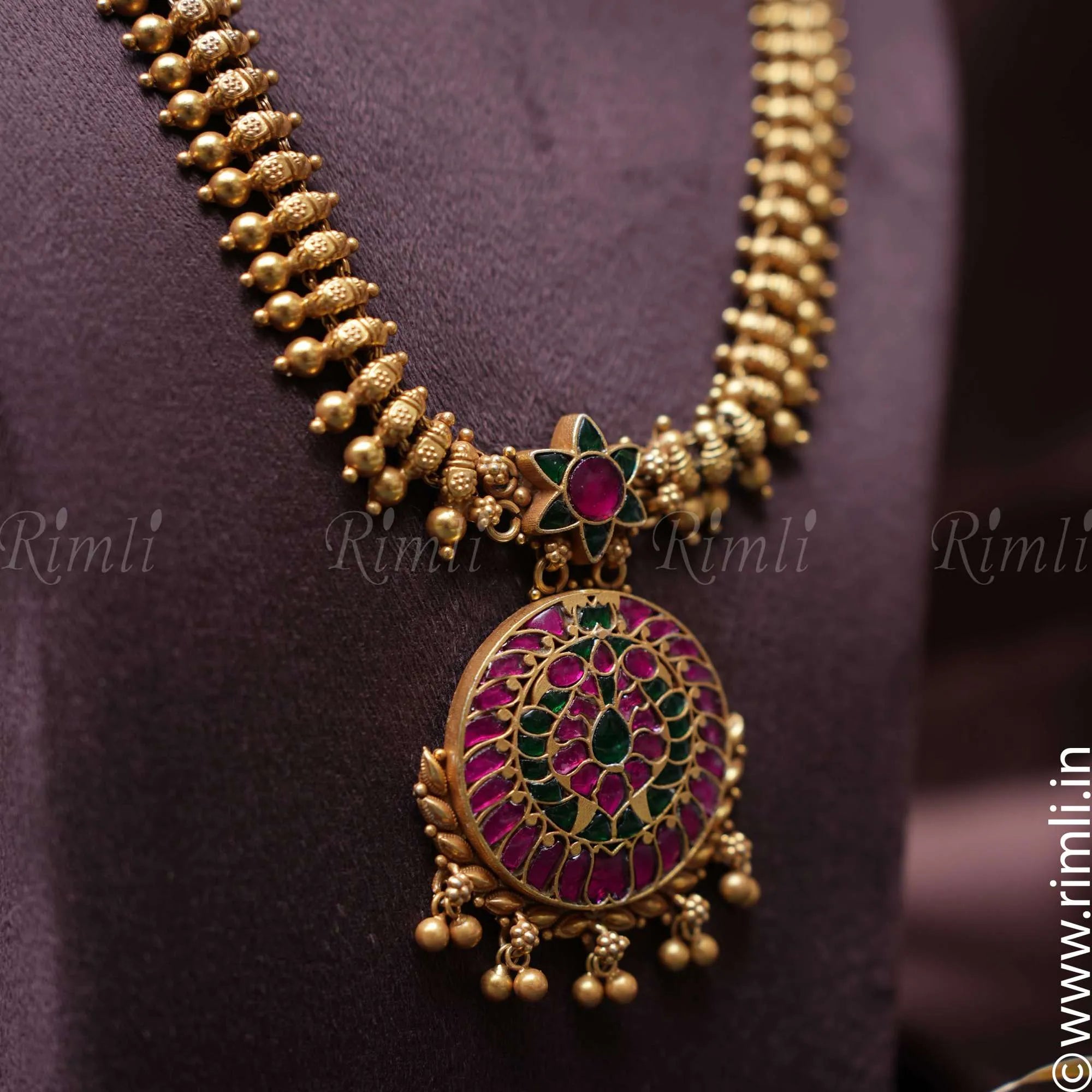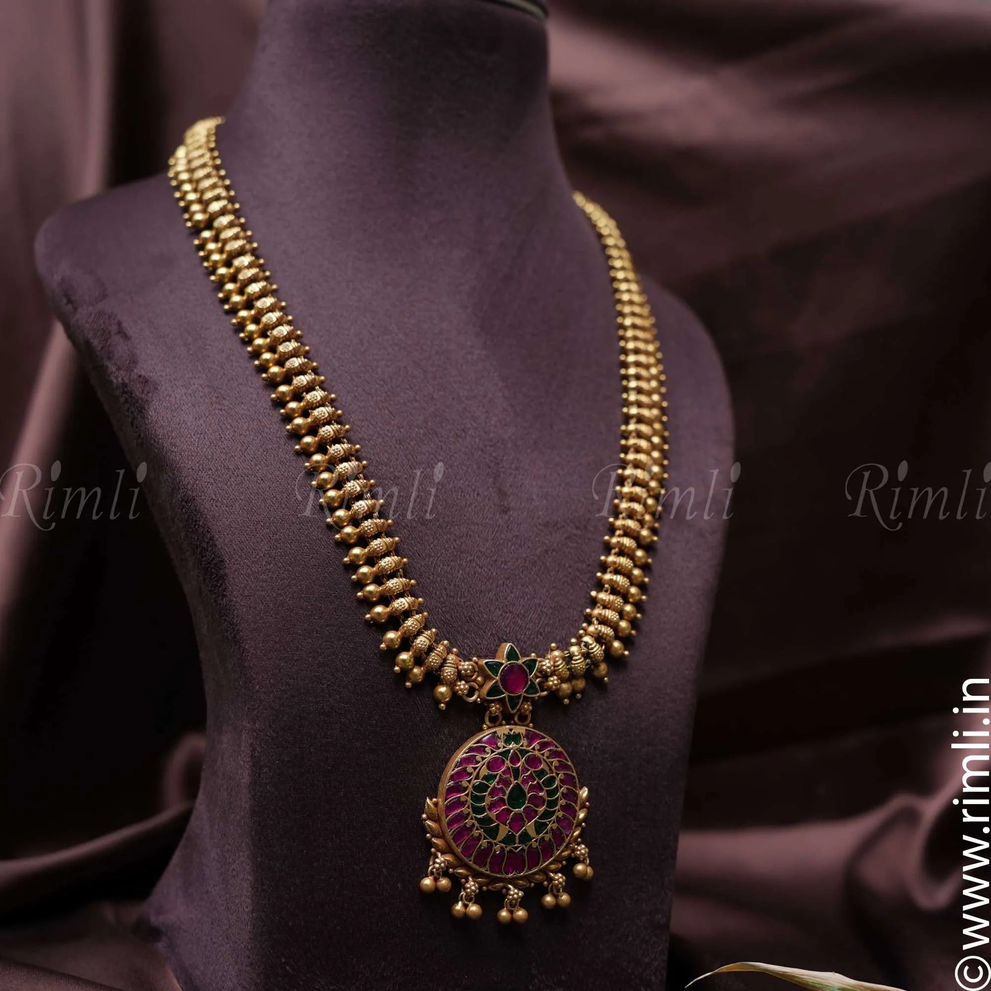 Accentuate your style with a stunning long chain paired with a traditional pendant in 92.5 gold-plated silver. The intricate design and craftsmanship capture timeless beauty, seamlessly blending cultural richness with a modern aesthetic. This exquisite pairing adds a touch of sophistication, making it a standout accessory for any occasion.