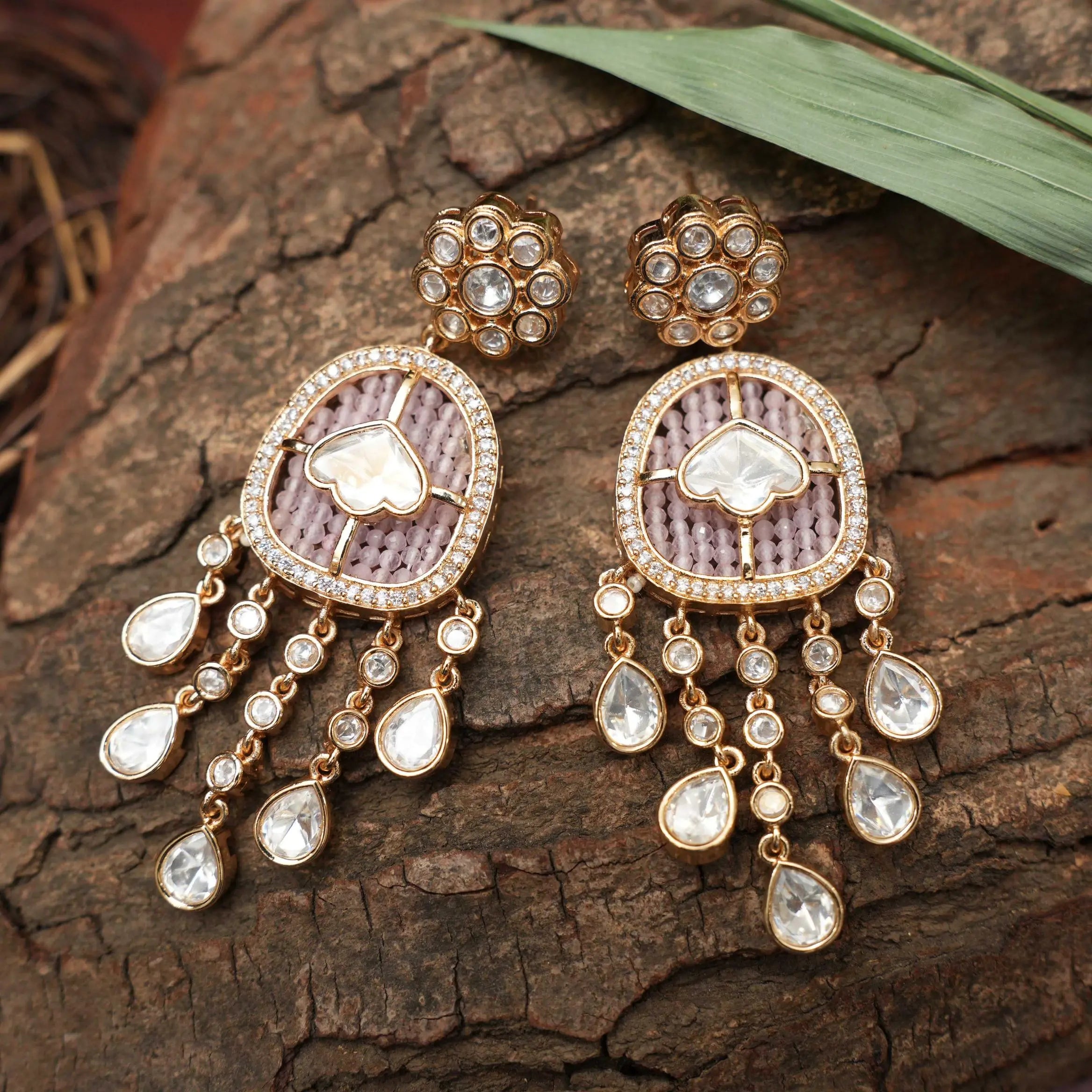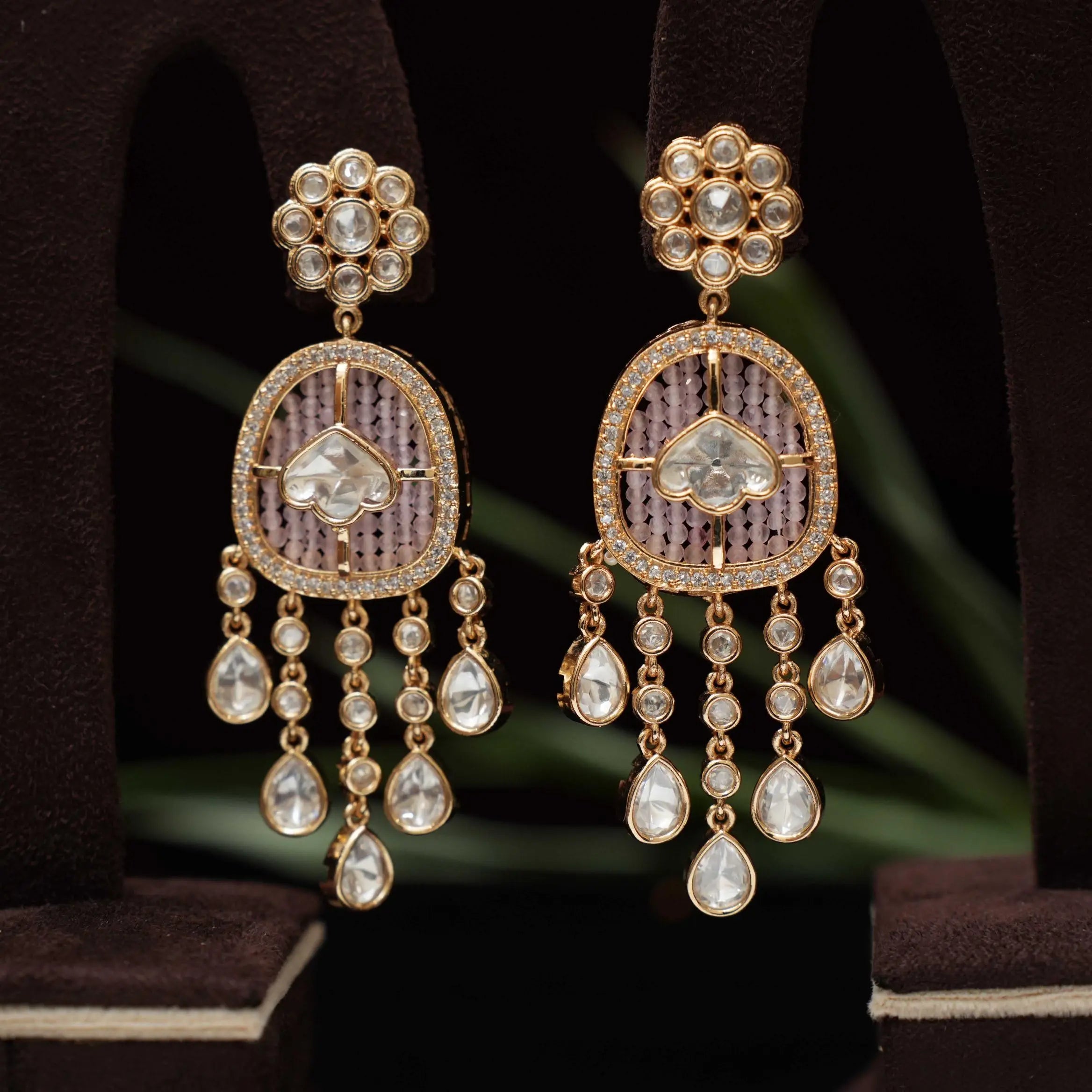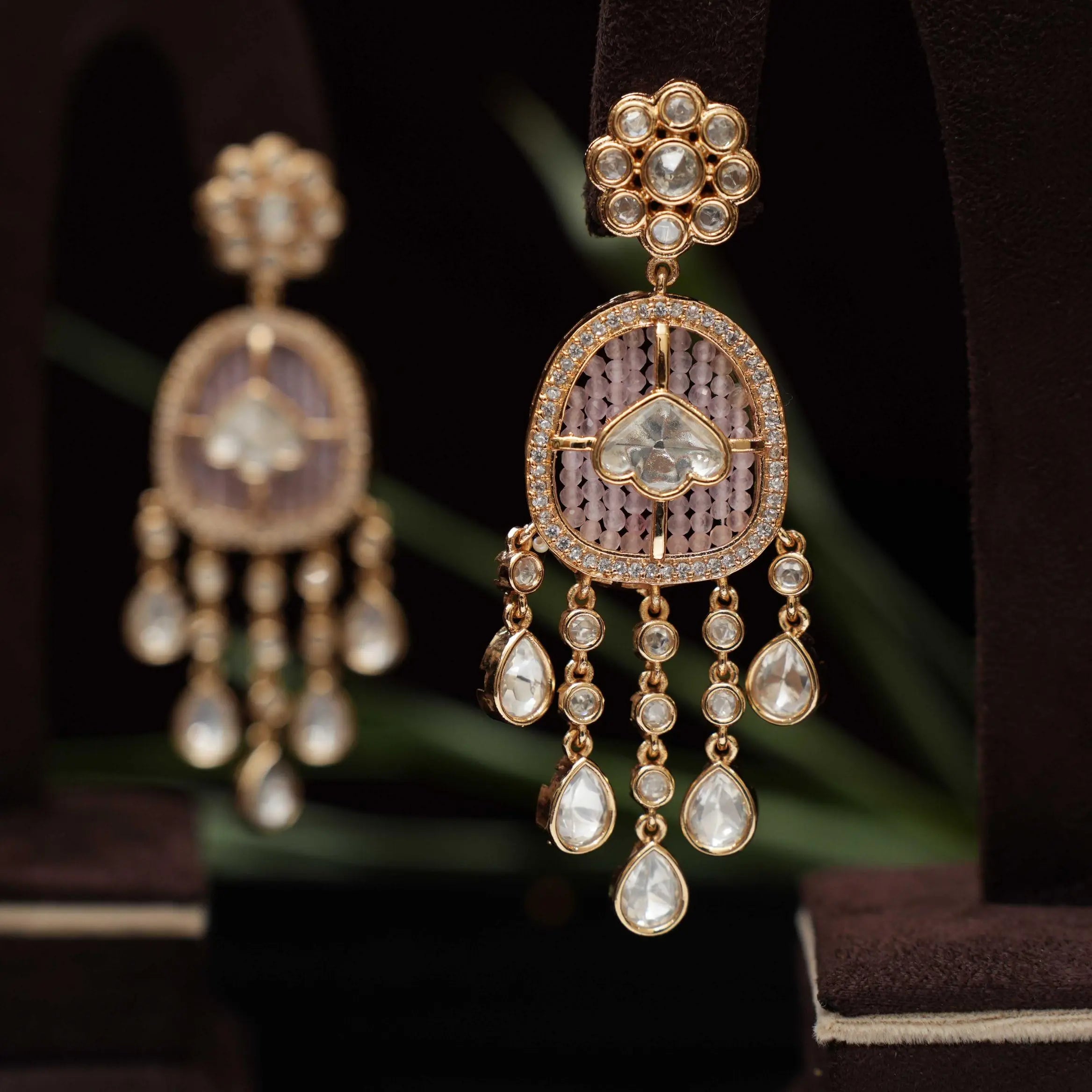 A beautiful statement earrings handcrafted in floral motif studded with polki stones adorn with pastel pink beads.