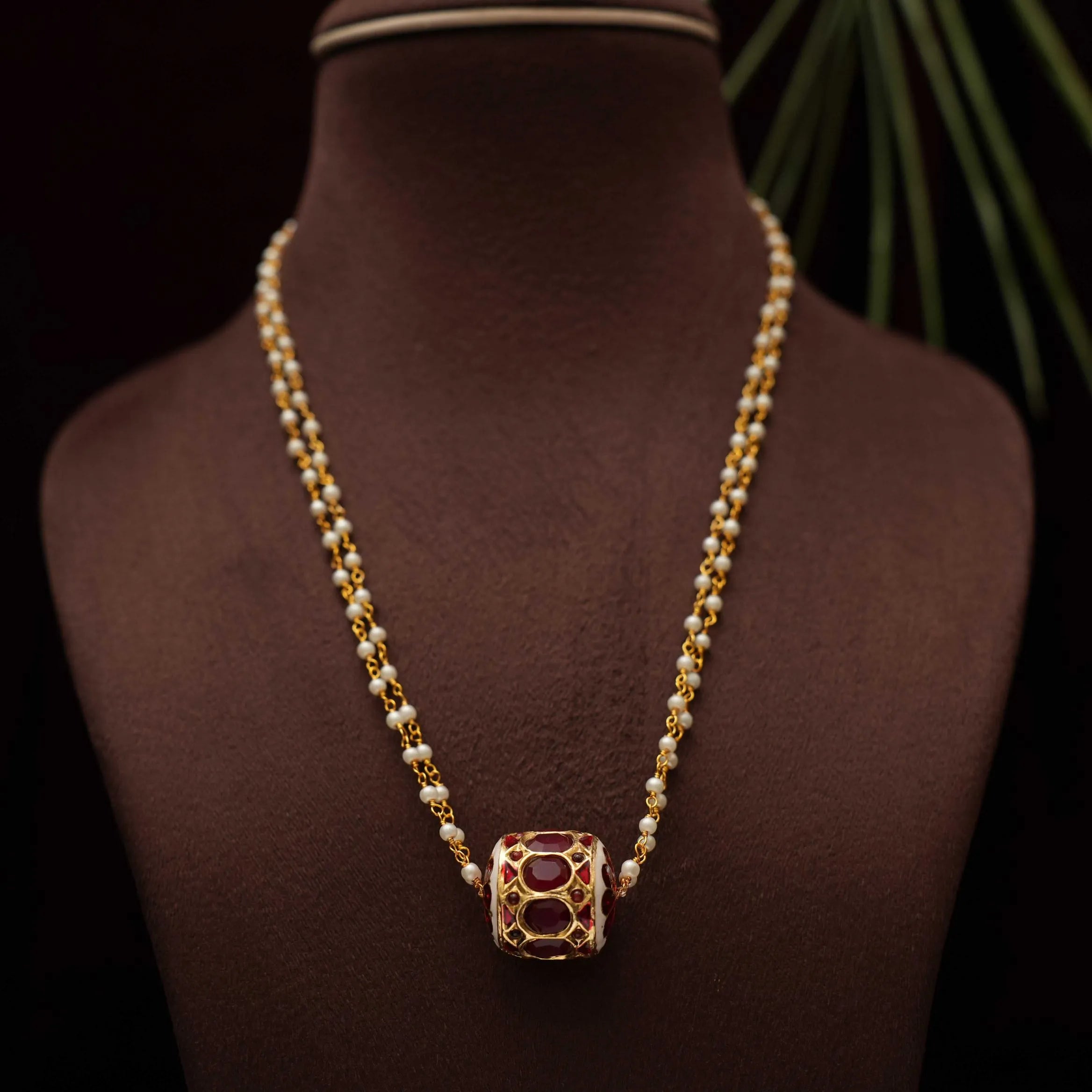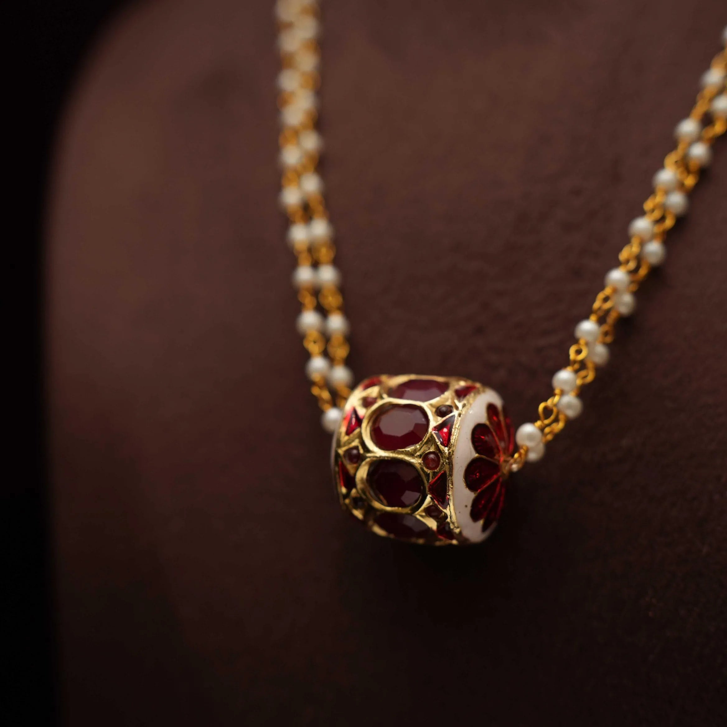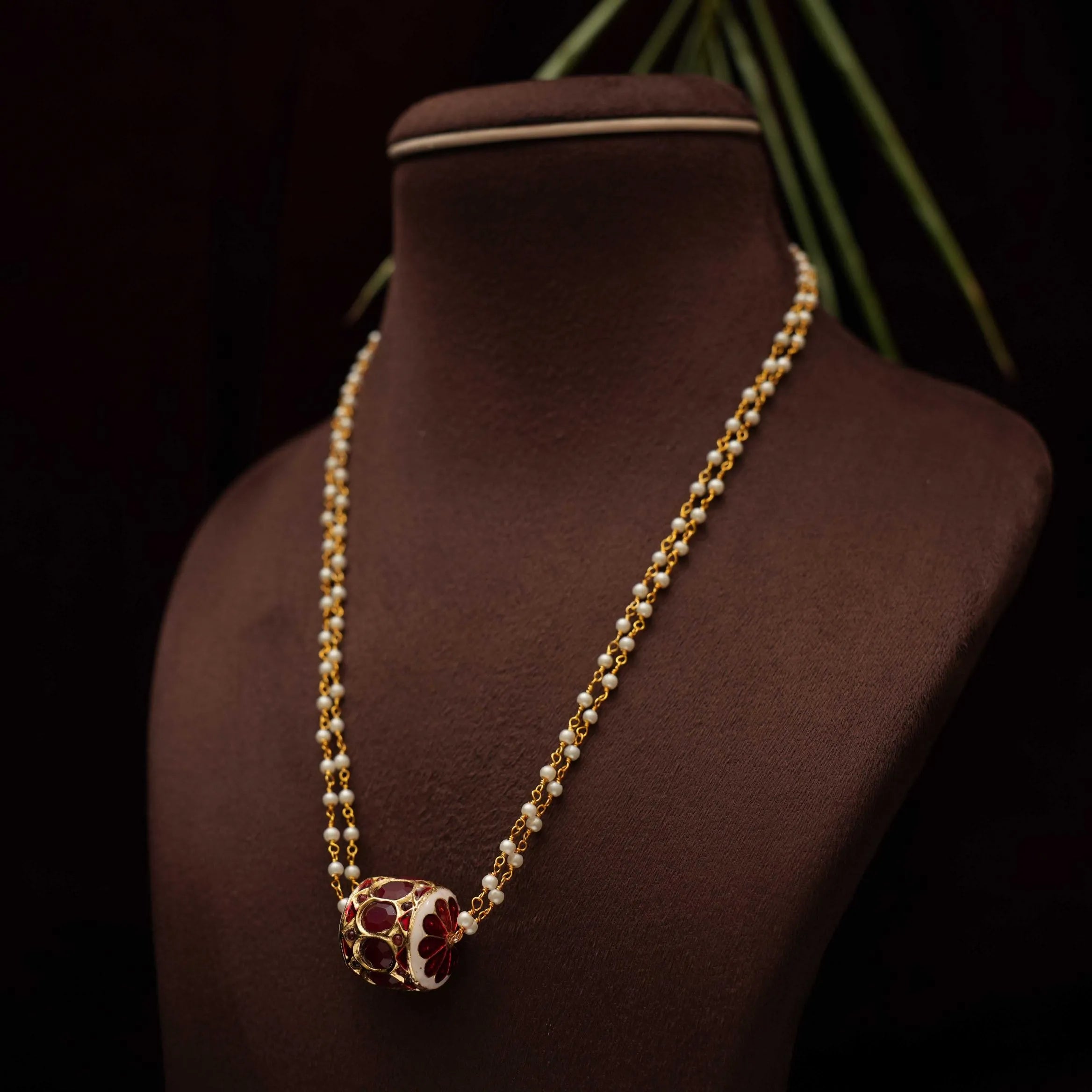 A long & beautiful necklace handcrafted to pearl chain paired to meenakari jadau balls.