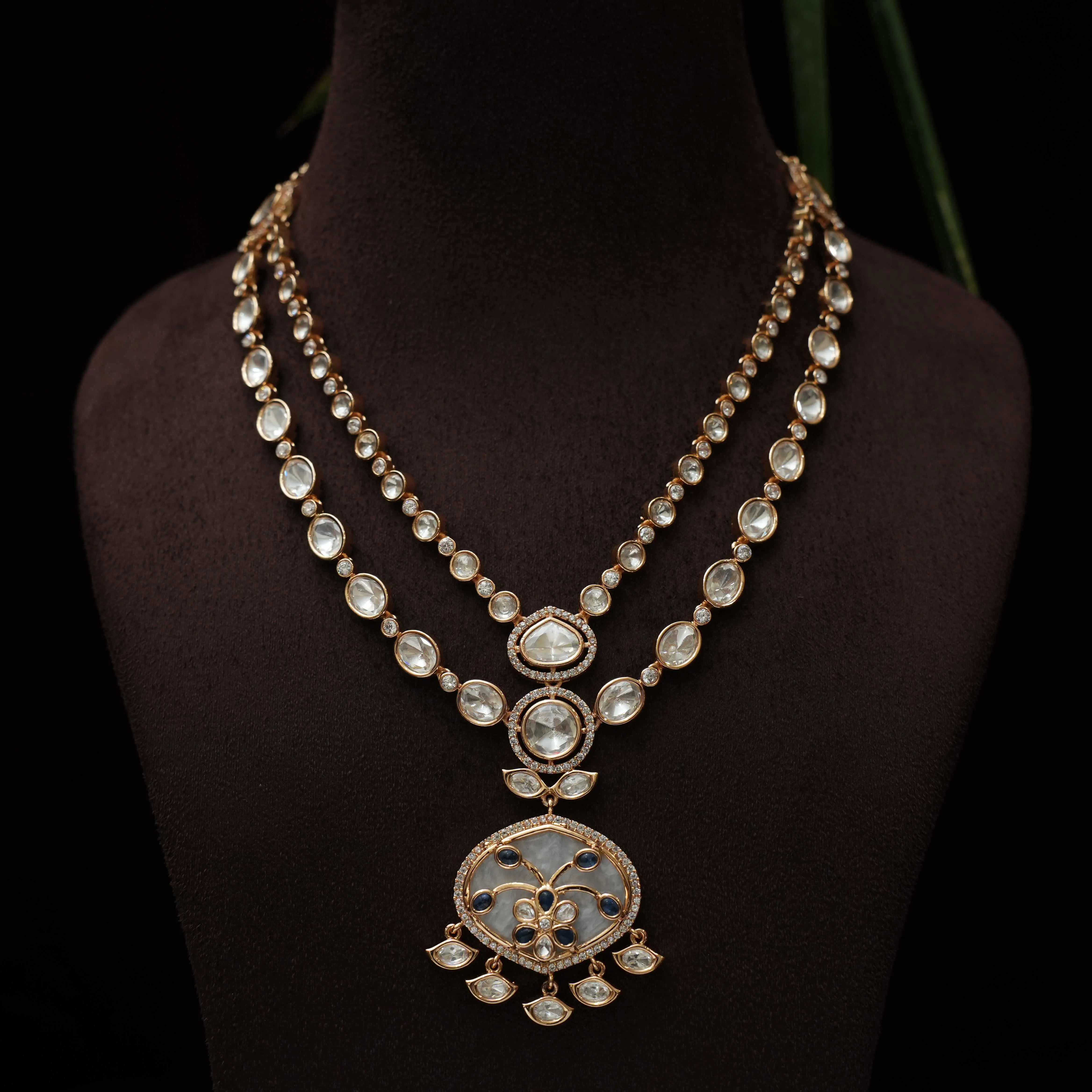 A beautiful and elegant necklace handcrafted with sparkling polki stones, radiating timeless charm and sophistication. Meticulously designed to elevate your traditional or festive look, this stunning set comes with a matching pair of earrings, making it a perfect choice for special occasions.