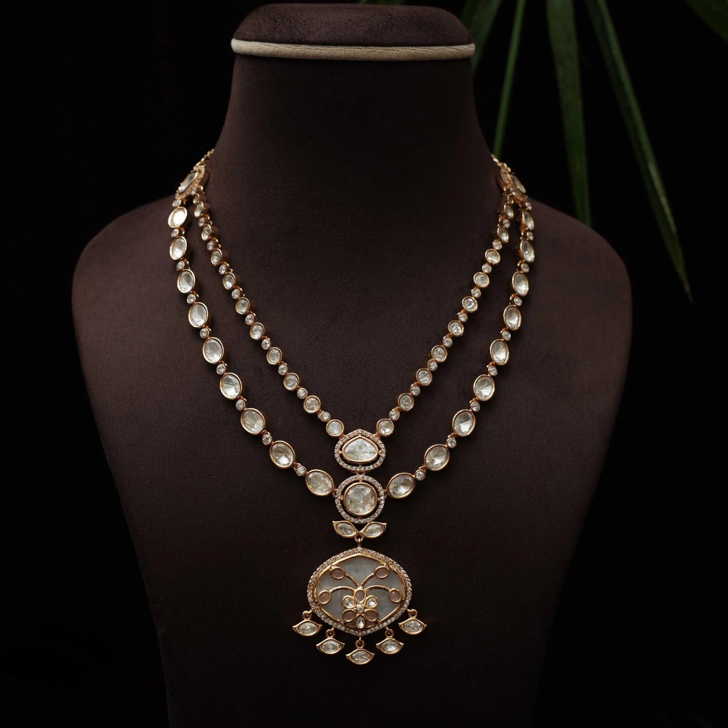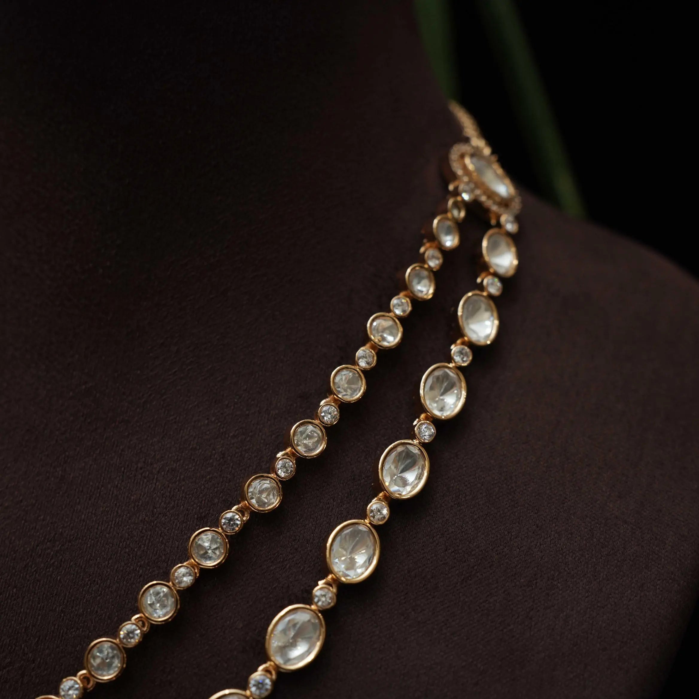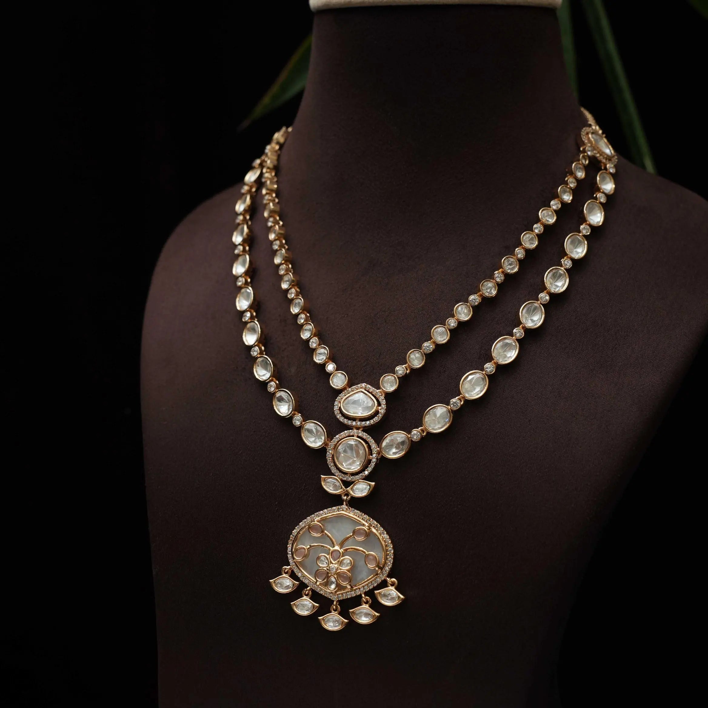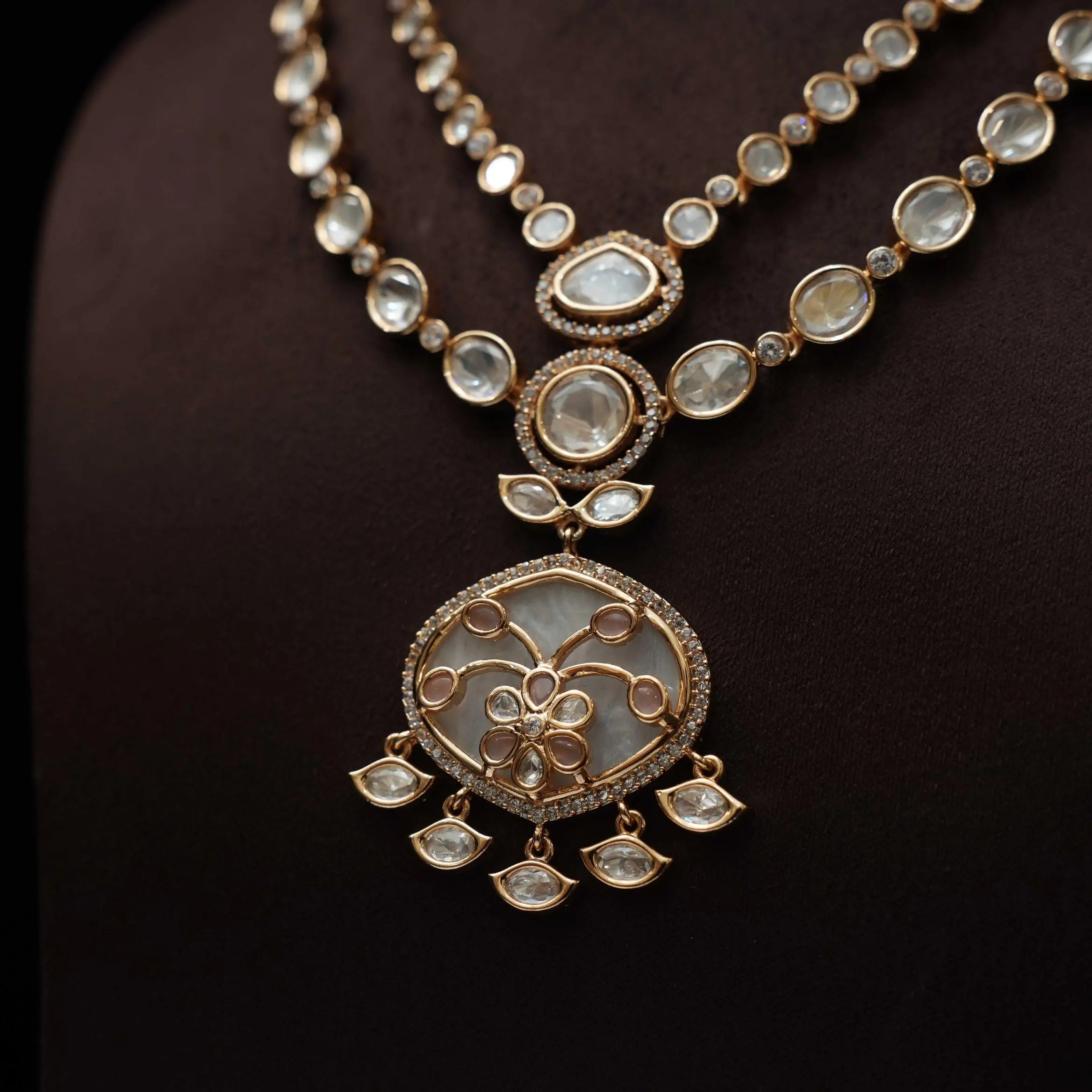 A beautiful and elegant necklace handcrafted with sparkling polki stones, radiating timeless charm and sophistication. Meticulously designed to elevate your traditional or festive look, this stunning set comes with a matching pair of earrings, making it a perfect choice for special occasions.