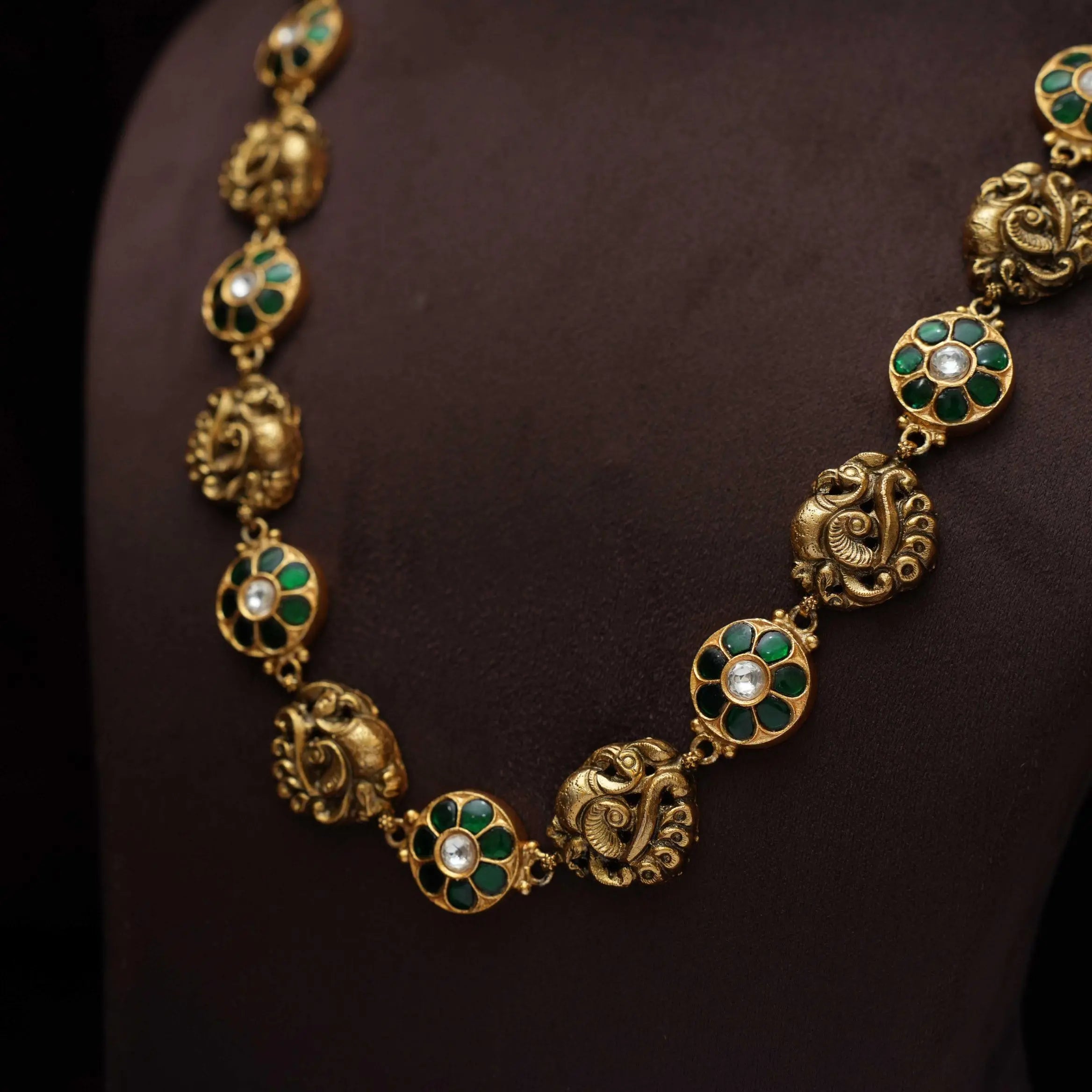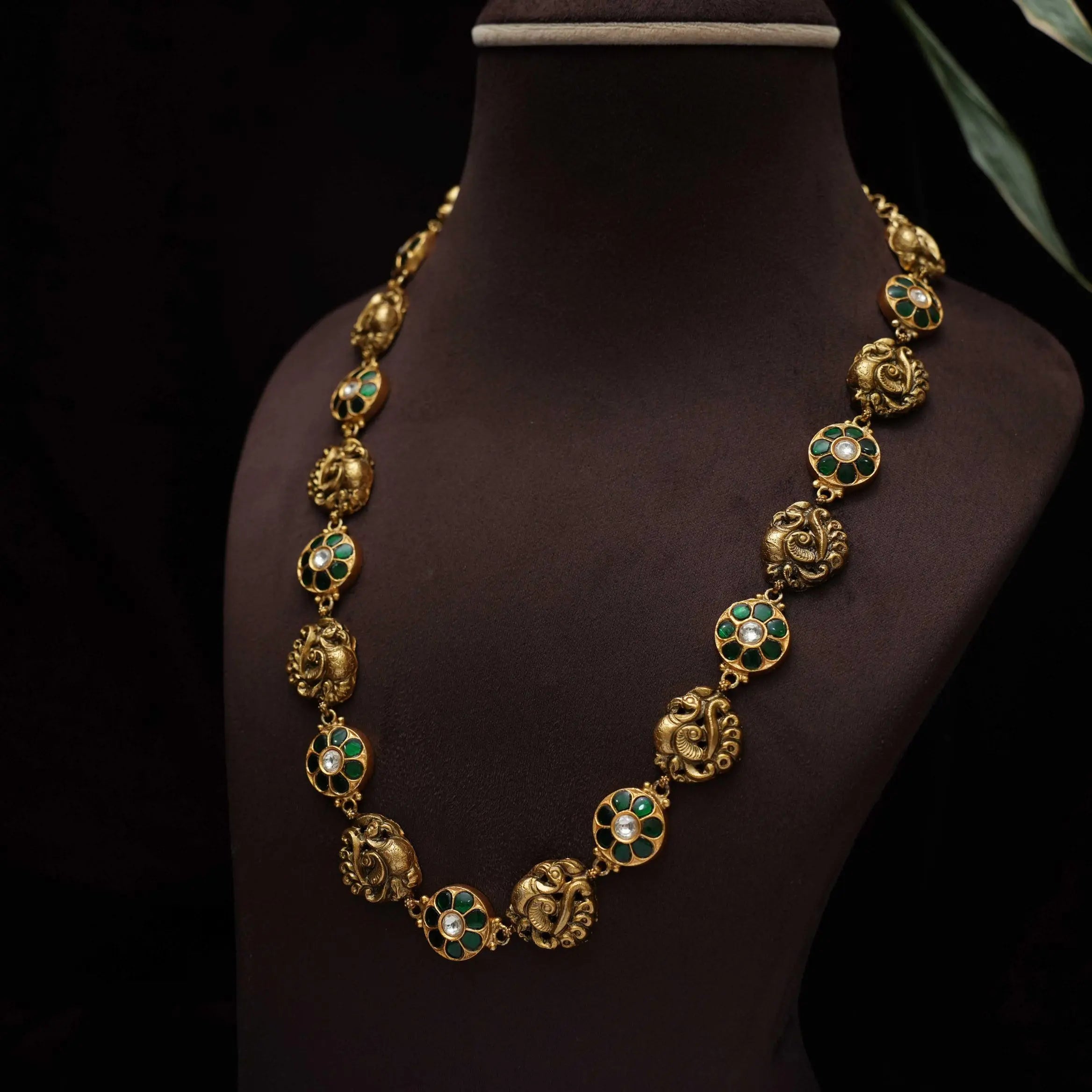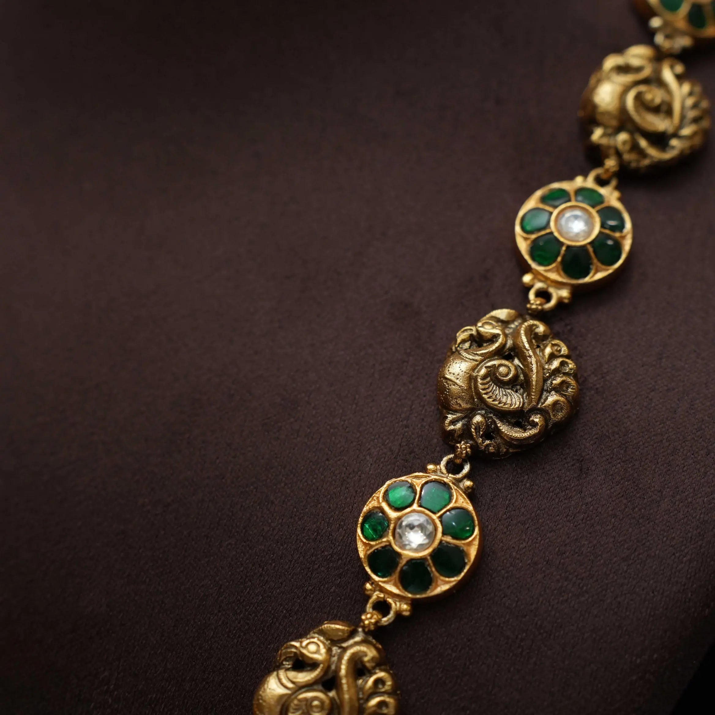Each element showcases exceptional artisanal precision, brought to life with vibrant kemp stones that evoke the richness of South Indian heritage. Finely finished in the distinctive Nagas style, this piece embodies a perfect harmony of tradition and craftsmanship.