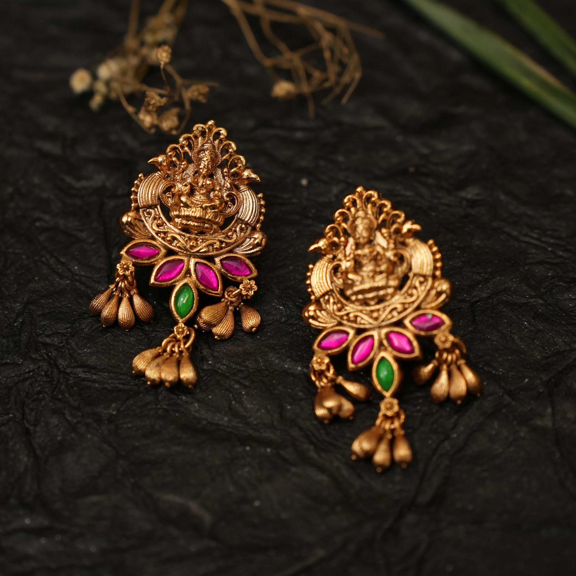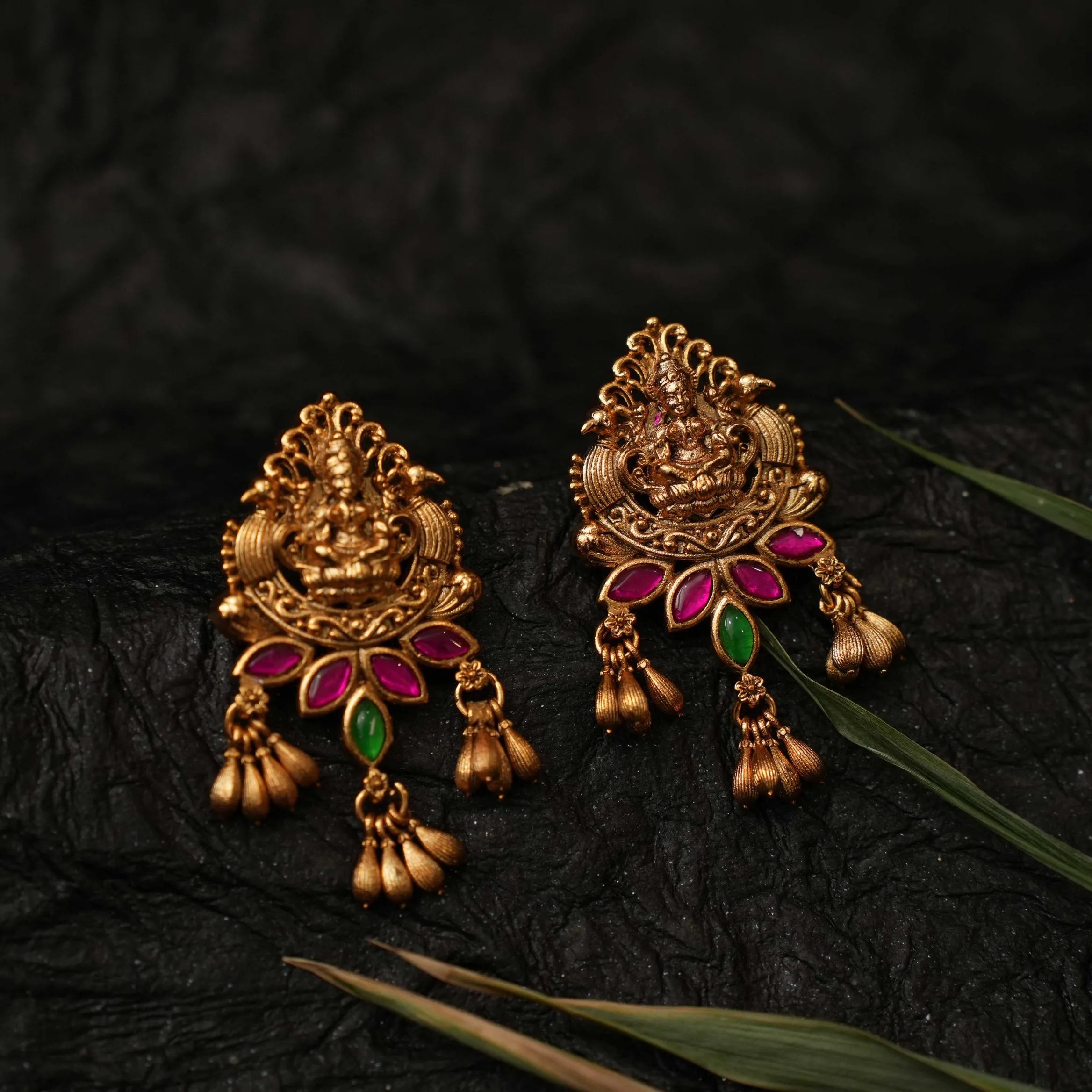A traditional antique earrings in Goddess Lakshmi motif studded with kemp stones and golden balls.