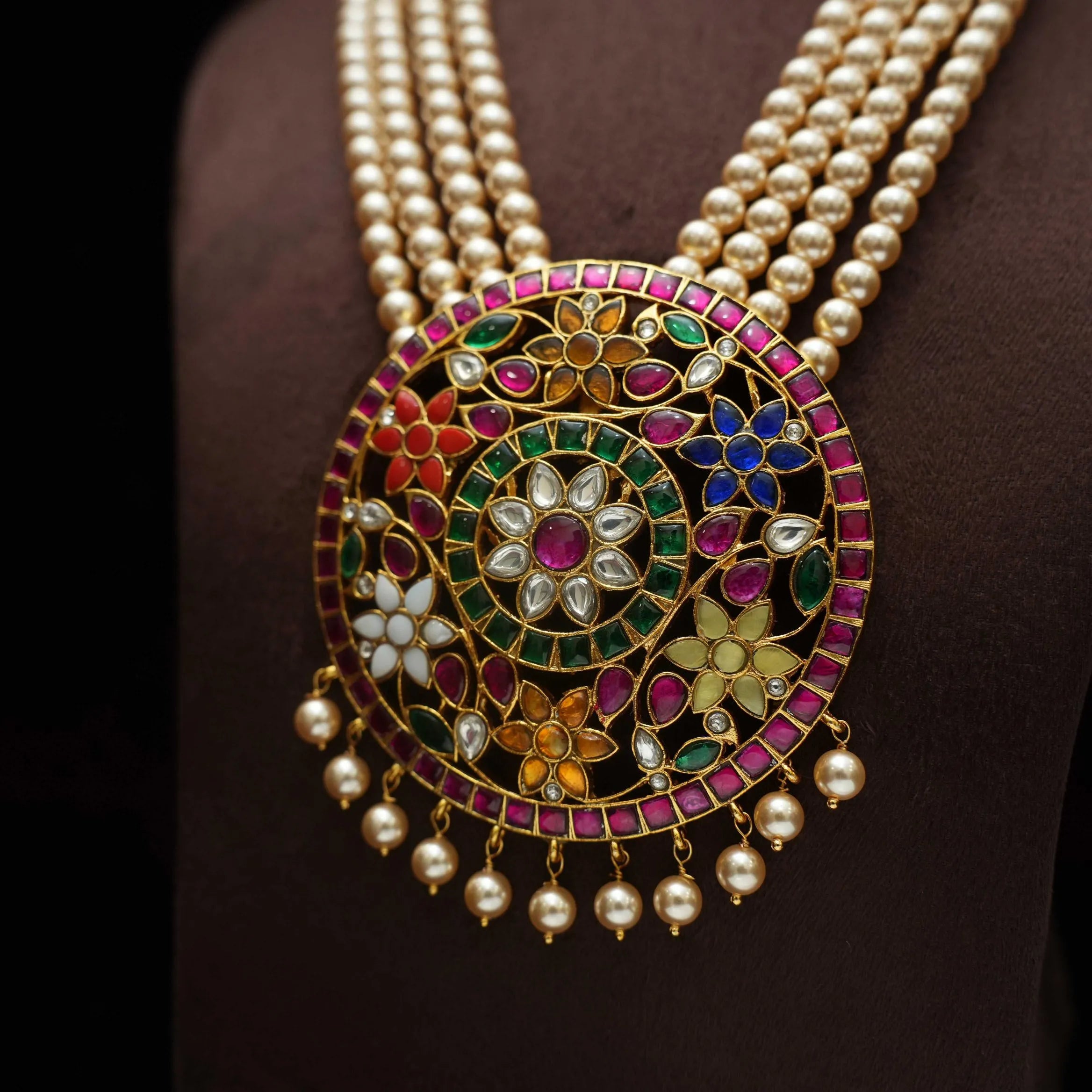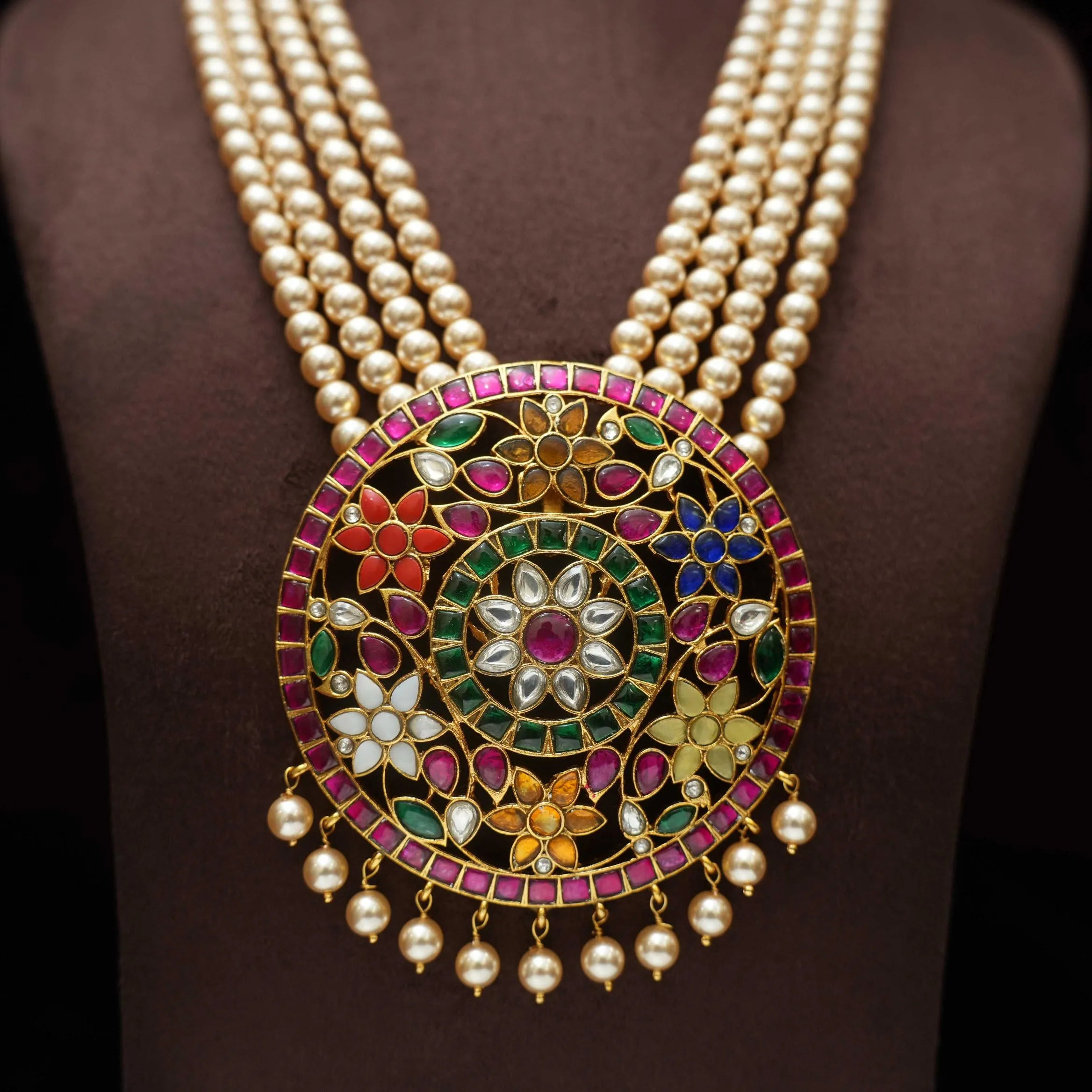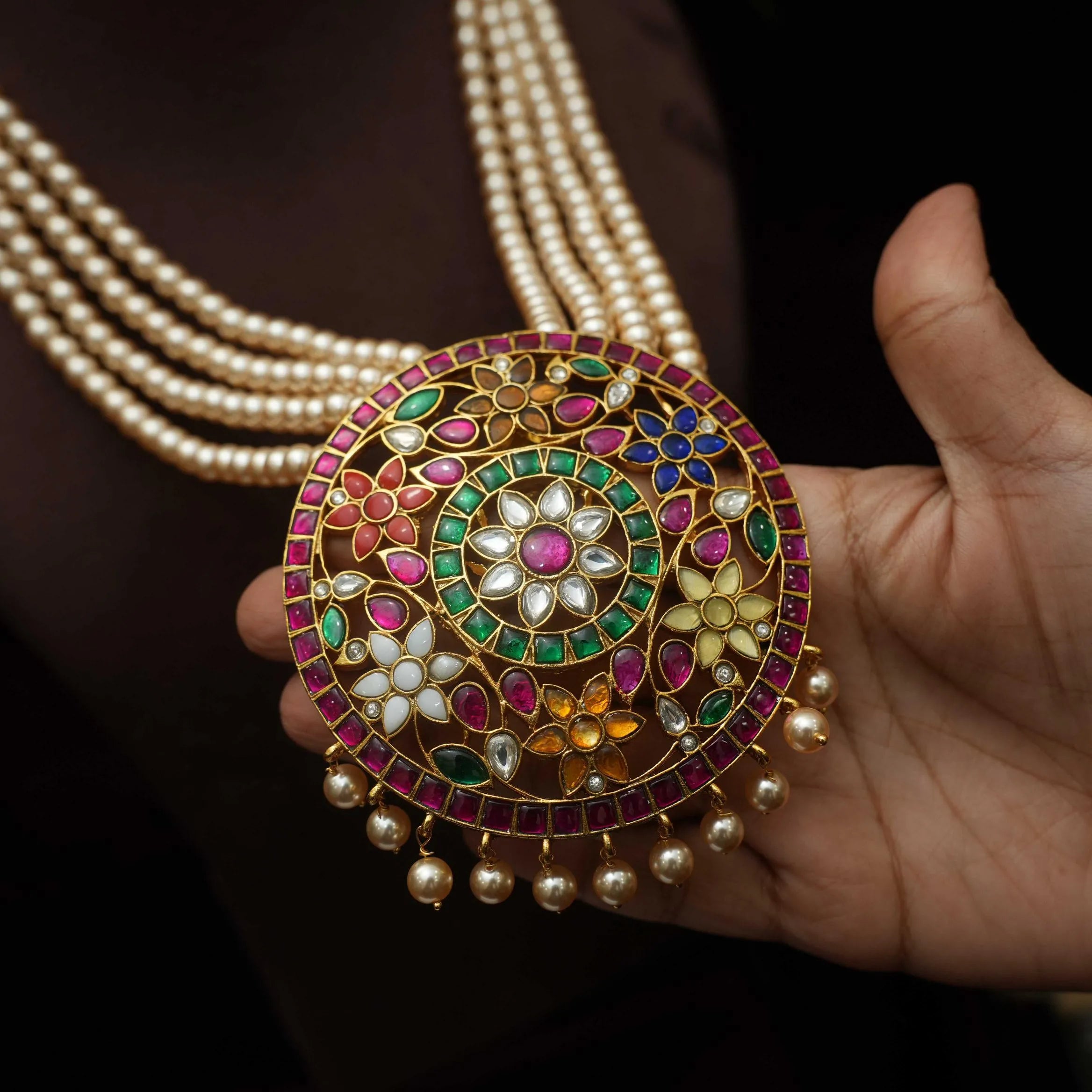 A statement layered necklace handcrafted in pearls paired to polki pendant adorn with pearls.