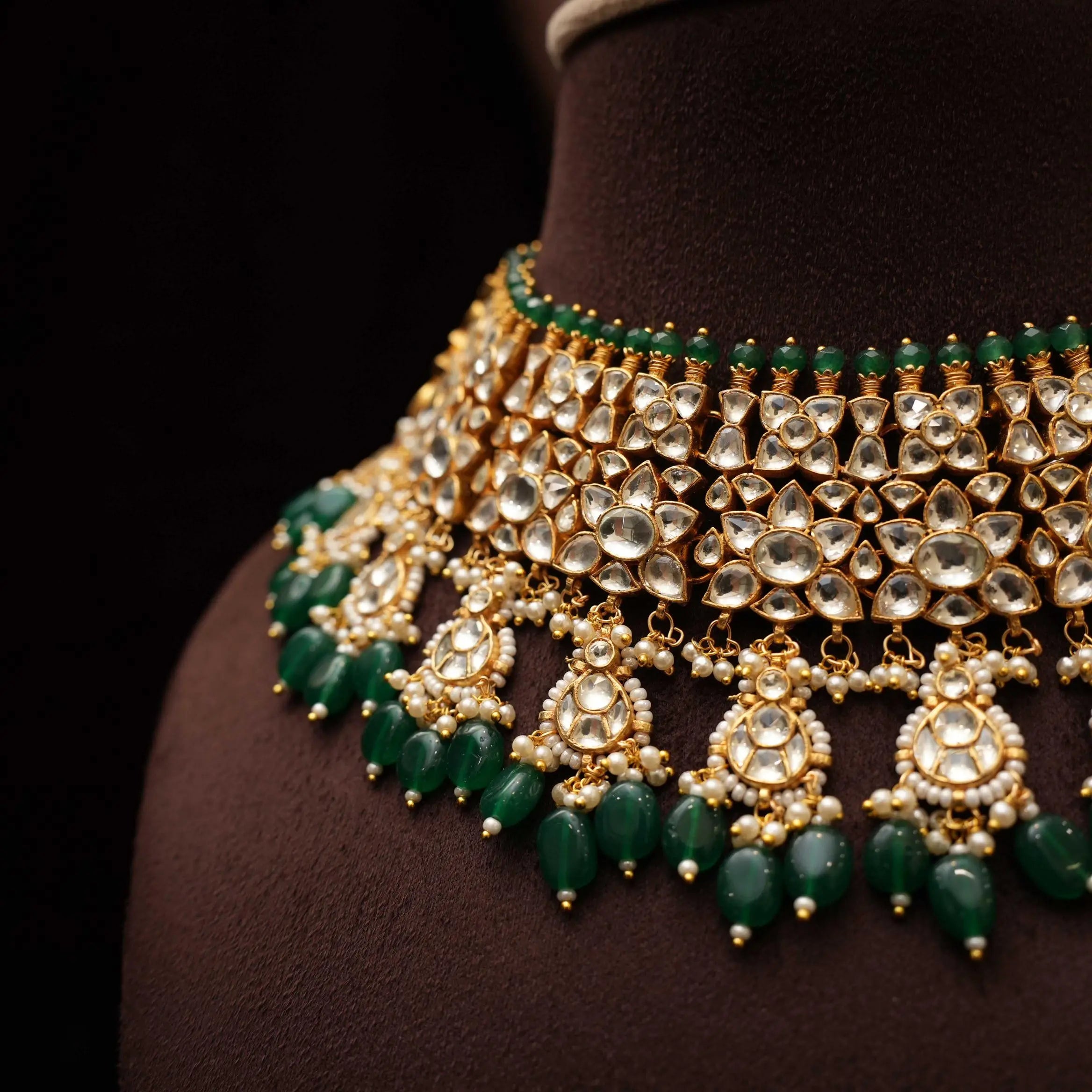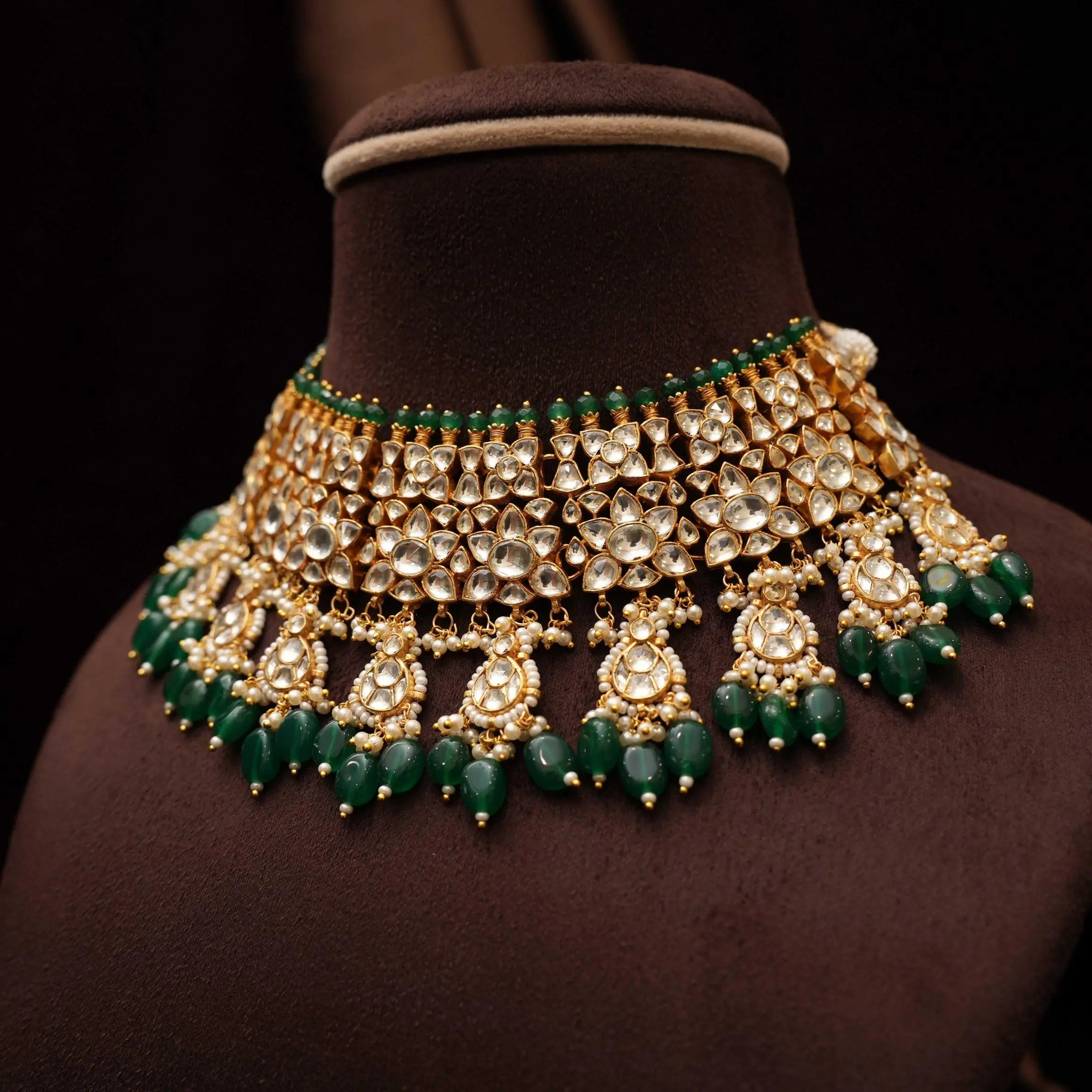 A stunning bridal statement necklace, thoughtfully handcrafted in an elegant floral motif. This exquisite piece is intricately studded with premium-quality Polki stones, enhanced by delicate green beads and lustrous pearls that add richness and depth to the design. Perfectly balancing traditional charm with refined craftsmanship, the necklace is ideal for weddings and grand celebrations.